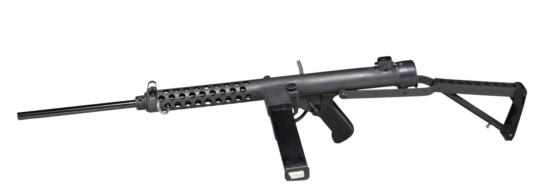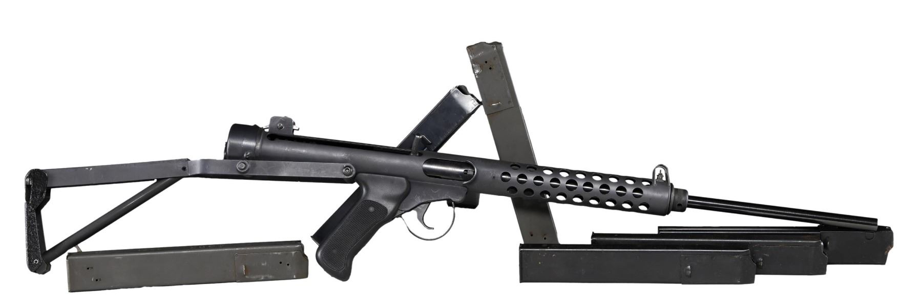 Cal. 9mm. S# 6-0003. Bbl. 16". The P.A.W.S. ZX6 Carbine was manufactured in Salem, Oregon by Bob Imel, who had a long interest in the Sterling design. In 1967, the process was initiated with Sterling to import their L2A3 SMGs into the United States, but the Gun Control Act of 1968 banned their importation for sale to civilians. Moving forward, Imel started the process w/ Sterling, to manufacture them domestically, utilizing their tooling & parts. When the deal had not been consummated by the mid-1970s, Imel founded Police Automatic Weapon Services (P.A.W.S.) & began making them himself. The ZX5 & ZX7 were the first models out, and while very similar to the L2A3 outwardly, he had simplified the trigger mechanism from necessitating 36 moving parts, to needing only 3. A few hundred were made in 9mm & 45ACP, but the National Firearms Act of 1986 would provide another spike in the coffin of domestic machine gun manufacturing. Imel quickly designed a closed-bolt, semiautomatic carbine model w/ a 16.5" barrel & the Model ZX6 was born. It utilized unmodified Sten 9mm magazines. This example exhibits a matte gray finished receiver w/ blued barrel. The shoulder piece of the butt stock still retains that familiar wrinkle style, dark black finish. Barrel retained w/ a barrel nut, similar in fashion to the Uzi style of barrel retention. Protected post front sight. Integral brass deflector. Right side reciprocating charging handle. Left side safety, just rearward of trigger. Windage adjustable protected peep, rear sight. Bottom folding shoulder stock, allowing function in any position, extended or collapsed. MAGS: 5 steel 30 rd & 2 steel 20 rd. Sten mags. CONDITION: Finish coverage complete & consistent w/ only gentle sign of prior use in the form of thinning in areas of mechanical intervention & a few light drag lines. Bore is bright w/ strong rifling. Mag catch may need to be replaced as it only lightly interfaces w/ inserted mag. unless additional pressure is exerted. Fire control mechanism appears to function correctly when cycled by hand. (25-2224/JZ). MODERN. $700-1,000.