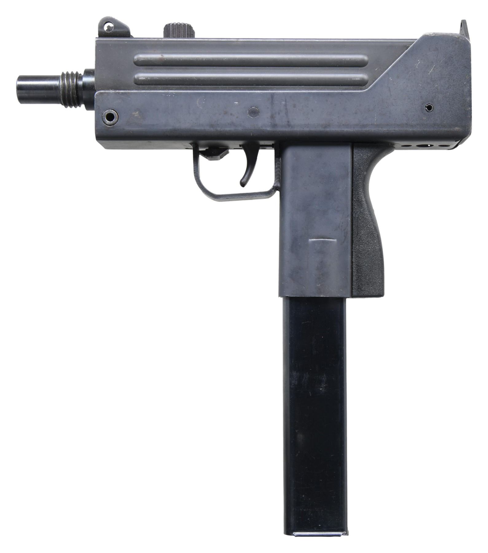 Cal. 45 ACP. S# SAP453099. Bbl. 5.75". The RPB industries M10, often referred to as the Mac 10, was originally offered in semi auto as an open bolt system just like its predecessor the M10 SMG. The BATF determined that the open bolt semi autos met the criteria of a machine gun under the "readily convertible" clause & banned future manufacture, Grand-Fathering those that were assembled on or before June 21, 1982 under ATF ruling 82-8. Like everything else, the Federal Government tells citizens they can not have, interest in the early originals immediately skyrocketed & they have been considered highly prized collectibles for over 40 years now. Barrel threaded w/ traditional threads. Factory protected post front & fixed rear peep sights. Rotating cocking knob locks the action closed as an additional safety. Primary safety located front right side of trigger. Matte black finish on all exposed metal surfaces. MAGS: 1 steel 30 rd. CONDITION: Exterior finish thinning, as common w/ these pistols, having seen some range use over the last 4 decades. Some thinning in areas of mechanical intervention & high spots. Scattered patina visible under close inspection. Bright bore w/ strong rifling. Fire control mechanism appears to function correctly when cycled by hand. PROVENANCE: Lifelong Collection of Terrance McCarty. (24-276/JZ). MODERN. $500-900.