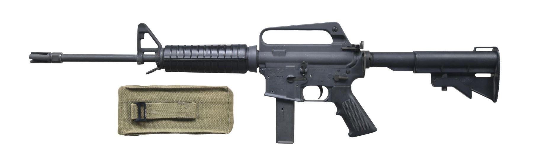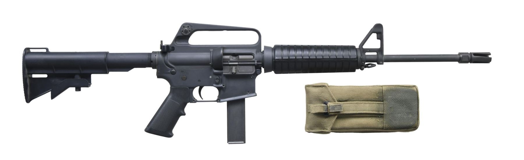 WITH 3 COLT MAGS. Cal. 9mm. S# NL000783. Bbl. 16", threaded, currently sporting Vortex-style flash hider, marked: C MP CHROME BORE 9MM NATO". Protected post front sight / gas block. Shaved bayonet lug. Carbine length A2 handguards, retained w/ tapered delta ring. Carry handle upper receiver w/ dual aperture rear peep sight & 9mm brass deflector. 9mm mag adapter factory retained w/ 3 roll pins. Lower receiver has factory block. 9mm M16 profile bolt carrier. 4 position, plastic collapsible shoulder stock. Black plastic pistol grip. Ambidextrous charging handle. Left side single point sling swivel. MAGS: (3 total) 2 Colt 32 rd & 1 Colt 20 rd. UNATTACHED ACCESSORIES: Tan canvas 3-mag pouch. CONDITION: Finish complete & consistent w/ only a few tiny areas of thinning & drag lines typically associated w/ rack storage. Bright bore w/ strong rifling. Fire control mechanism appears to function correctly when cycled by hand. (25-2278/JZ). MODERN. $800-1,200.