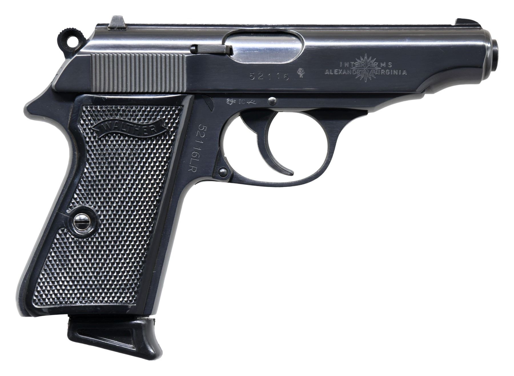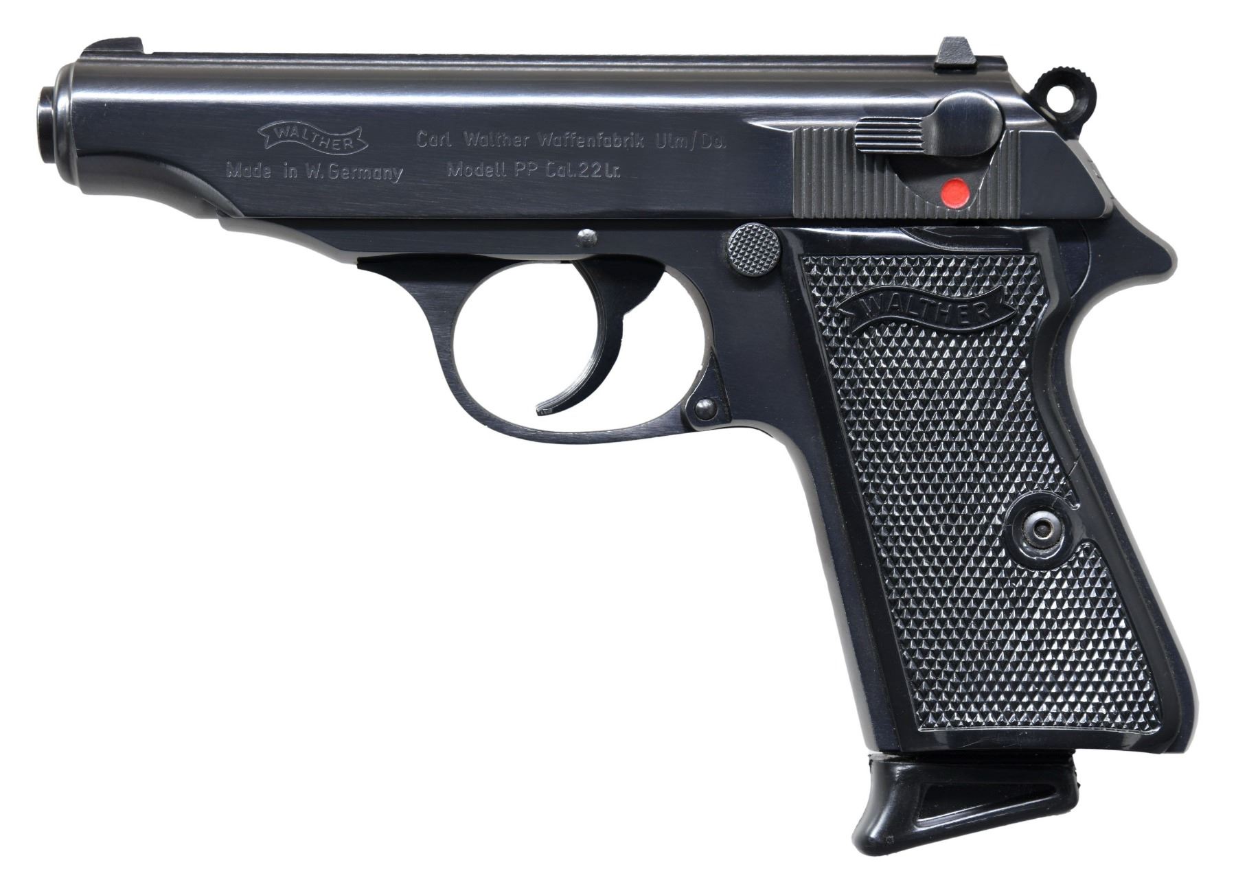 SEMI-AUTOMATIC PISTOL WITH SOFT CASE. Cal. 22 LR. S# 52116LR. Bbl. 3 7/8". Model PP semi-automatic pistol chambered in .22 LR mfg. in West Germany by Walther and imported by Interarms in 1982. The left side of the slide is marked with the Walther banner logo above "Made in W. Germany", followed by Walther's mfg. information, as well as the model and cal. designations, with the Interarms' import mark present on the right. Right side of the frame is marked with a German Eagle/N commercial nitro proof (also present on right side of slide and bbl.), followed by an "IC" (82) date code, and an Ulm Proof House antler. Metal components exhibit a polished blue finish overall, save for on the chamber area, which is polished in-the-white. Frame is mounted with 2-piece Walther banner checkered black synthetic grips. Slide features a grooved rib, with a fixed blade front sight and dovetailed square notch rear sight. All serialized parts are matching and include the frame and slide. MAGS: 1 blued 10-rd., with black synthetic grip extension. UNATTACHED ACCESSORIES: generic black leather soft case. CONDITION: excellent, with metal components retaining bountiful amounts of their original factory blue finish overall, exhibiting some light superficial marks from handling and storage. Brilliant mirror bore, exhibiting well defined rifling throughout. Grips show some light superficial handling marks, with each panel exhibiting a crack that stems from the grip screw slot to the rear of the grip. PROVENANCE: From the Estate of Jon Thomas, Gunsport, LTD. (25-1134/MLW). MODERN. $500-750.
