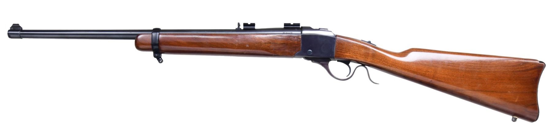SHOT CARBINE. Cal. 22 Hornet. S# 130-53171. Mfg. 1974 with the 22" bbl. According to "Reference of Ruger Firearms, Volume Two" (Third Revision), only 1 other 22 Hornet No. 3 Carbine mfg. in this known S# range (130-51947 to 130-54578) without the factory Liberty or Warning marks; S# 130-53672 is the other number. The 22" bbl. is fitted w/ Weaver bases. Blue finish. Band mounted gold bead front sight & Lyman type adj. folding leaf rear sight. Smooth walnut forearm with barrel band; has added sling stud. Springfield style straight grip walnut stock w/ added sling stud & aluminum buttplate. CONDITION: Near excellent blued finish. Frame has faded giving a plum tone. Repair cracks on left side forearm and both side of wrist; balance of wood finish very good. The bore is bright with strong rifling. (23-6363/MD). CURIO. $400-600.