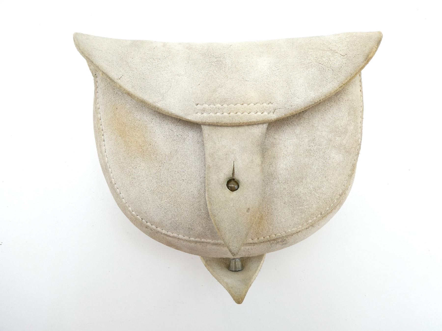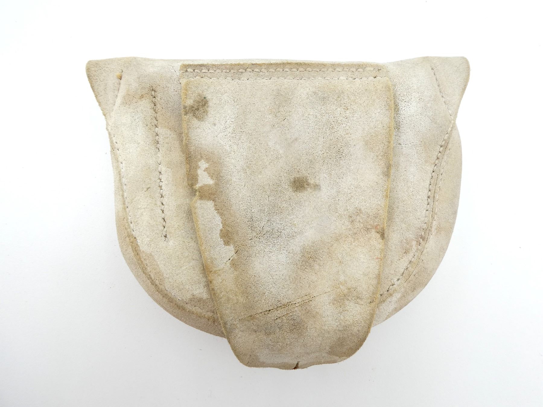 (1) WHITE BUFF LEATHER AMMO POUCH, FITS 1858 PATTERN ENFIELD SNIDER / MARTINI HENRY AMMO, UNDER BELT LOOP MARKED: BROAD ARROW OVER "WD", WIDE SINGLE BELT LOOP, BRASS FITTINGS, LEATHER IS STIFF, SHOWS AGE / WEAR. SEE PHOTOS.