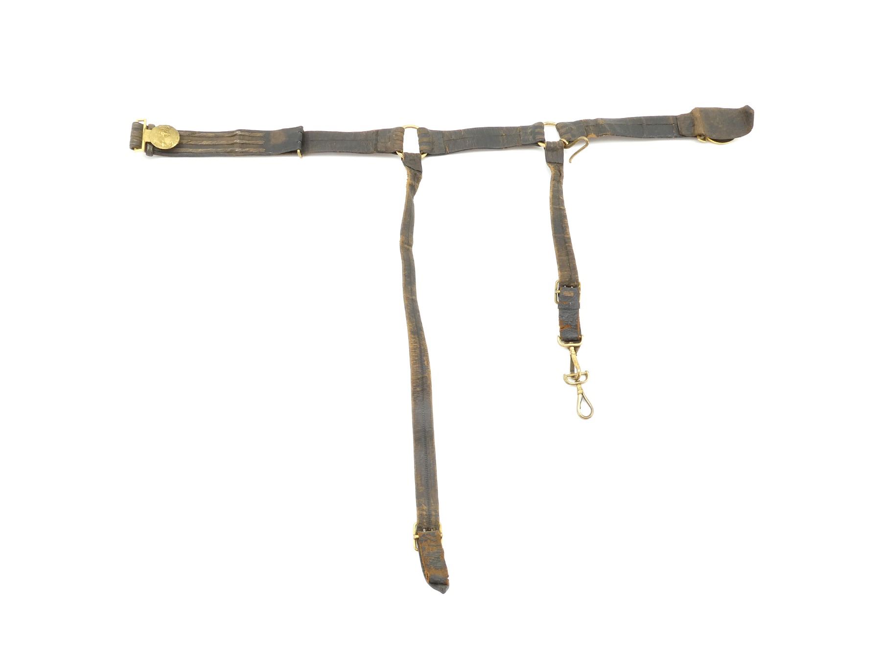 (1) BLACK LEATHER BELT WITH THREE LINES OF WIRE ON LEATHER, LEATHER IS SOFT, BRASS BELT BUCKLE WITH WREATH SURROUNDING VICTORIAN CROWN OVER ANCHOR, VARIOUS BRASS FITTINGS, NO VISIBLE MARKINGS ON LEATHER / BRASS, WITH SWORD HANGER STRAPS, SHOWS AGE / WEAR / TEAR, OVERALL LENGTH APPROX. 34", ADJUSTABLE. SEE PHOTOS.