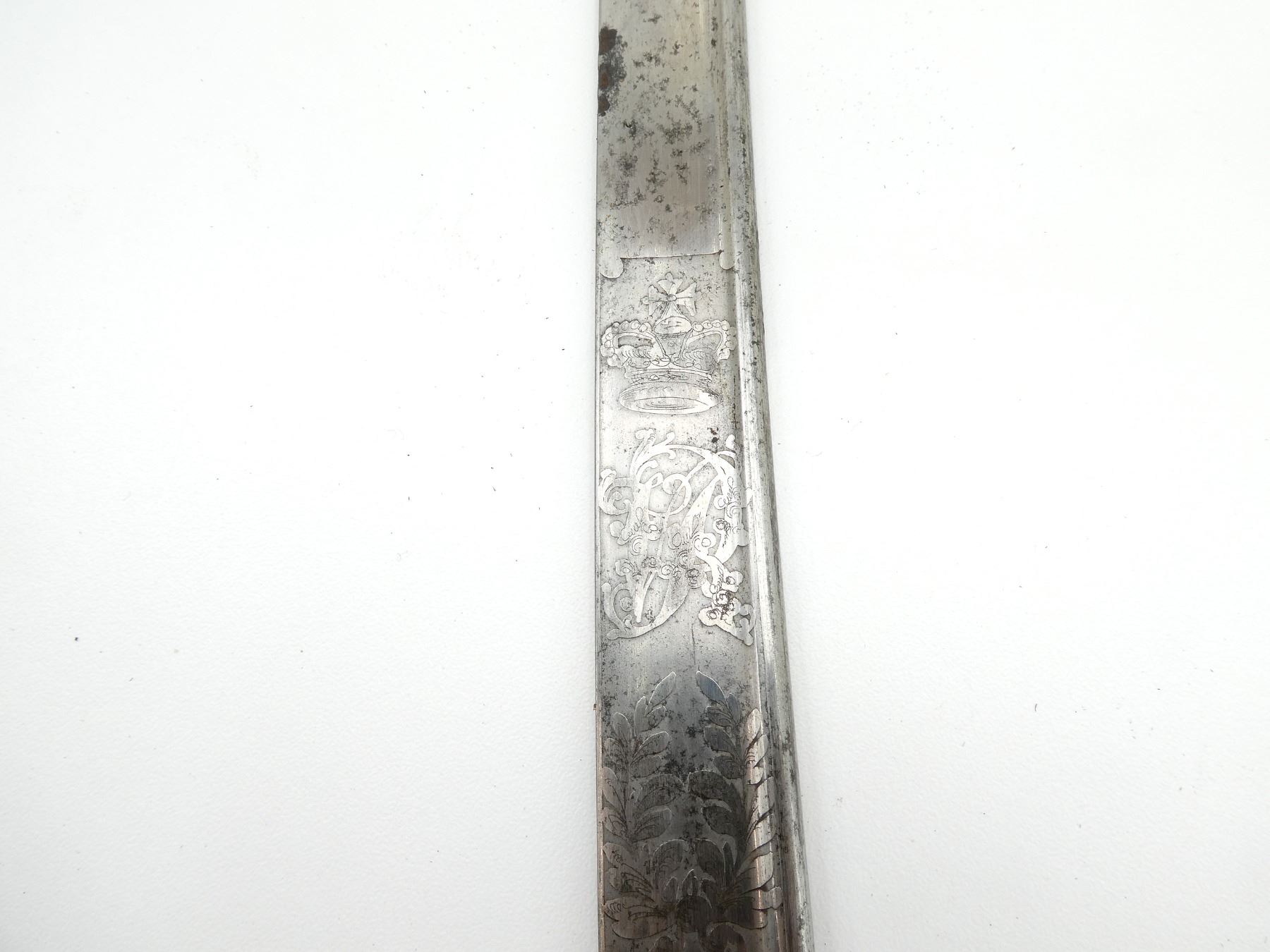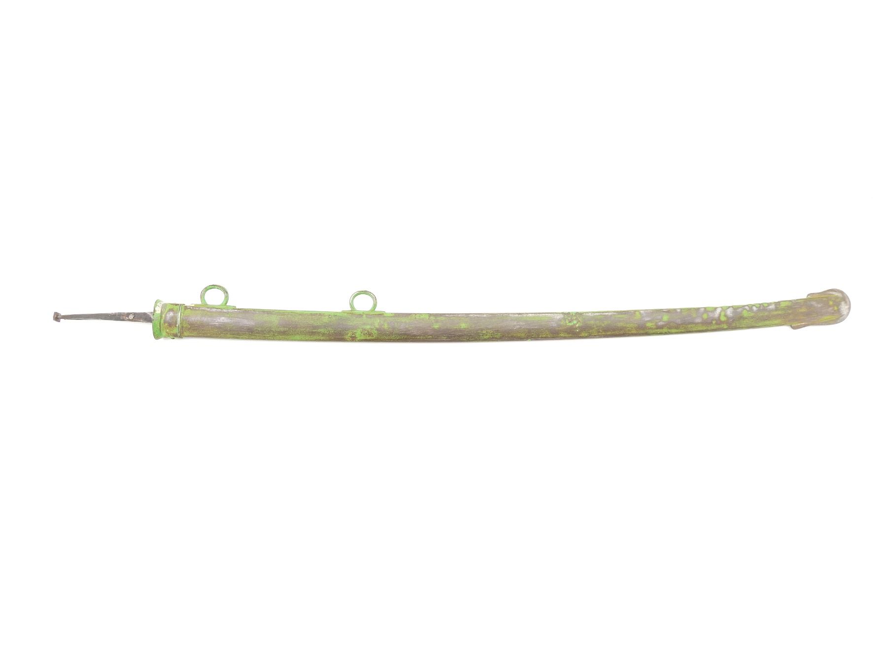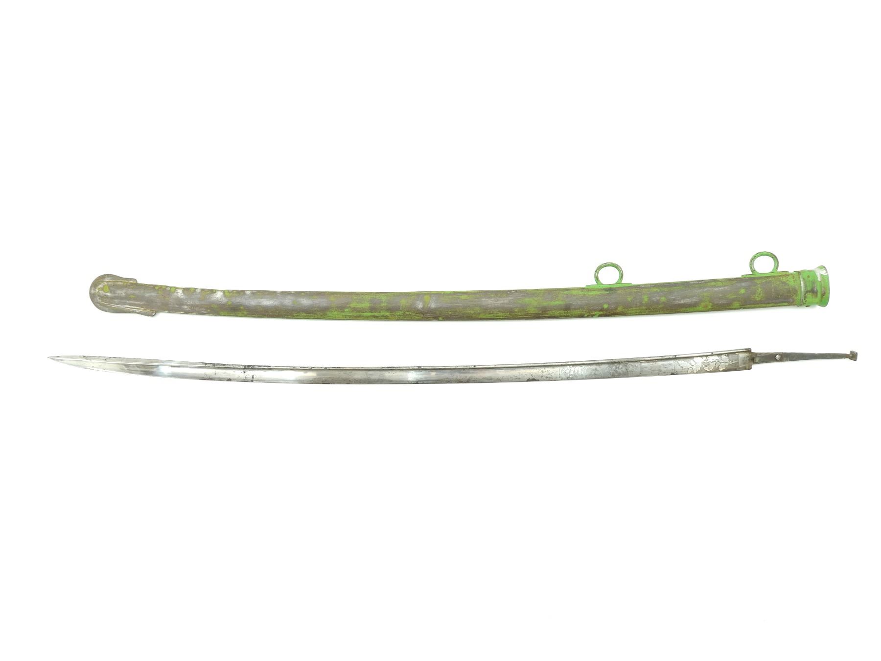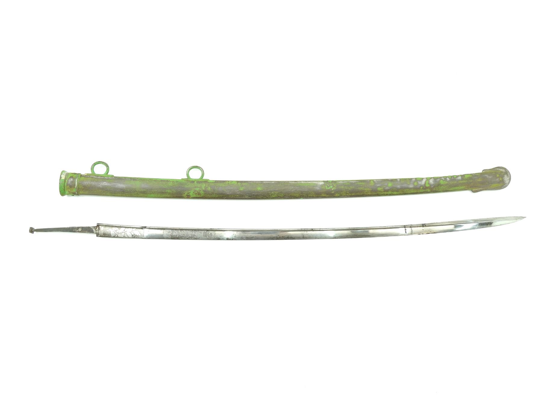 (1) MISSING CROSS-PIECE / HAND-GUARD / HILT / GRIPS / POMMEL, BLADE ONLY WITH SCABBARD, SLIGHTLY CURVED BLADE WITH DOUBLE-EDGED TIP, BLADE ACID ETCHED: VICTORIAN CROWN OVER "VR" CYPHER WITH VARIOUS DECORATIVE FLORAL DESIGNS ON EITHER SIDE, NO VISIBLE MAKER'S MARKS, NO VISIBLE PROOF MARKS, GREEN PAINTED STEEL SCABBARD WITH TWO HANGER LOOPS, NO VISIBLE MARKINGS, BLADE APPROX. 32 3/8" & WITH TANG OVERALL LENGTH APPROX. 37 3/8". SEE PHOTOS.