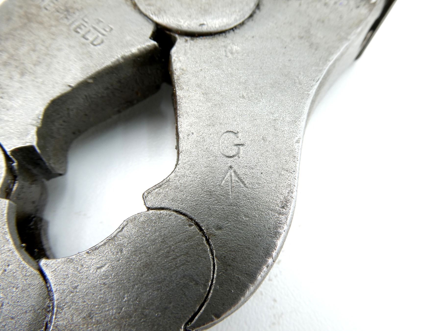 (1) PAIR OF STEEL WIRE CUTTERS, MARKED: "FOR MUSIC WIRE", "H.E.CO.LTD, SHEFFIELD" & "G" OVER BROAD ARROW, OVERALL LENGTH APPROX. 7". SEE PHOTOS.