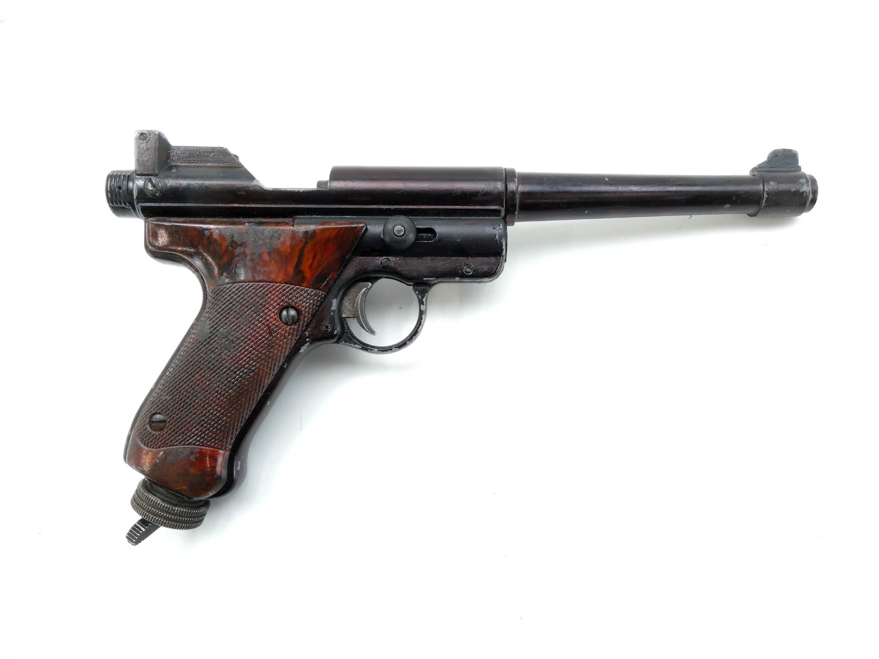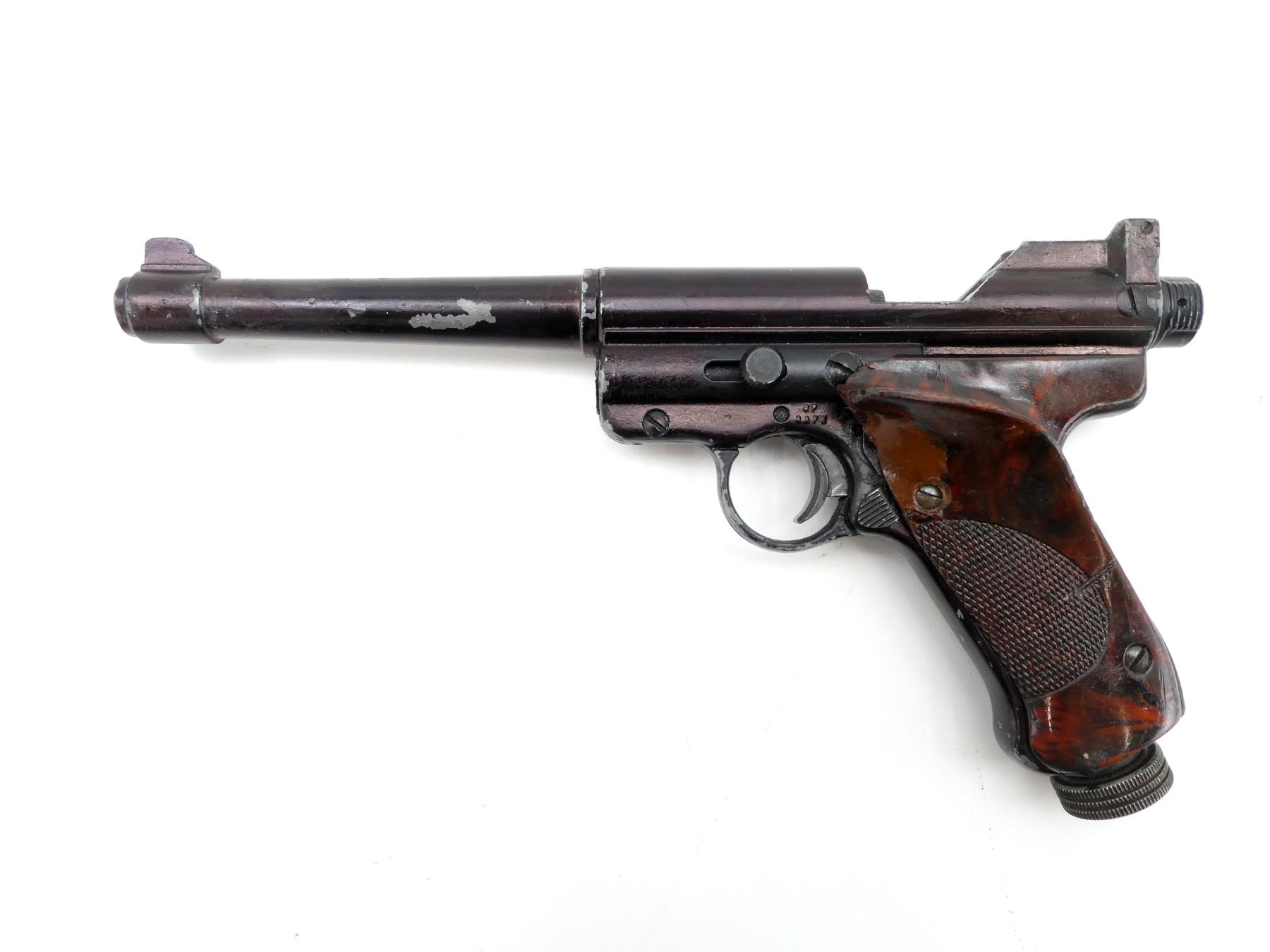 (1) .22 CAL. (5.5MM) PELLET, CO2, SINGLE SHOT, ALLOY CONSTRUCTION, BROWN POLYMER GRIPS (DAMAGED), UNMARKED, NOT FULLY TESTED, SHOWS WEAR & TEAR / USE MARKINGS. SEE PHOTOS.