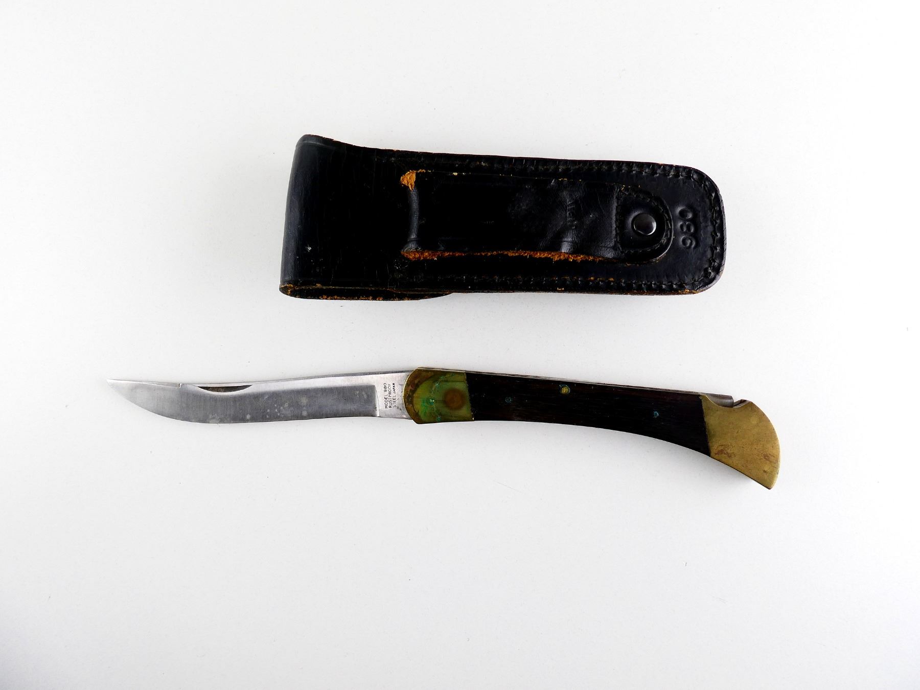 (1) STEEL BLADE, WOODEN & BRASS HANDLE, MARKED "MODEL 980", ETC., WITH BLACK LEATHER SHEATH, SHOWS WEAR & TEAR / USE MARKINGS, BLADE APPROX 5 1/8". SEE PHOTOS.