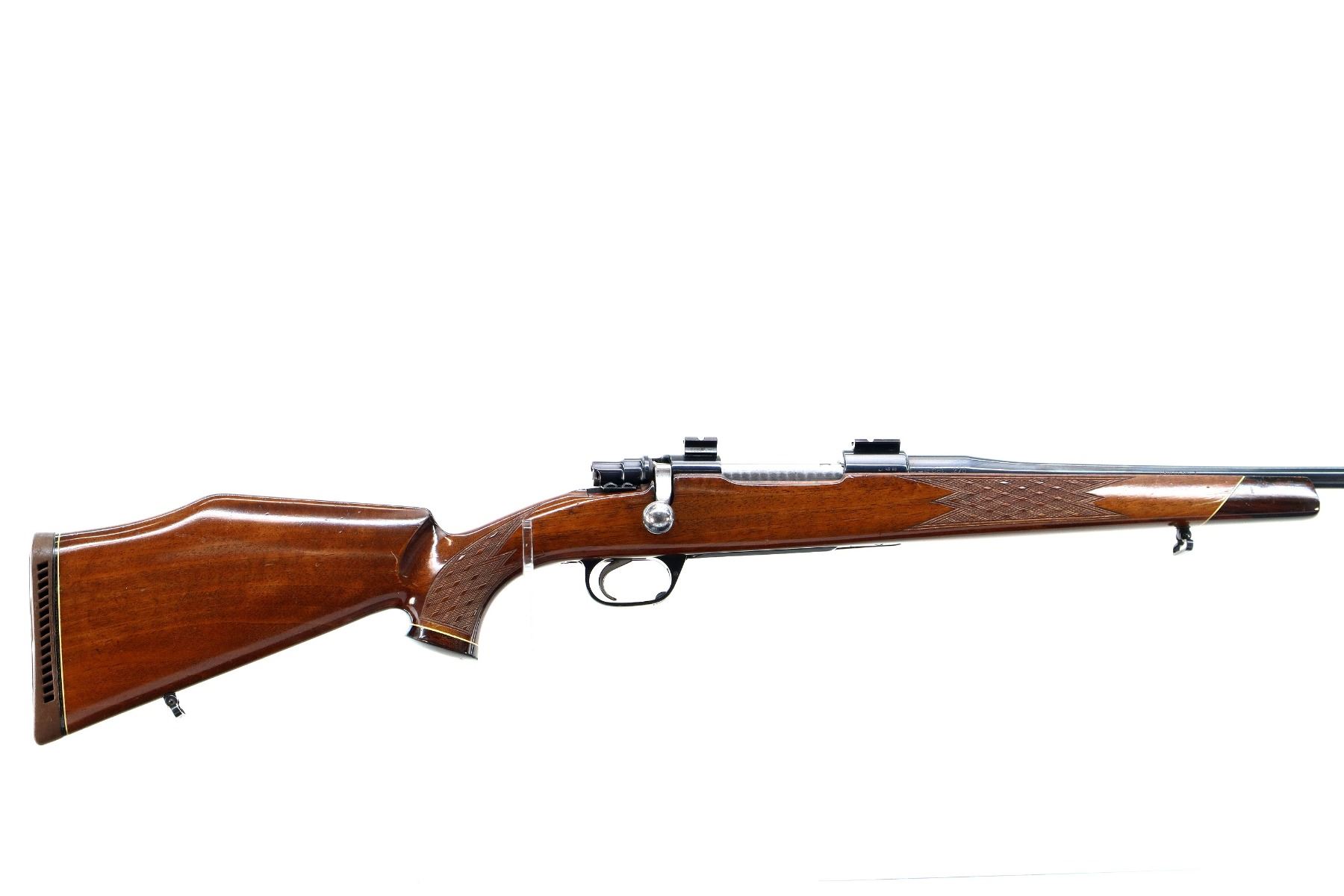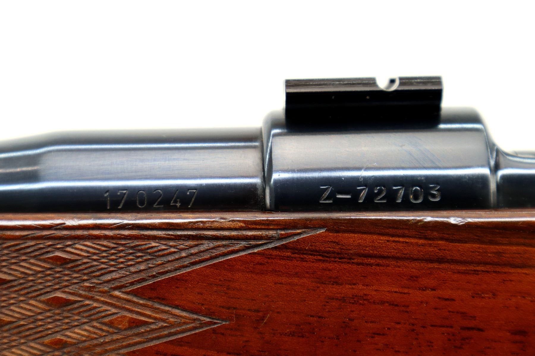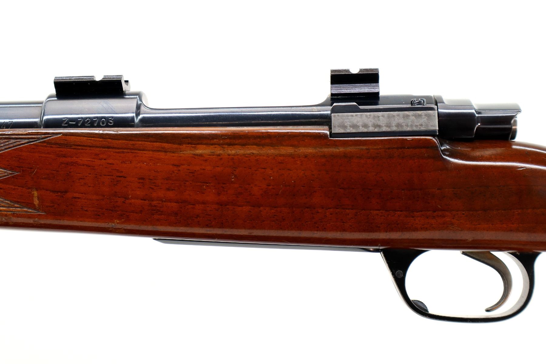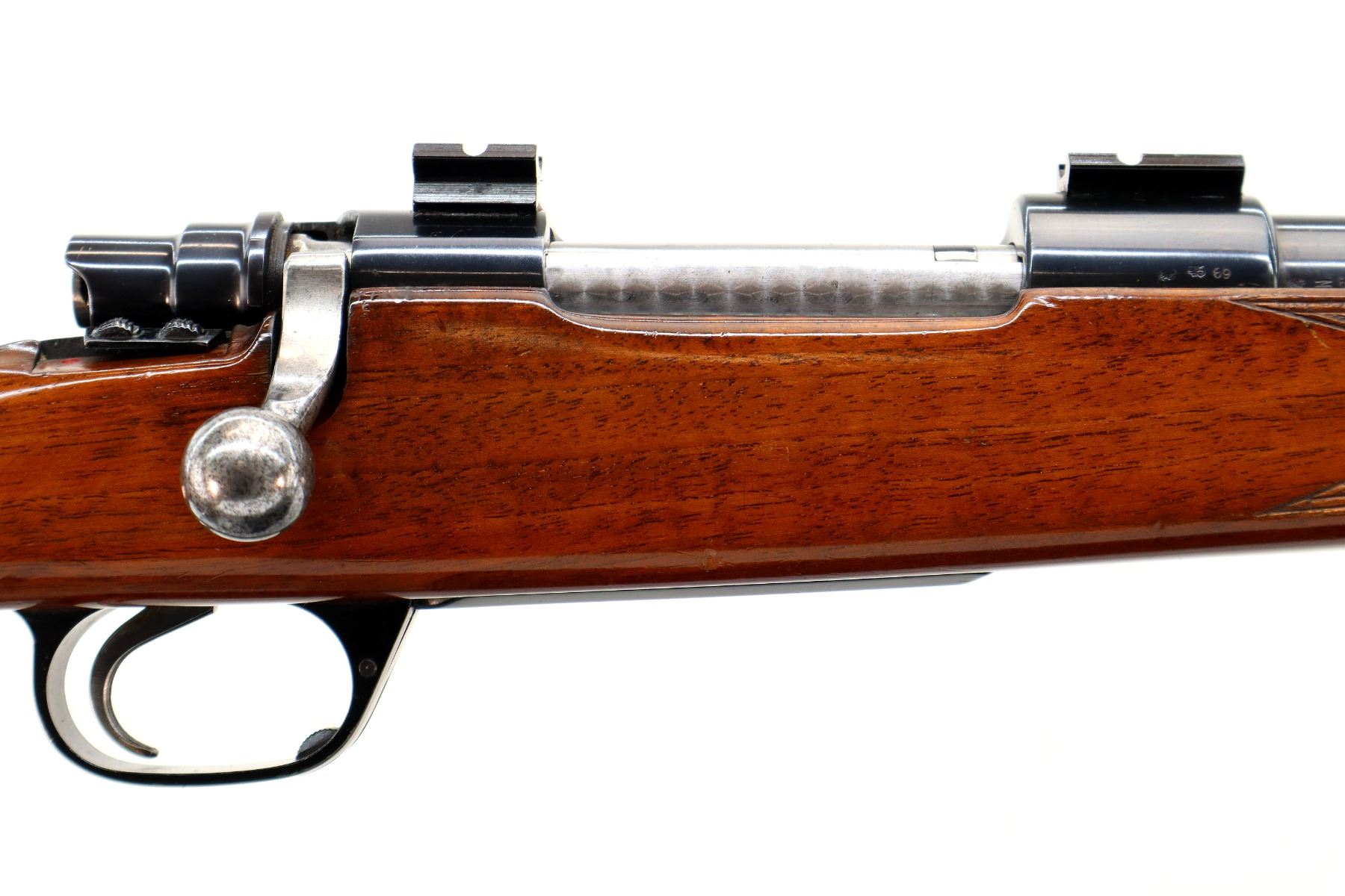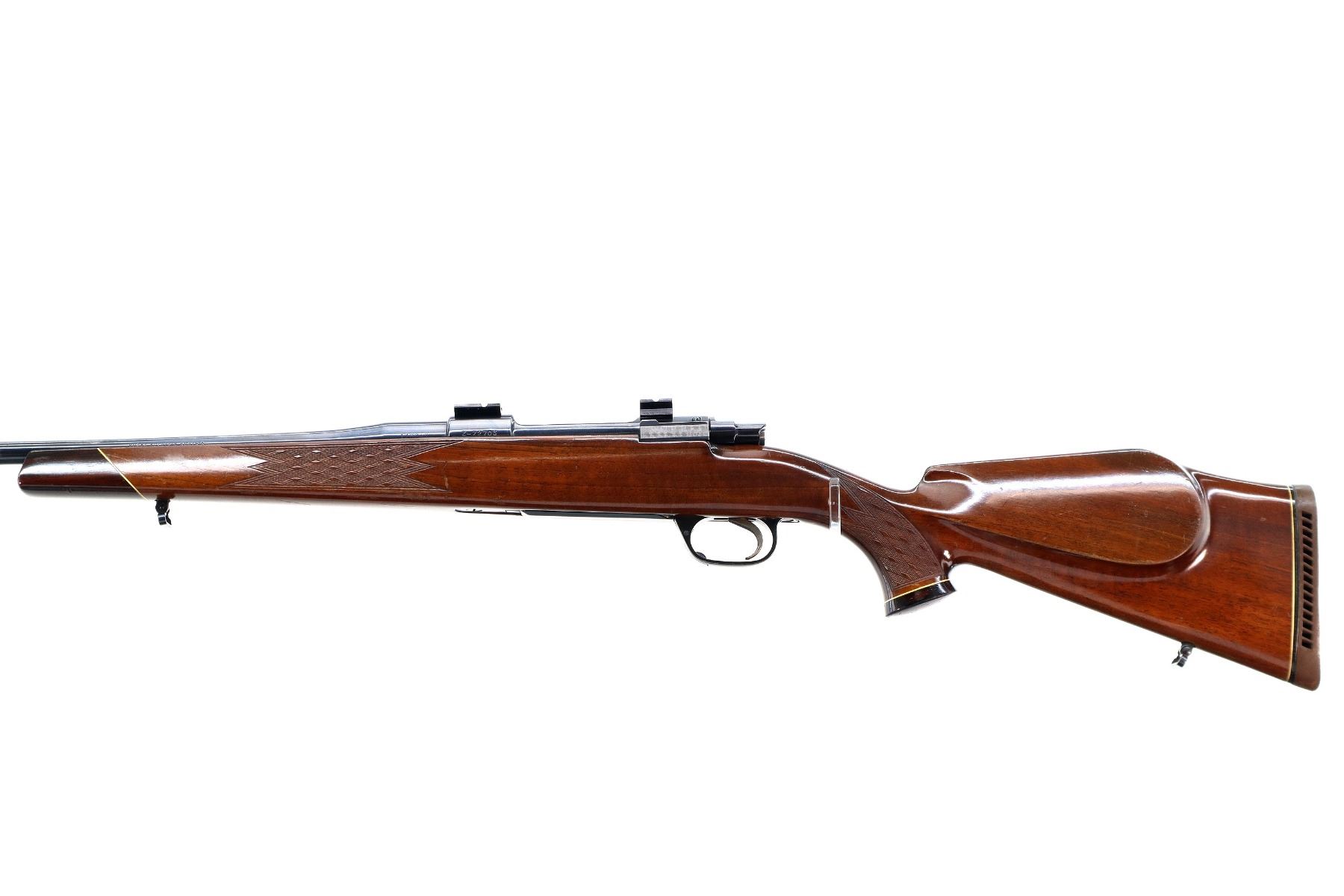 Main Description: No sights, blued finish, receiver drilled and tapped with two piece scope bases installed, low scope bolt handle with smooth knob. One piece wood stock, Rosewood forend and pistol grip caps, checkered forearm and pistol grip, cheek rest, brown vented rubber recoil pad, 14.25" LOP, hinged floor plate, sling swivels.