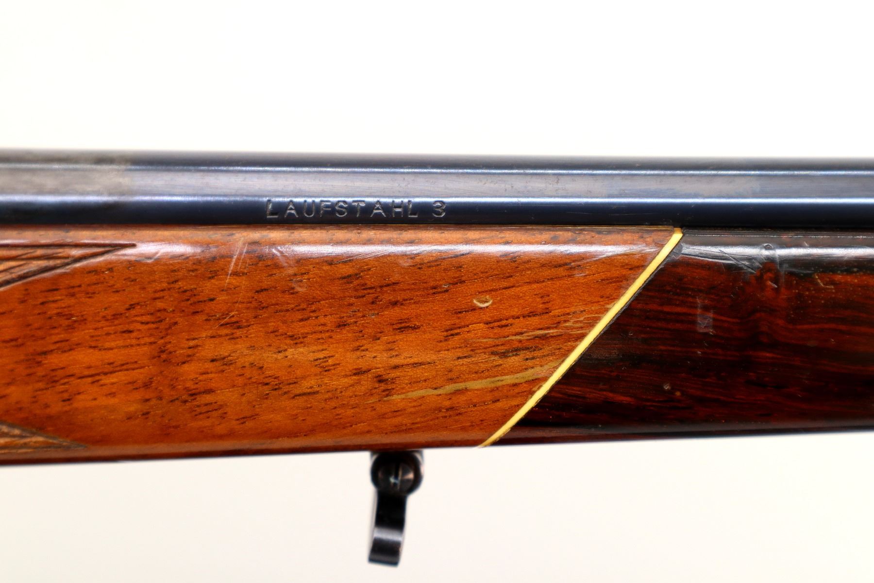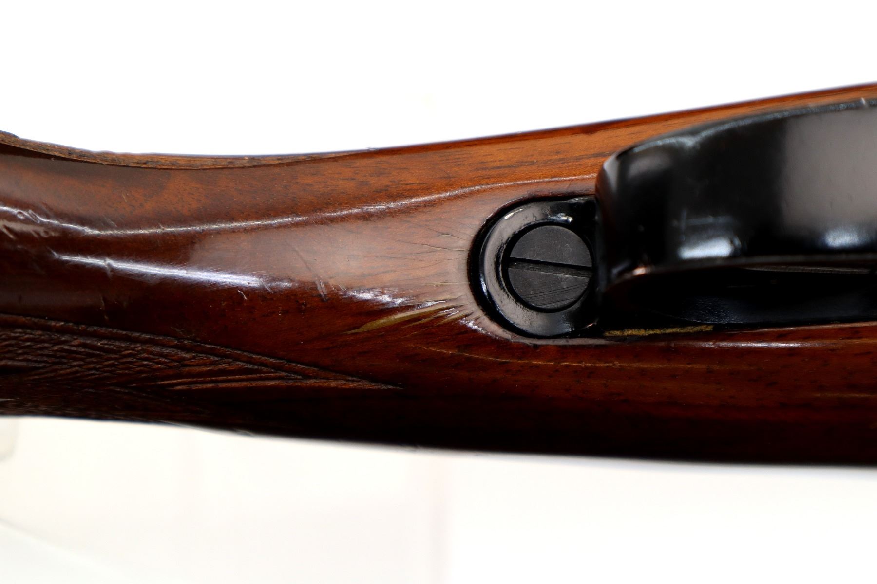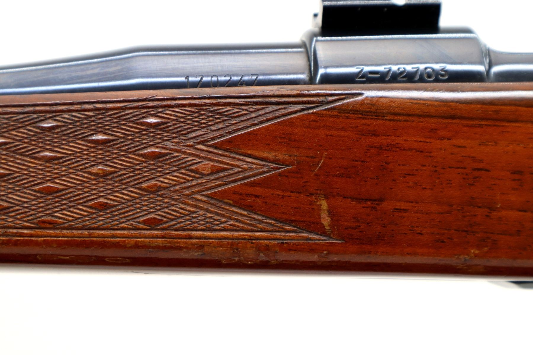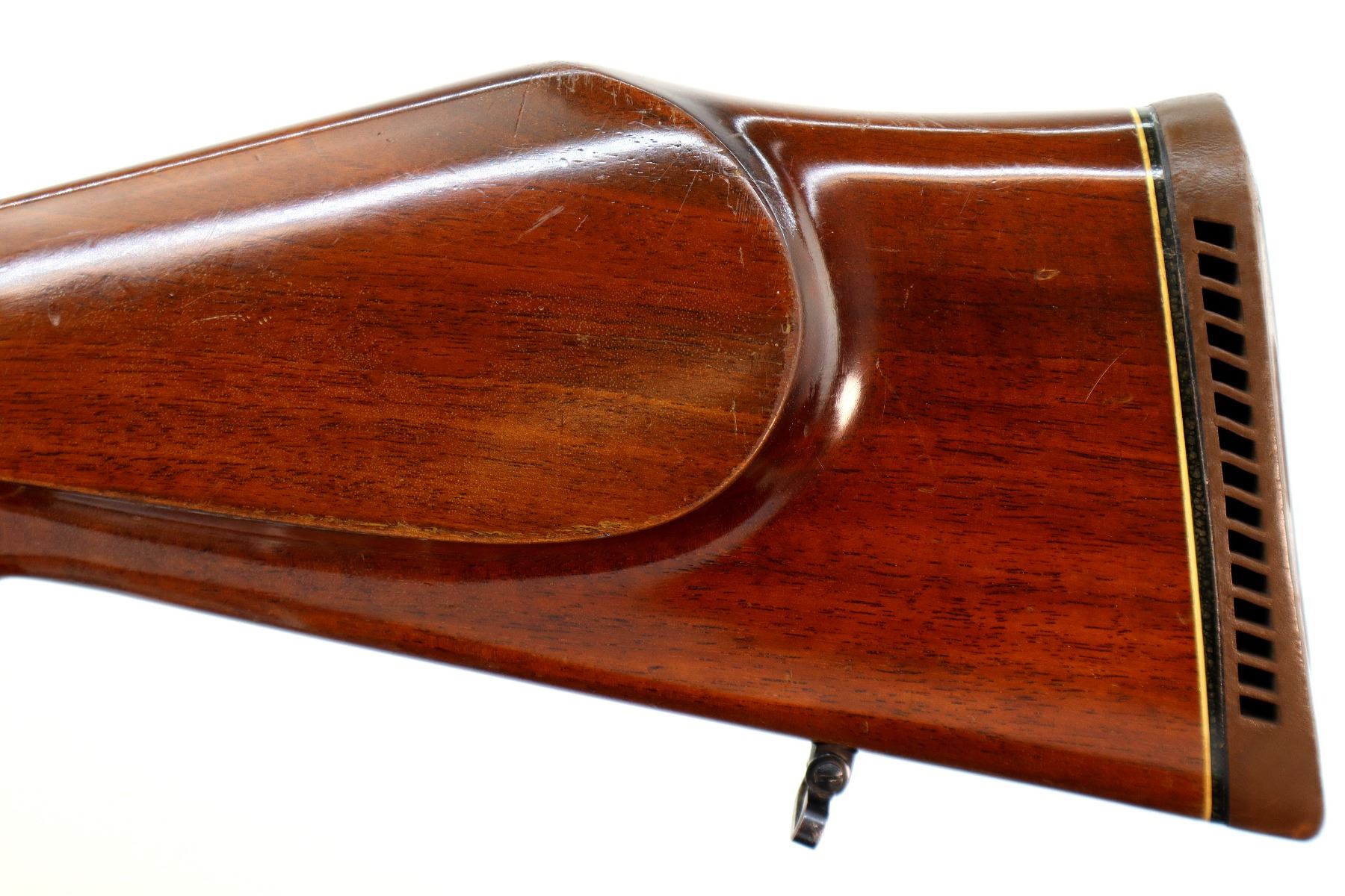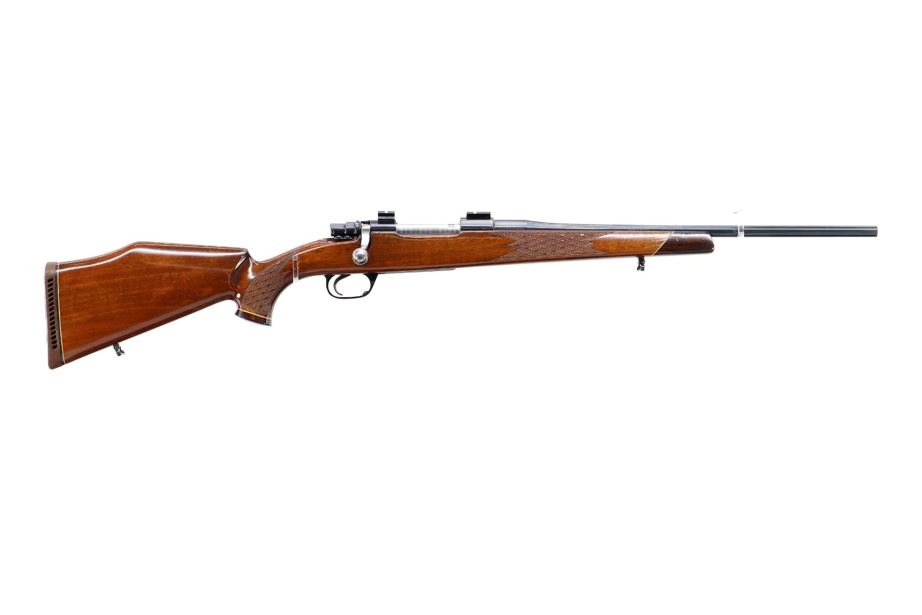 Main Description: No sights, blued finish, receiver drilled and tapped with two piece scope bases installed, low scope bolt handle with smooth knob. One piece wood stock, Rosewood forend and pistol grip caps, checkered forearm and pistol grip, cheek rest, brown vented rubber recoil pad, 14.25" LOP, hinged floor plate, sling swivels.