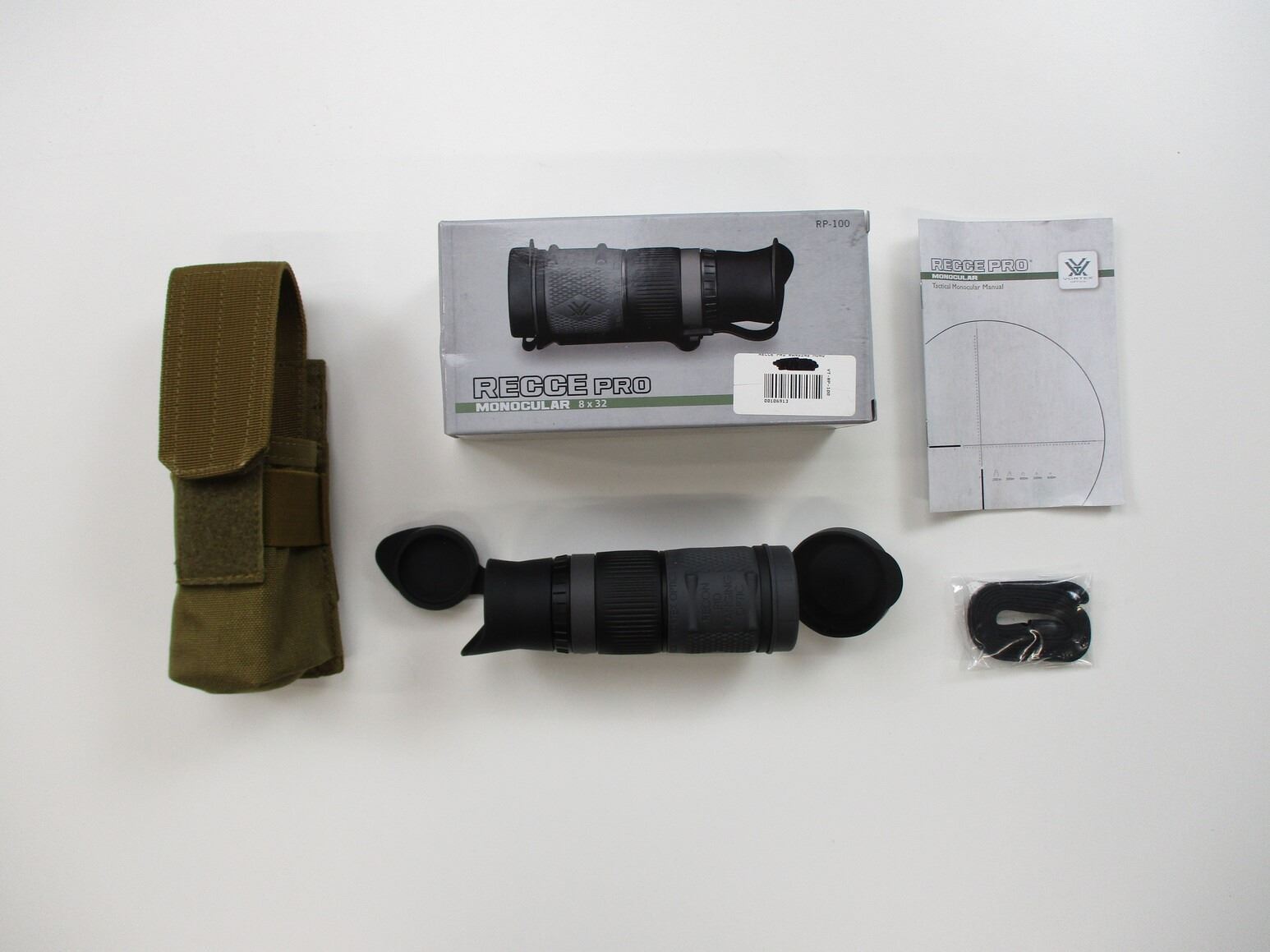 VORTEX RECCE PRO 8X 32 MONOCULAR . NOS, CLEAR OPTICS, FOCUS DIAL WORKS, R/T RANGING RETICLE, SIZE 6.2 X 2.0", RP-100, RUBBER LENS CAPS INCLUDES LANYARD, UTILITY CLIP, MOLLE/ PALS COMPATIBLE CARRY POUCH, & MANUAL IN ORIGINAL PACKAGE.