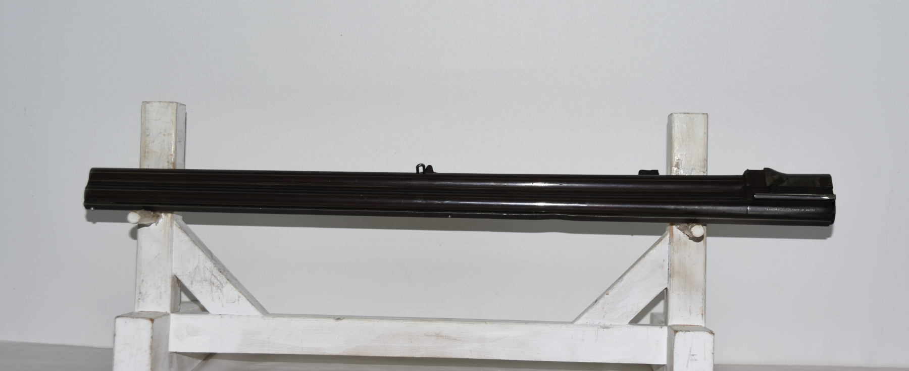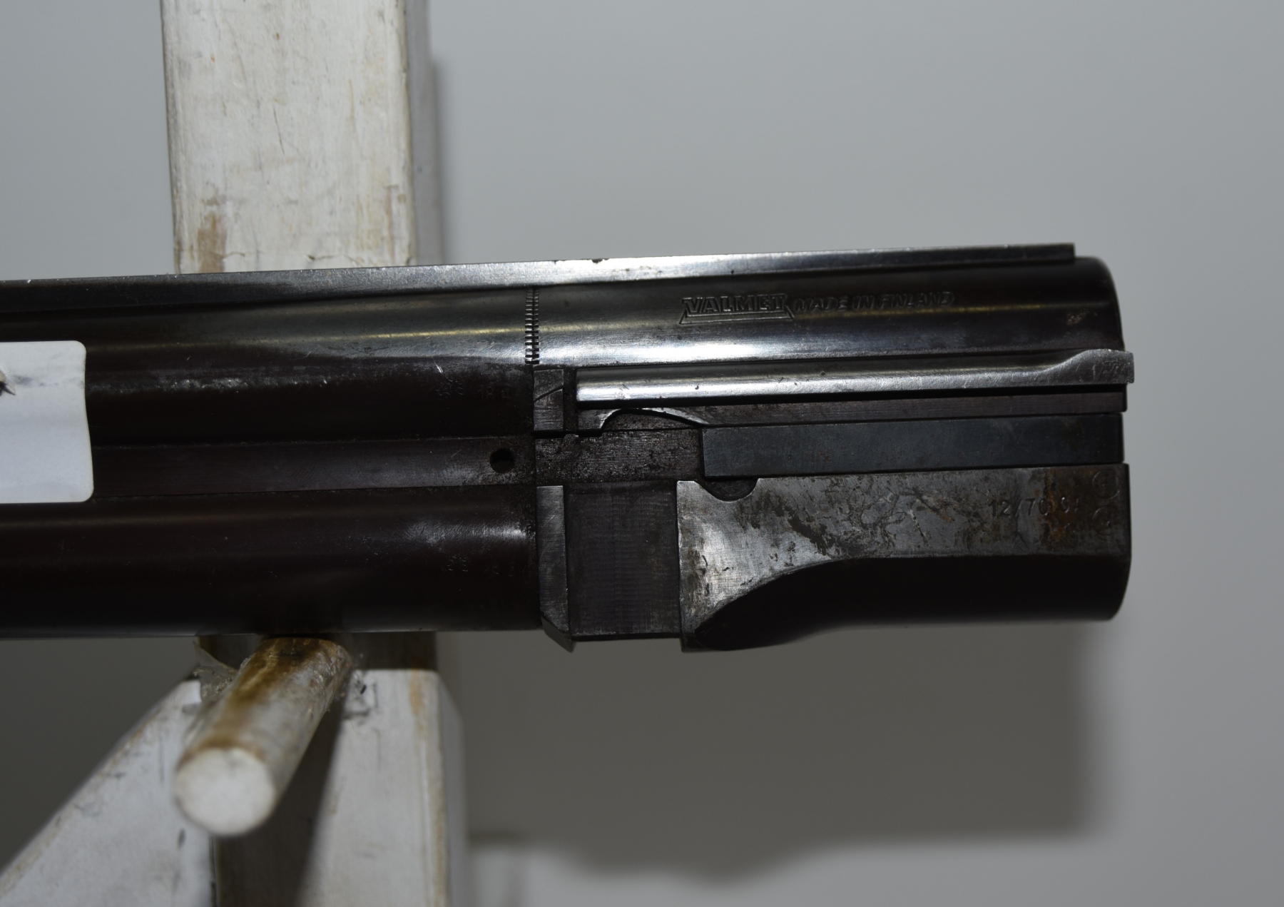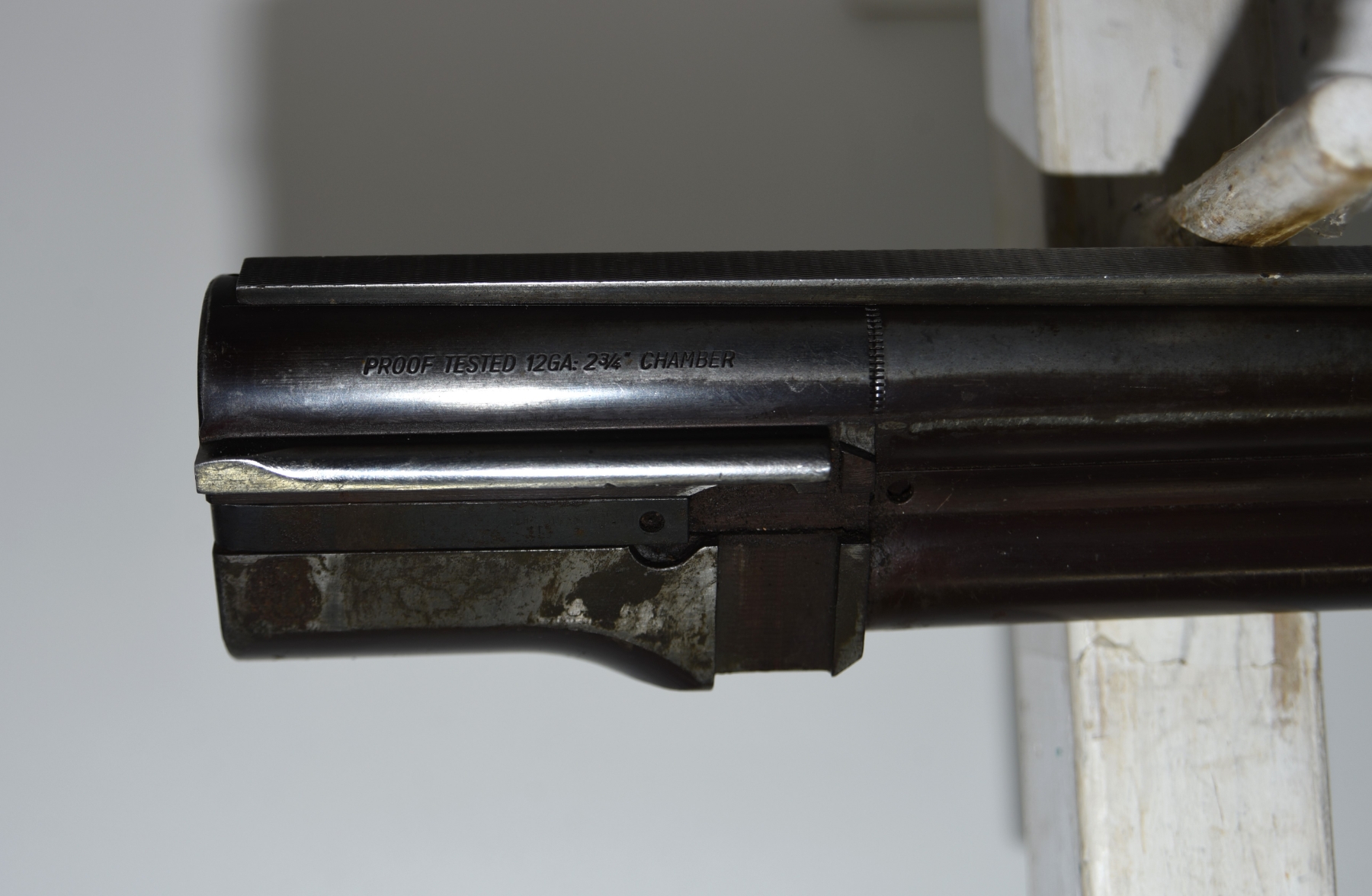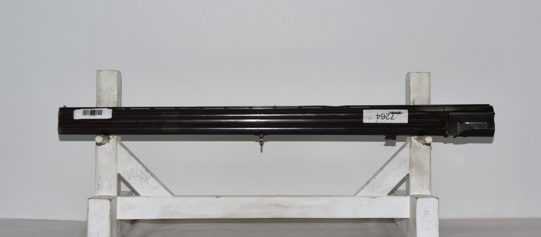 Metal shows dents on the vent rib, a dent on the muzzle, there is finish wear; condition is less than fair.