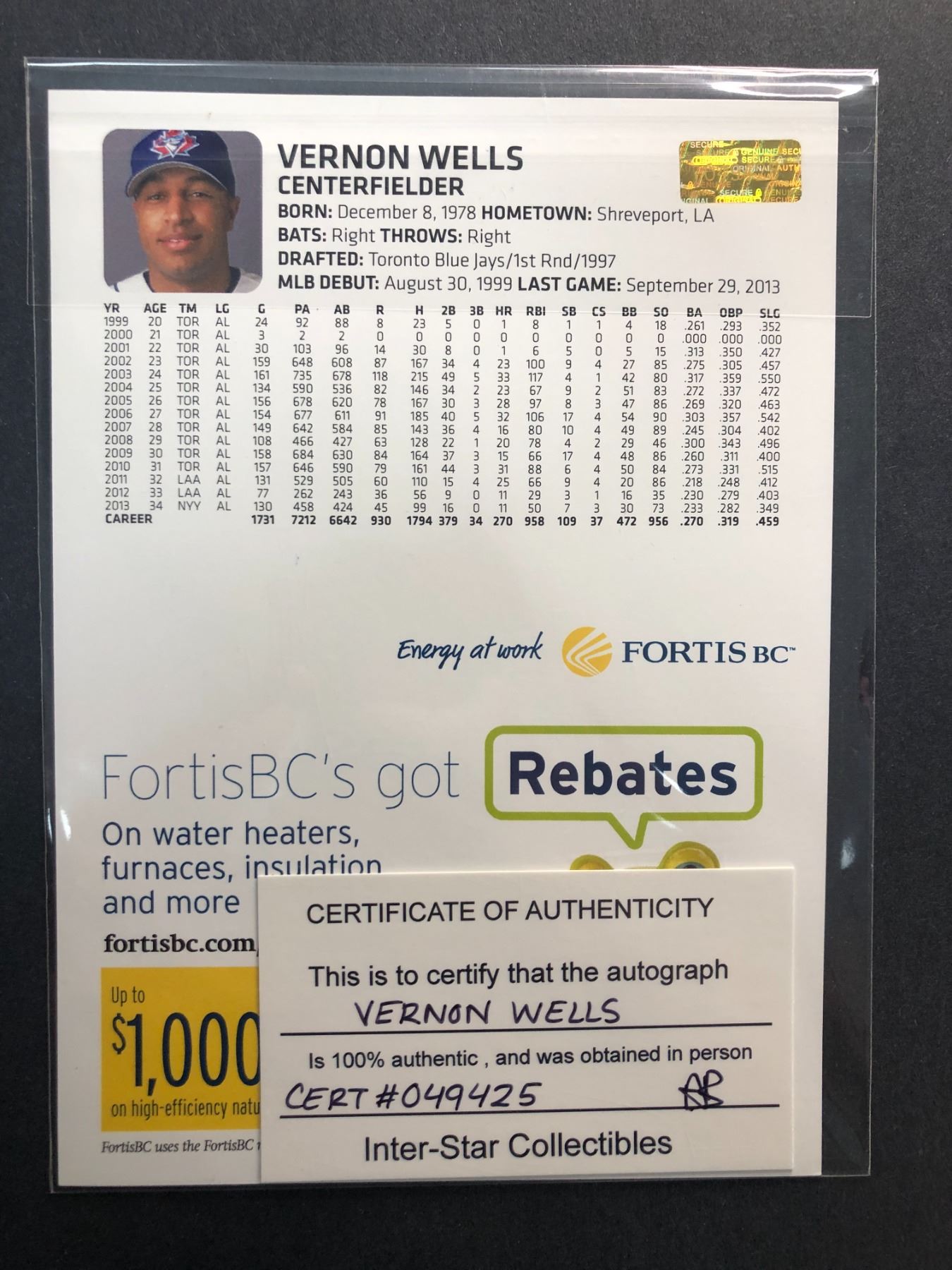 Vernon Wells AUTOGRAPHED 5x7 Card - Blue Jays