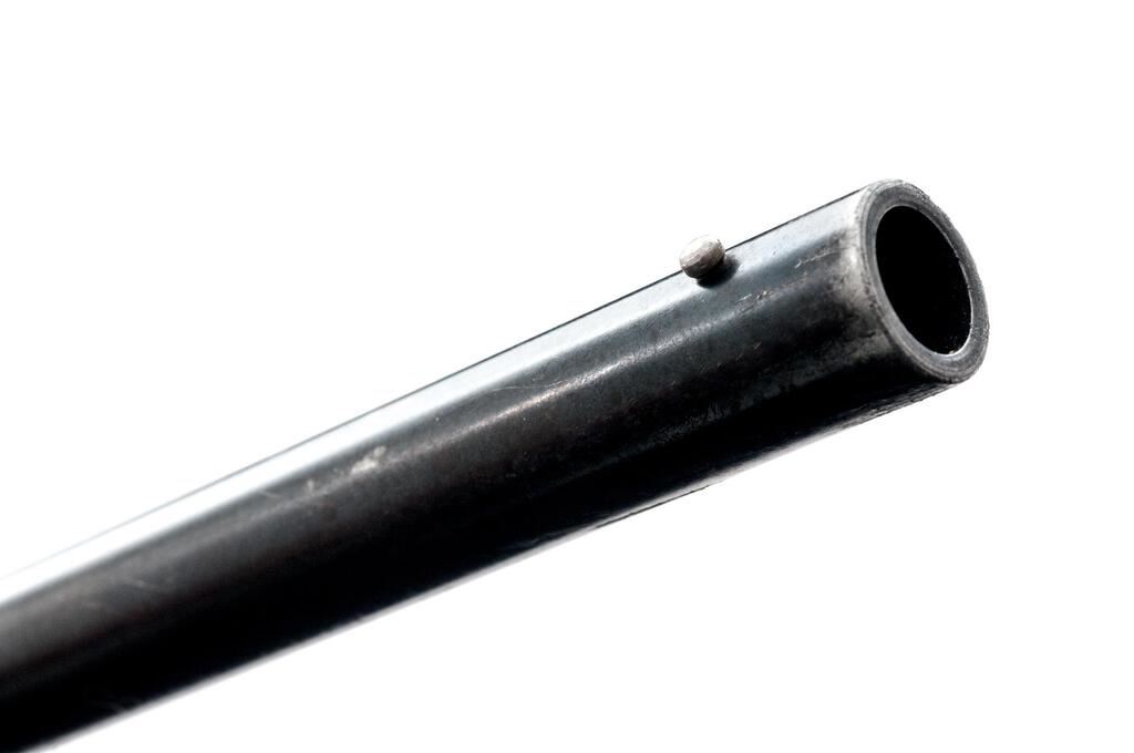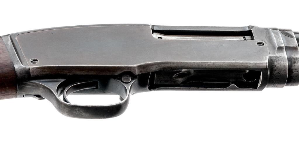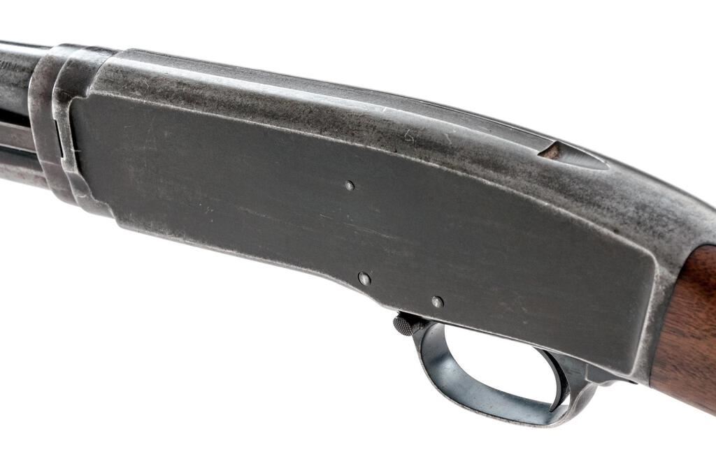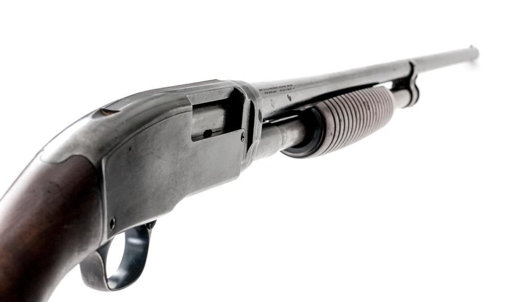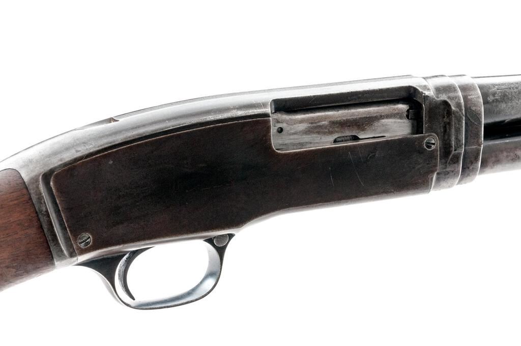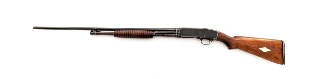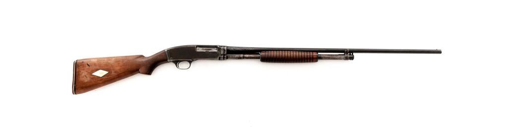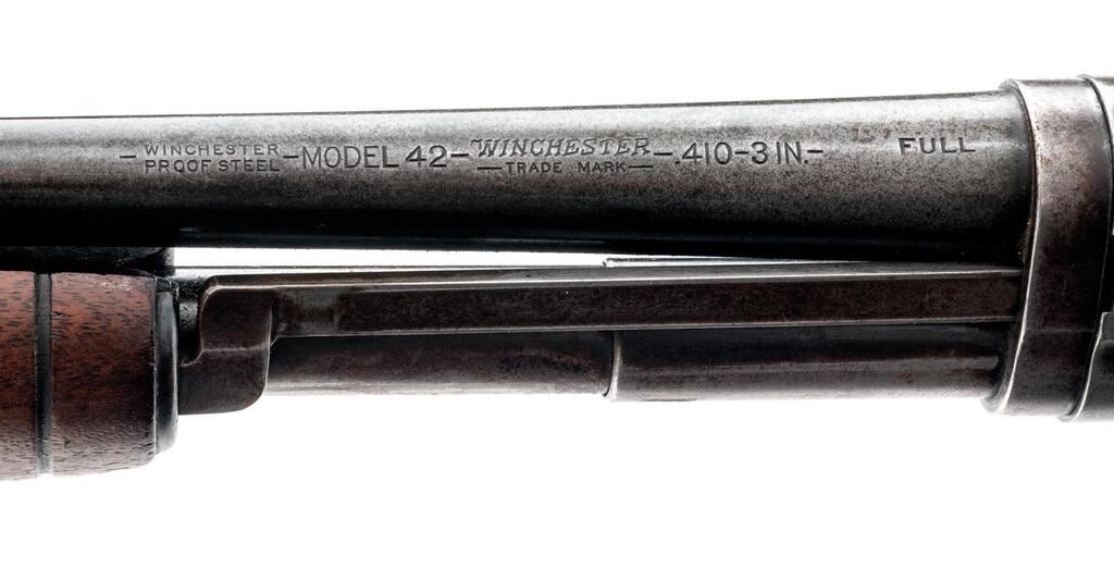 Very Early Winchester Model 42 Standard Grade Slide-Action Shotgun, #13856. .410 bore 28" plain barrel has a 3" chamber and is choked Full. The Model 42 action and takedown mechanism are similar to a Model 12; receiver is unengraved, the tubular 17-groove slide handle and uncheckered pistol grip stock are Field Grade walnut but have 2" white diamonds inlaid in the buttstock, and a Pachmayr Whiteline buttplate installed. Mfg'd in 1934, 2nd year of production. Condition is well used in the field, with approx. 50% finish remaining. Buttstock has been sanded but not refinished; receiver, barrel and magazine tube have lost much bluing from carry and use. Action still locks tight and functions correctly; however bore is bright. Est.: $650-$800. (C&R)