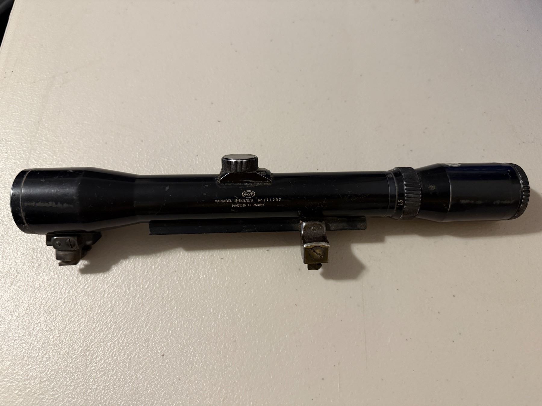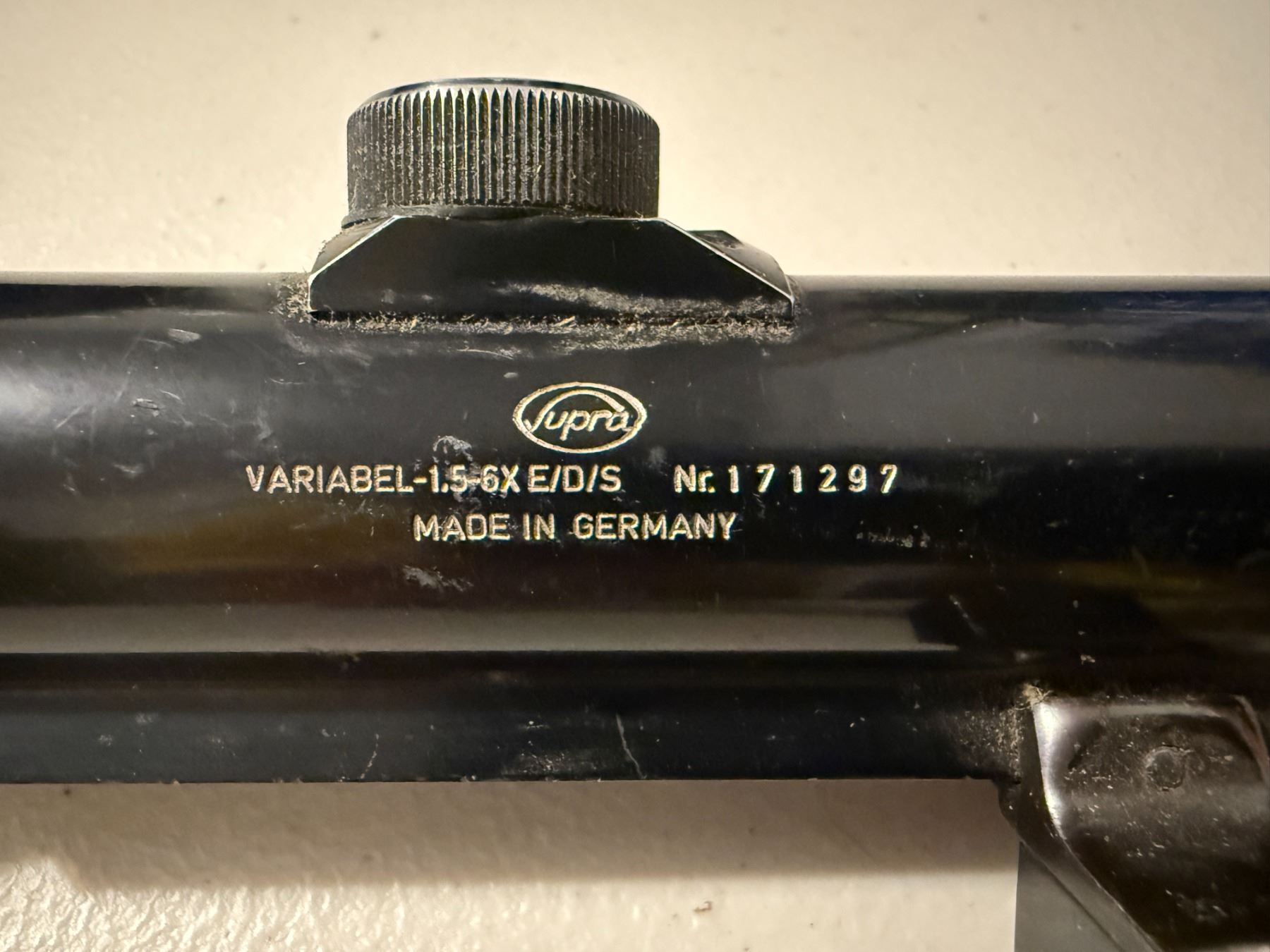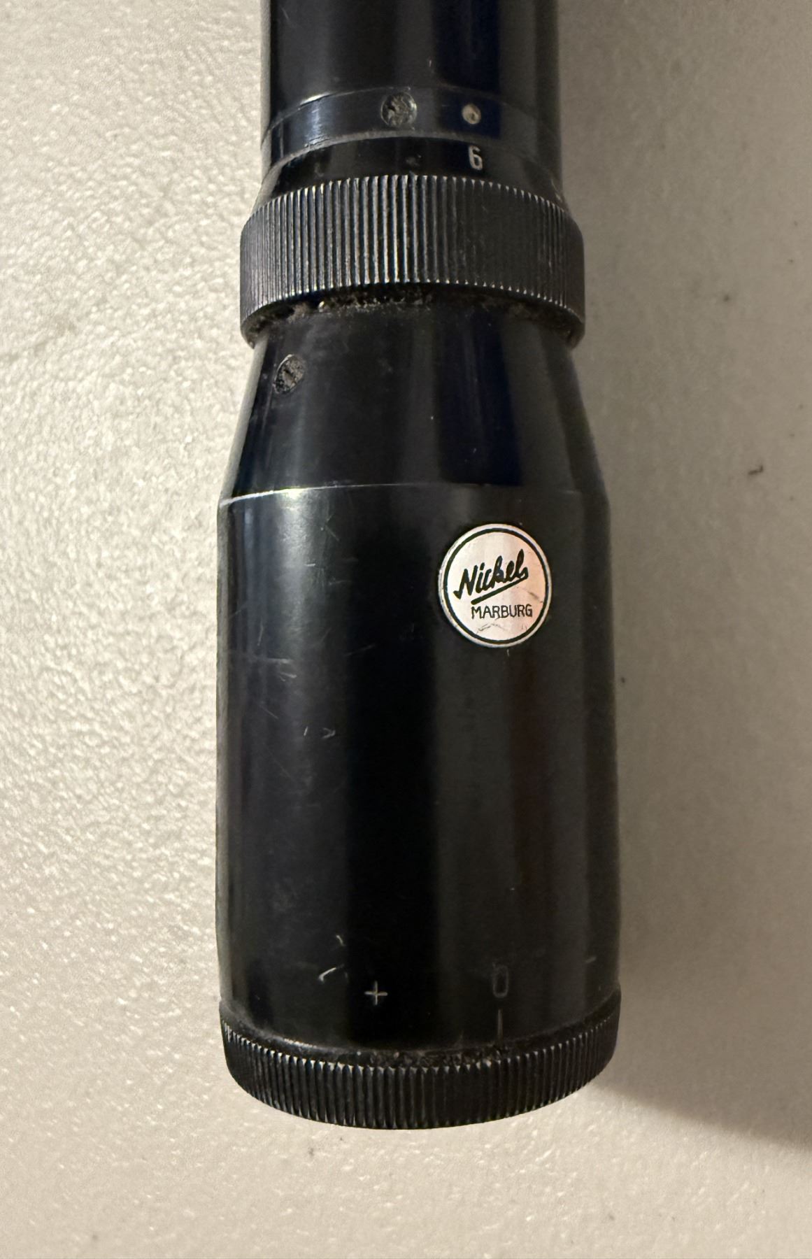 Vintage German-made Supra rifle scope, featuring variable magnification from 1.5–6X with smooth adjustment ring and equipped with the classic Nickel Marburg ocular assembly. This is a solid, well-built European optic from an era known for excellent glass quality and rugged construction. Includes vintage mounts as shown. A great piece for collectors of vintage European optics, period rifle restorations, or anyone looking for a classic German-made scope.