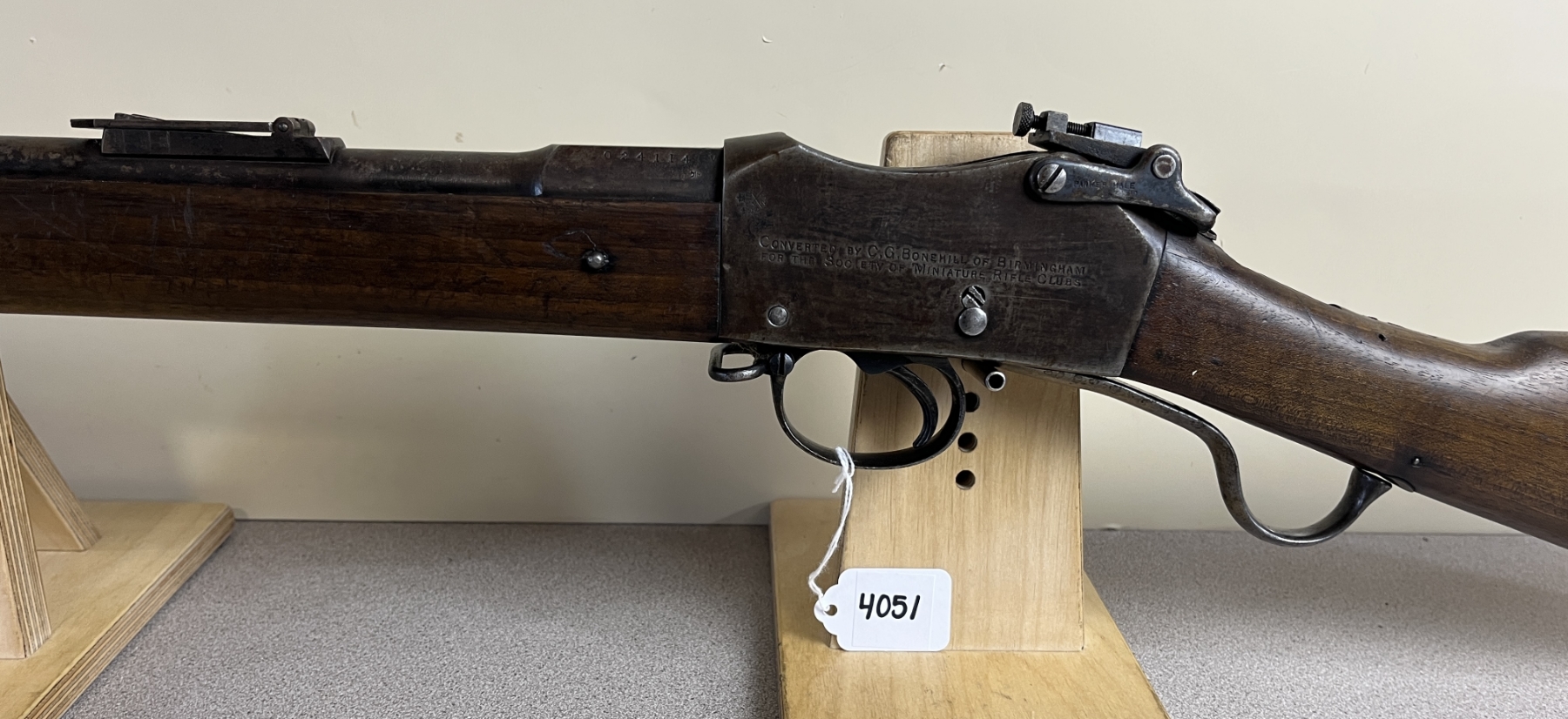CONDITION: F-G OVERALL. BORE G. STOCK CHIPPED AT HEEL. SPECS: 30 /4IN BBL W/ IRON SIGHTS. LEFT SIDE RECIEVER STAMPED 'COVERTED BY C.G. BONEHILL OF BIRMINGHAM FOR THE SOCIETY OF MINAUTRE RIFLE CLUBS'. EXTRAS: TANG SIGHT. S/N: 024114.