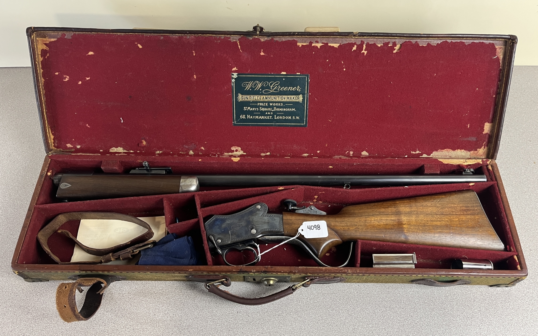 CONDITION: G OVERALL INCL BORE. SPECS: 28IN BBL. EXTRAS: W.W. GREENER TAKEDOWN HARD CASE. NICKLE PLATED SIGHT COVERS. S/N: 023913.