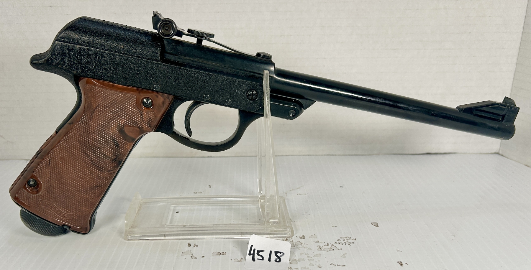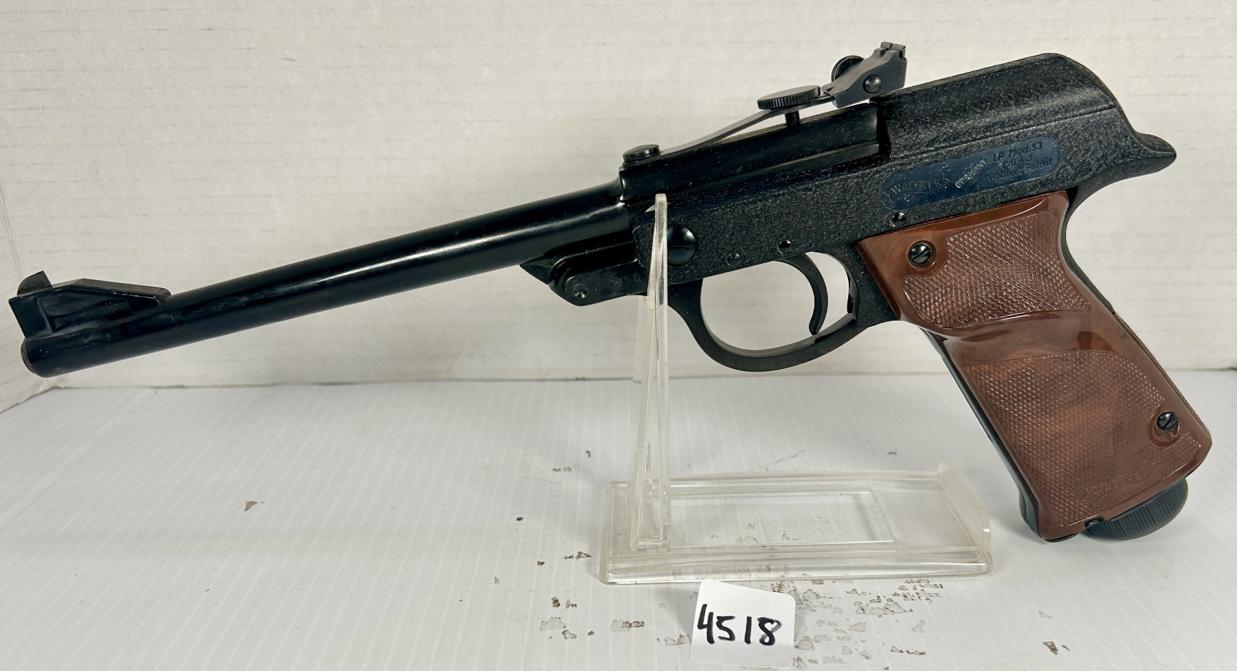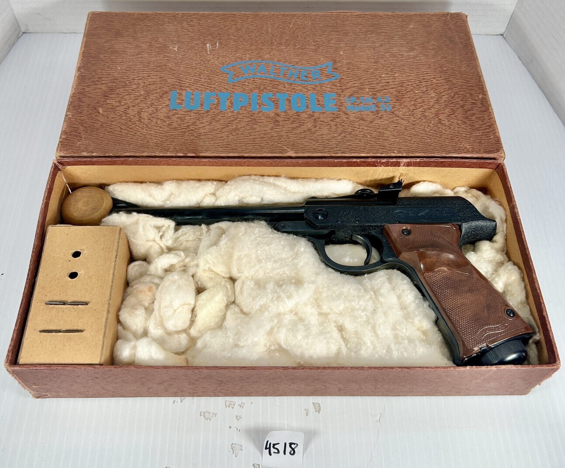 CONDITION: VG. UNTESTED. BORE & RIFLING VG. SPECS: 9 IN BARREL. EXTRAS: ORIGINAL BOX WITH 2X REAR SIGHT BLADES & MUZZLE PROTECTOR. SERIAL: 023551.