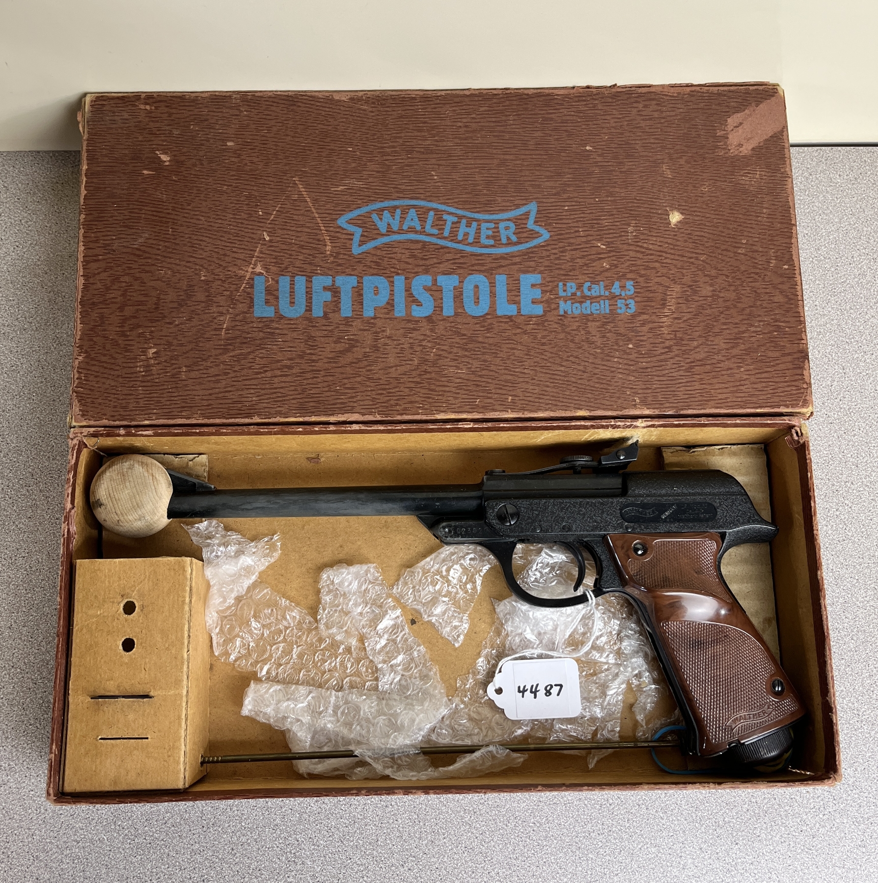 CONDITION: VG OVERALL INCL BORE. SPECS: APPROX 9IN BBL. <500FPS. EXTRAS: ORIGINAL BOX, CLEANING ROD, SPARE REAR SIGHT APERTURE. S/N: 023020