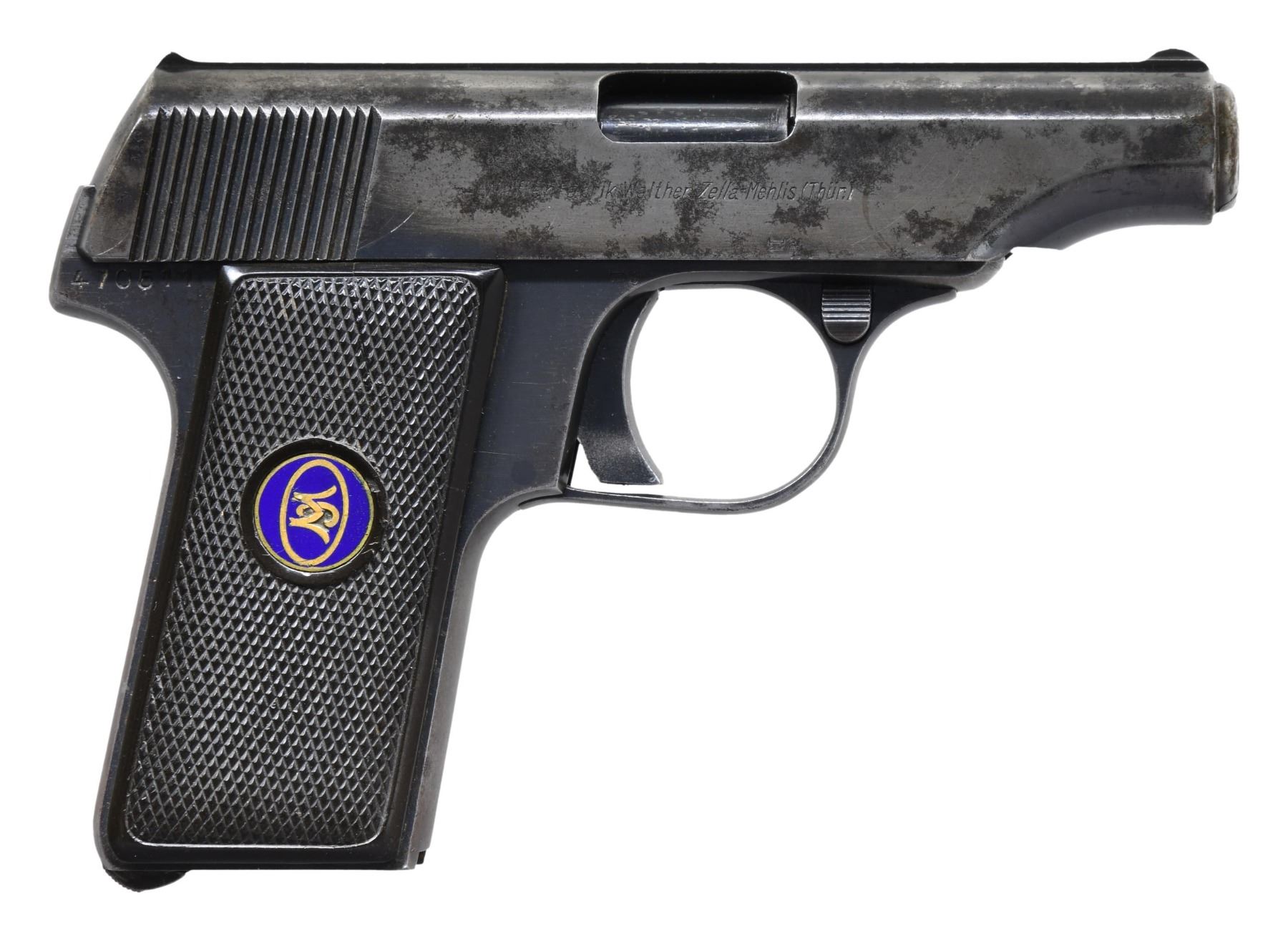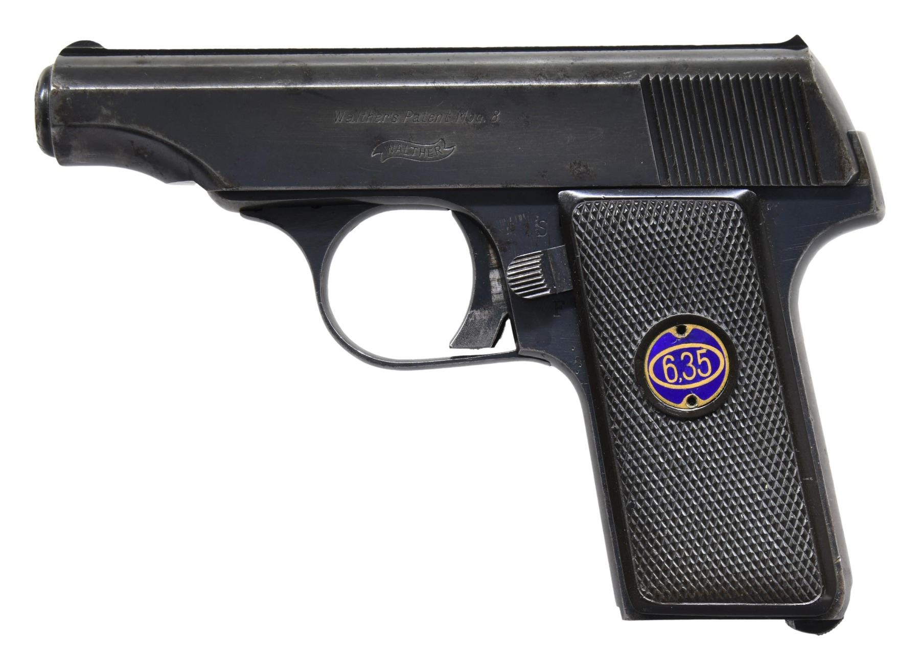 Cal. 6.35mm. S# 470511. Bbl. 2 7/8". 1st variation Model 8 semi-automatic pistol mfg. by Walther, circa. 1920-1926. The left side of the slide is marked "Walther's Patent Mod. 8." above the Walther banner logo, with Walther's mfg. information marked on the right. Right side of the frame and slide exhibit a German Crown/N commercial nitro proof. Metal components exhibit a blue finish overall, save for on the bbl., which has been heavily cleaned and is in-the-white. Frame is mounted with 2-piece Walther brown checkered synthetic grips, with the left panel exhibiting a "6,35" medallion, and the right exhibiting a "CW" monogram medallion. Breechblock assembly is absent. Recoil spring is an improper replacement. MAGS: 1 non-compatible 8-rd. UNATTACHED ACCESSORIES: firing pin. CONDITION: metal components retain large amounts of their original factory blue finish, exhibiting areas of wear and thinning that show through to gray patina, some areas with striations from prior cleaning, as well as some scattered spots of light to mild pitting overall. Right side of the slide retains a mostly gray patina, with areas of age related discoloration, and scattered spots of light to mild pitting. Bbl. has been heavy cleaned, with the bbl. down tapering inward at the muzzle. Bbl. exhibits heavy pitting, while retaining trace rifling throughout. (25-2072/MLW). CURIO. $250-350.