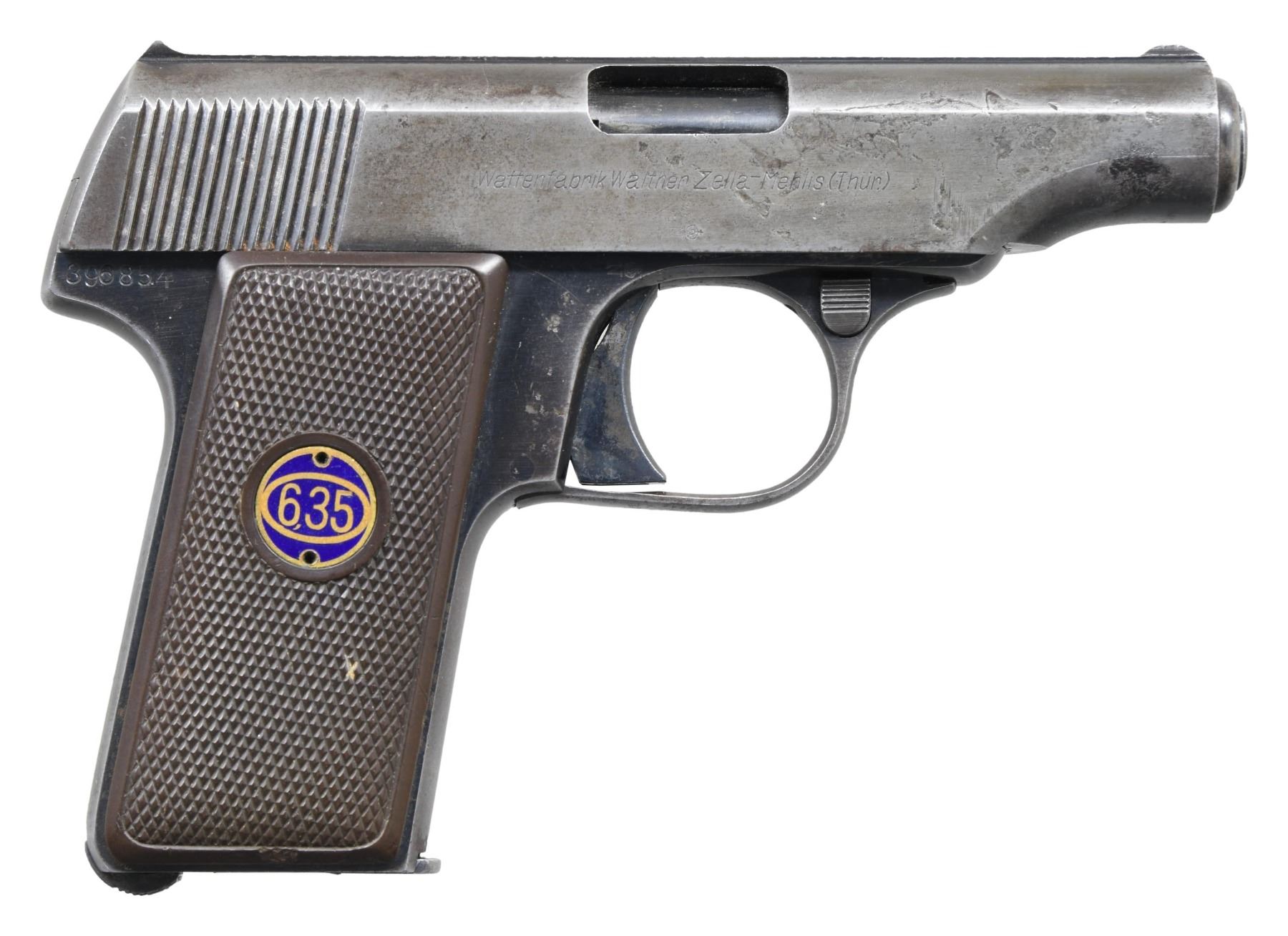 Cal. 6.35mm. S# 396854. Bbl. 3 7/8". 1st variation Model 8 semi-automatic pistol mfg. by Walther, circa. 1920-1926. Left side of the slide is marked "Walther's Patent Mod.8" above the Walther banner logo, with Walther's mfg. information marked on the right. Left side of the frame is marked "MADE IN GERMANY", with a German Crown/N commercial nitro proof marked on the right side of the frame, slide, and bbl. Metal components exhibit a blue finish overall. Frame is mounted with 2-piece checkered brown synthetic grips, with a "CW" monogram medallion present on the left grip, and a "6,35" medallion present on the right. Slide features a grooved matte rib, with a fixed blade front sight, and fixed U-notch rear sight. MAGS: 1 8-rd. CONDITION: metal components retain fair to good amounts of their original factory finish, exhibiting wear and thinning that show through to gray patina, with scattered spots of dark oxidation and mild pitting present on the slide. Fair bore, exhibiting consistent mild pitting, while retaining strong rifling throughout. Grips show some scattered superficial marks from handling and storage, with the left panel exhibiting a repaired break. (25-2073/MLW). CURIO. $200-300.