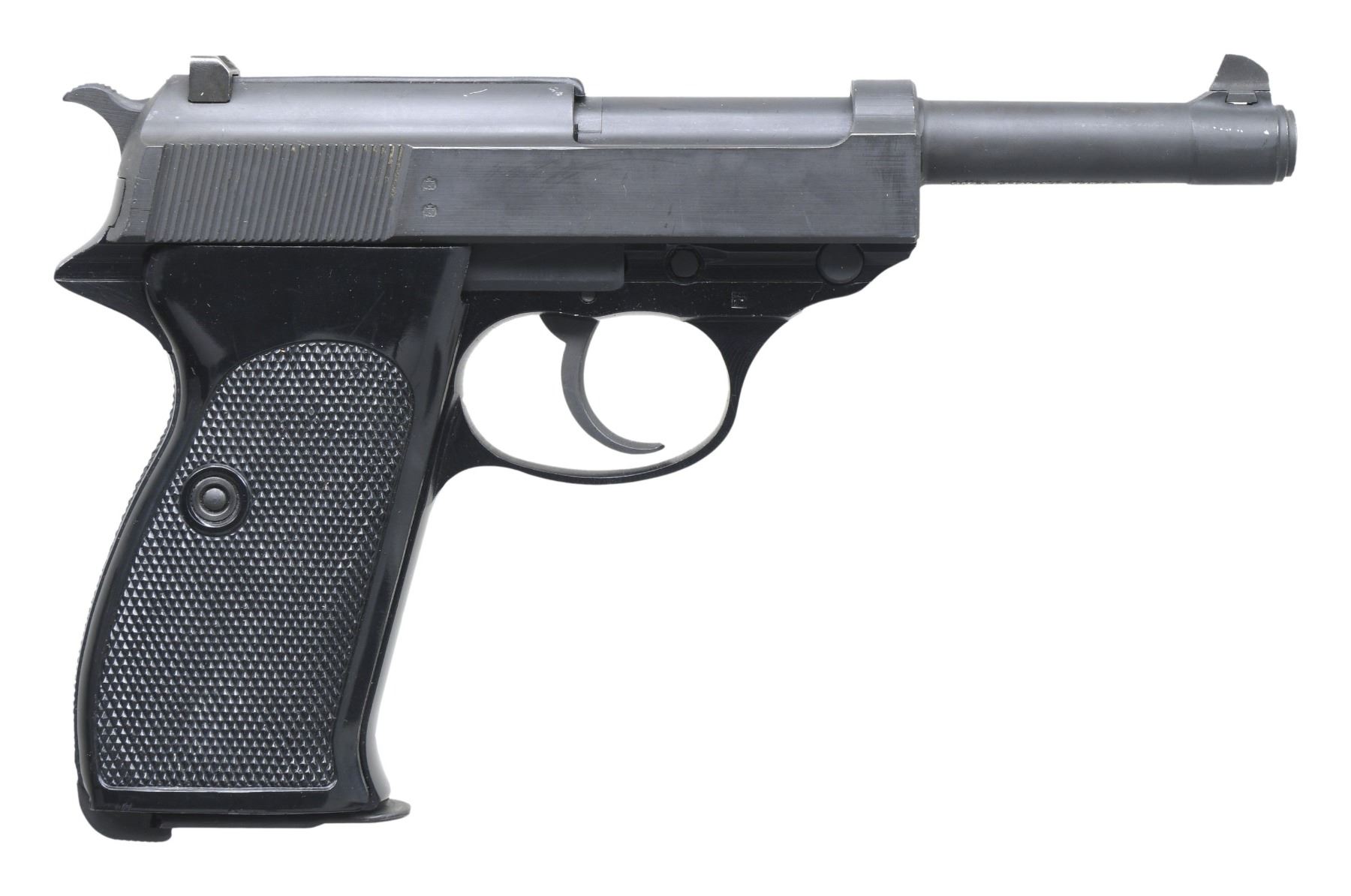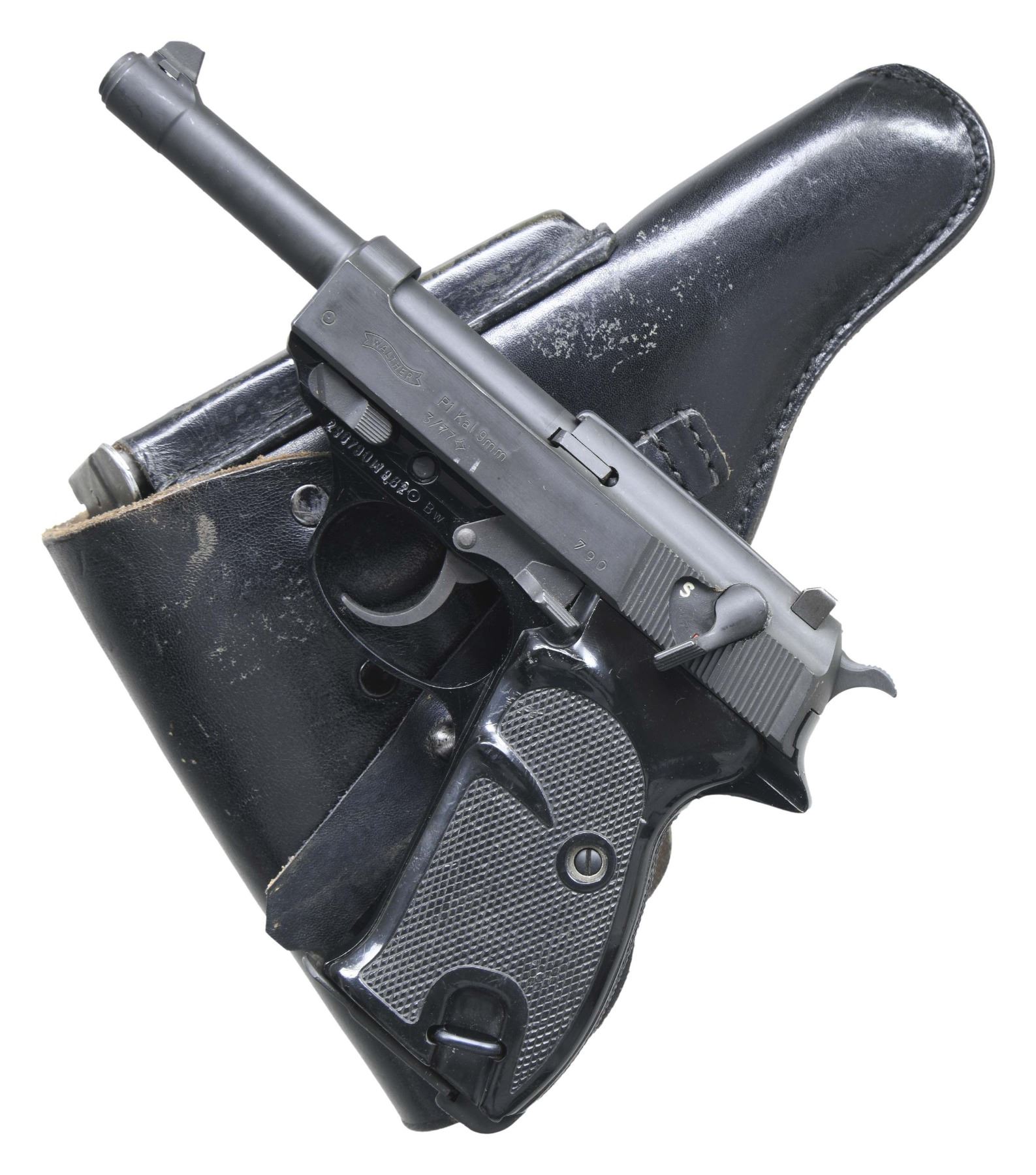 Cal. 9x19. S# 296790W982. Bbl. 5" with IO import marking. Blade front sight. Fixed rear sight. Matching numbers on bbl, slide & frame. Post War P38 with aluminum alloy frame. Left side of slide has 3/77 date & Walther banner. Left side of frame has "BW" (Bundswehr) West German Army stamp. Black anodized frame. Gray parkerized bbl. & slide assemblies. Checkered black grips. MAGS: 2-8 rd. UNATTACHEWD ACCESSORIES: importer box that appears to lack a serial number with cleaning kit, holster, manual & trigger lock. Box lists this pistol as "UNISSUED". CONDITION: grips show some checkering wear & handling marks. Metal retains 98% parkerized & anodized finishes with some light handling marks & edge wear. Action functions properly when hand cycled. Bright near excellent bore. (25-3383/MJC). MODERN. $300-500.