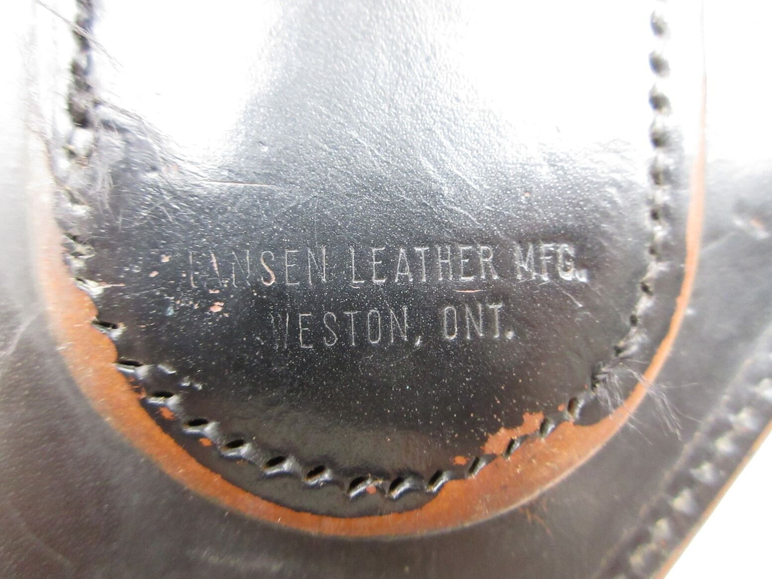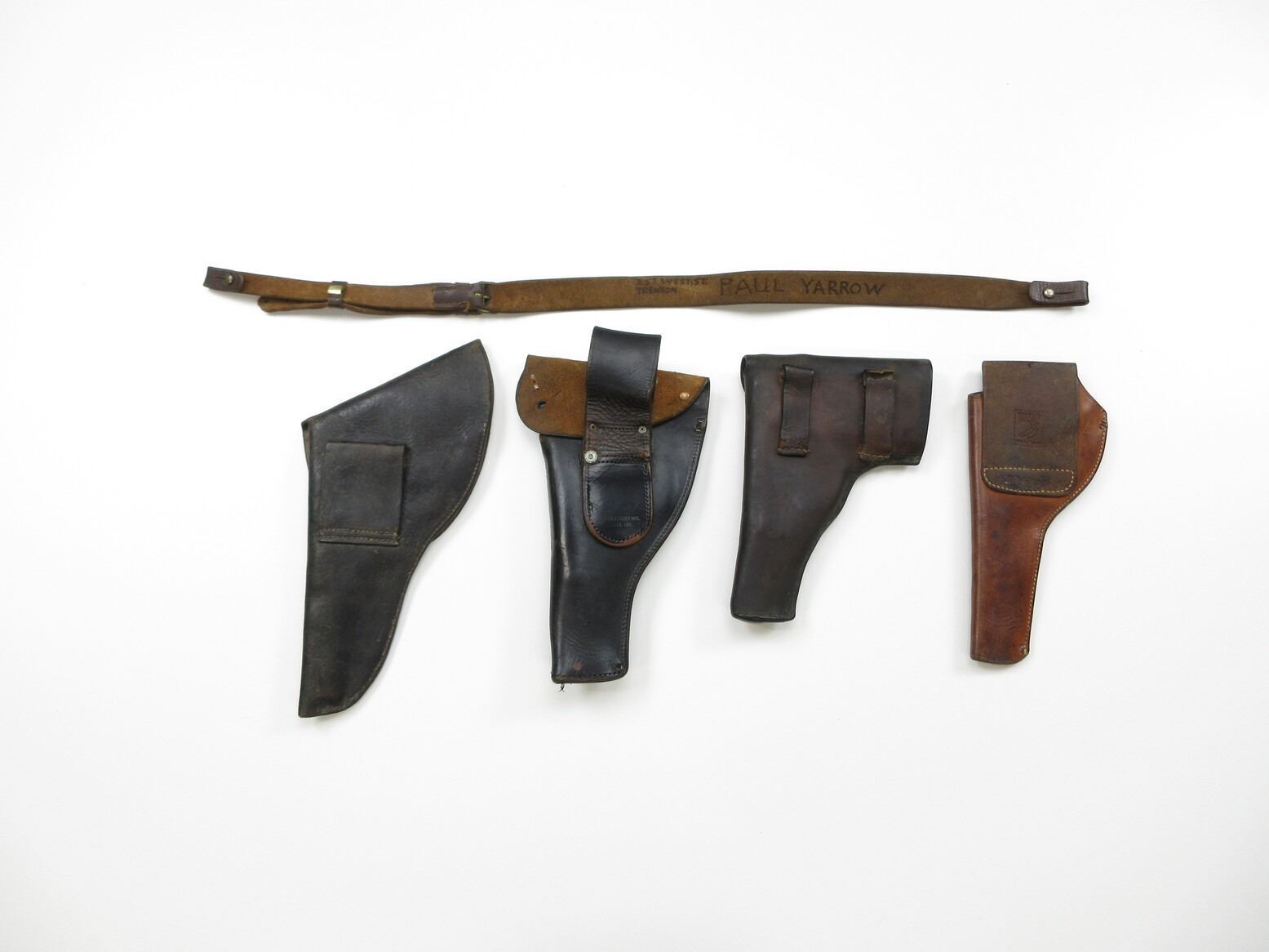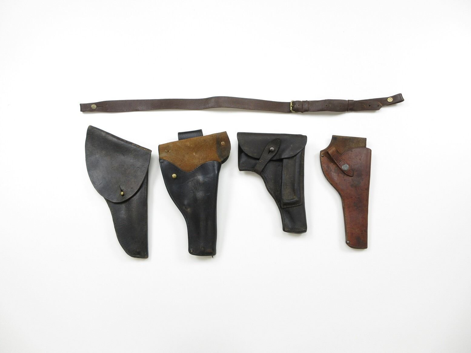 WALTHER P38 TYPE HOLSTER AND ASSORTED LEATHER REVOLVER TYPE HOLSTERS, ETC. LOT. LOT INCLUDES; (1) LEATHER P38 TYPE HOLSTER, POSSIBLY FITS P38 PISTOLS WITH MAGAZINE SLEEVE AND BELT LOOPS (1 BROKEN), UNMARKED, SHOWS WEAR, (1) BLACK LEATHER REVOLVER TYPE HOLSTER, RIGHT HANDED, FAINT MANUFACTURER MARKINGS, TOP FLAP GLUED OPEN, WITH BELT LOOP, APPROX. 8" OAL, SHOWS WEAR, (1) REDHEAD BROWN LEATHER REVOLVER TYPE HOLSTER, RIGHT HANDED, MARKED "206HDB", WITH BELT LOOP, APPROX. 8.75" OAL, SHOWS WEAR, (1) BLACK LEATHER UNKNOWN REVOLVER TYPE HOLSTER, RIGHT HANDED, FLAP, UNMARKED, WITH BELT LOOP, APPROX. 9" OAL, SHOWS WEAR, (1) BROWN LEATHER ADJUSTABLE SLING, APPROX. 29.75".