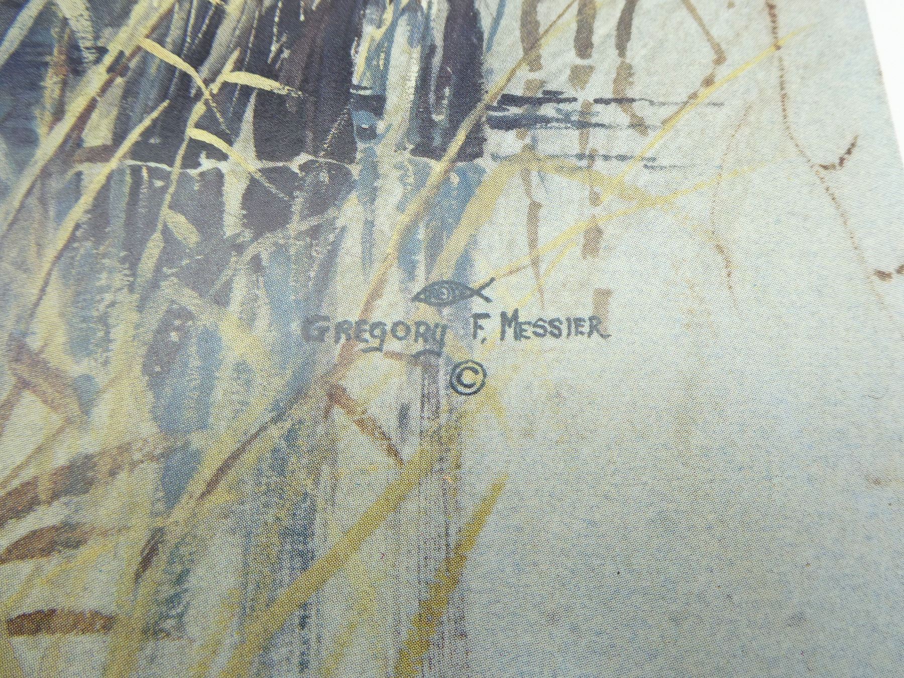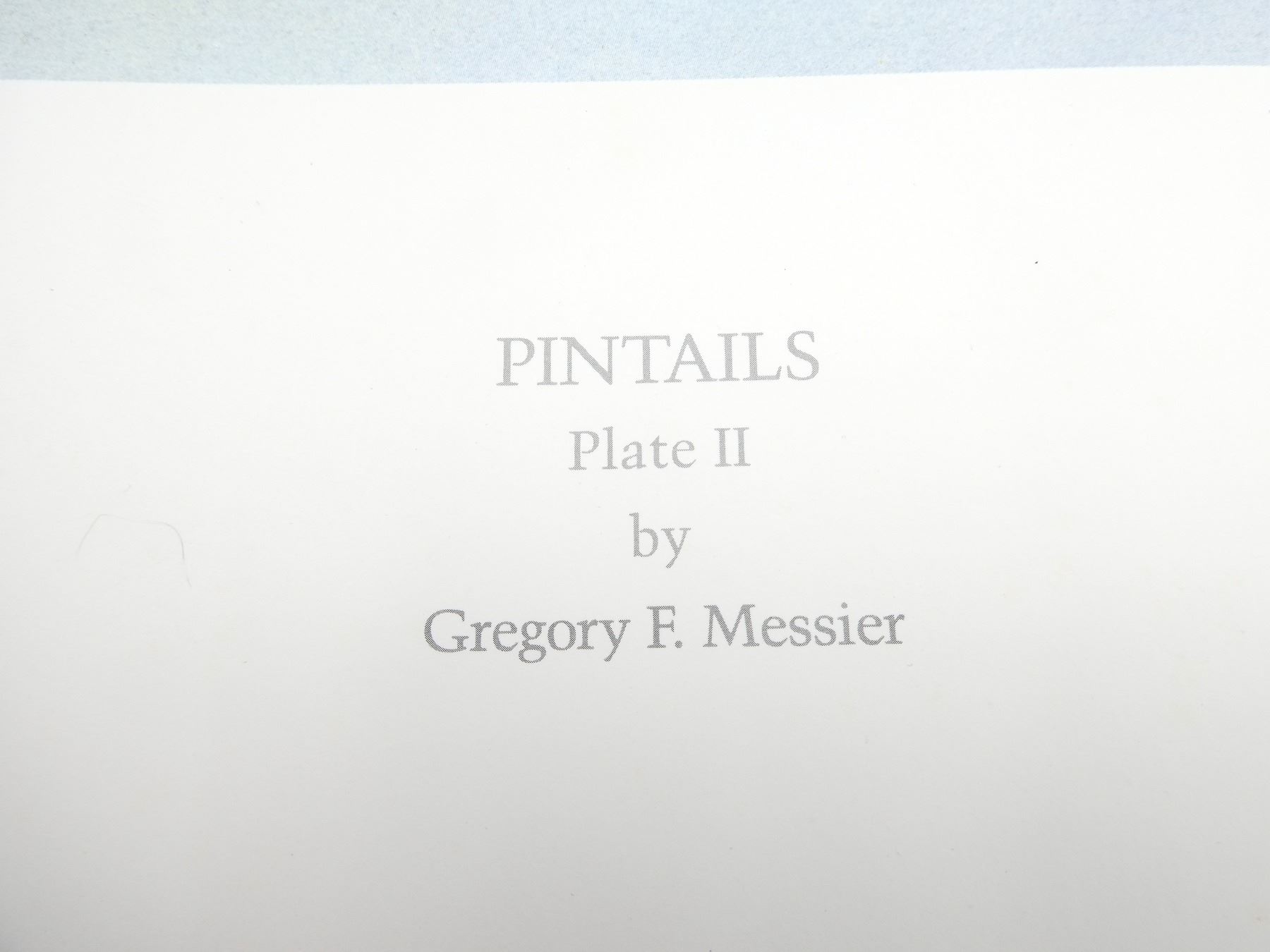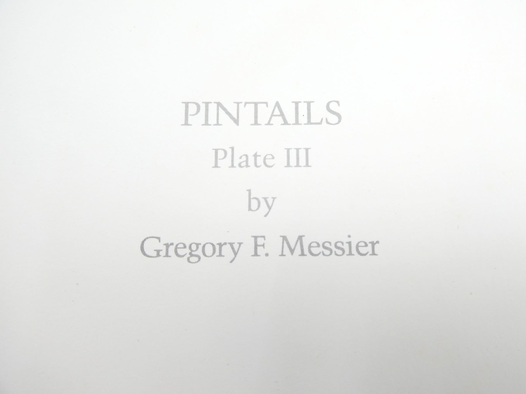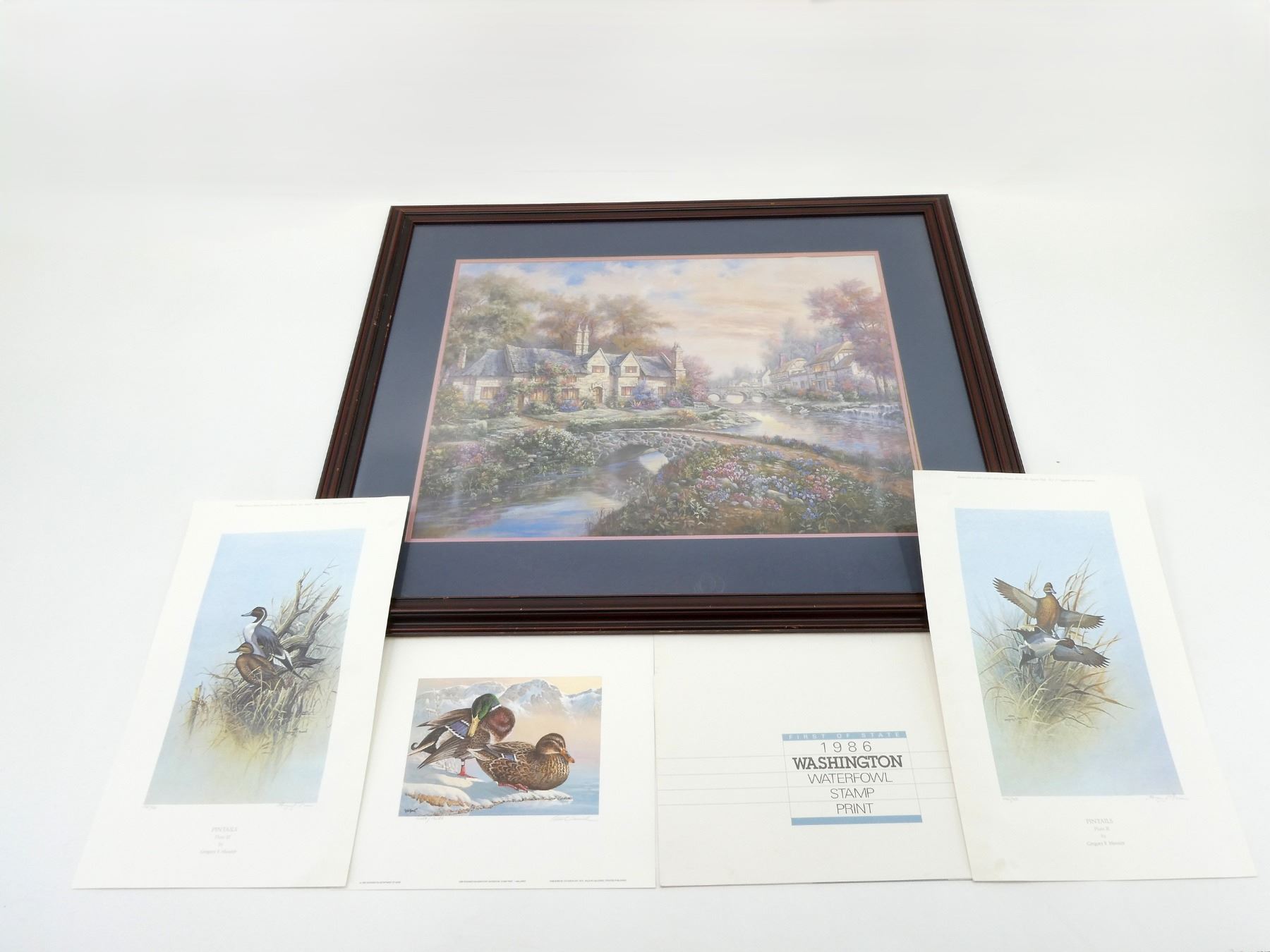 LOT INCLUDES; (1) "1986 WASHINGTON WATERFOWL STAMP PRINT" BY KEITH WARRICK, WITH 1986 WASHINGTON WATERFOWL STAMP, PRINT NO. 11,054/12,180, SIGNED BY ARTIST, IN COLOUR, PUBLISHED BY VOYAGEUR ART, NATL. WILDLIFE GALLERIES, FRONTIER PUBLISHING, COPYRIGHT 1986, SHOWS SIGNS OF WEAR AND TEAR, OVERALL LENGTH APPROX. 14" X 12", (1) "PINTAILS, PLATE II" PRINT BY GREGORY F. MESSIER, PRINT NO. 242 / 950, SIGNED BY ARTIST, PUBLISHED BY PETERSON PRINTS, COPYRIGHT 1985, SHOWS SOME WEAR & TEAR, OVERALL LENGTH APPROX. 12" X 19.5", (1) "PINTAILS, PLATE III" PRINT BY GREGORY F. MESSIER, PRINT NO. 242 / 950, SIGNED BY ARTIST, PUBLISHED BY PETERSON PRINTS, COPYRIGHT 1985, SHOWS SOME WEAR & TEAR, OVERALL LENGTH APPROX. 12" X 19.5" & (1) FRAMED UNDER GLASS "RUNNING SPRINGS MANOR" COBBLESTONE HOUSE ON THE RIVER PRINT BY CARL VALENTE, OVERALL LENGTH APPROX. 39" X 33". SEE PHOTOS. *NO GUARANTEE ON GLASS FOR SHIPPING*