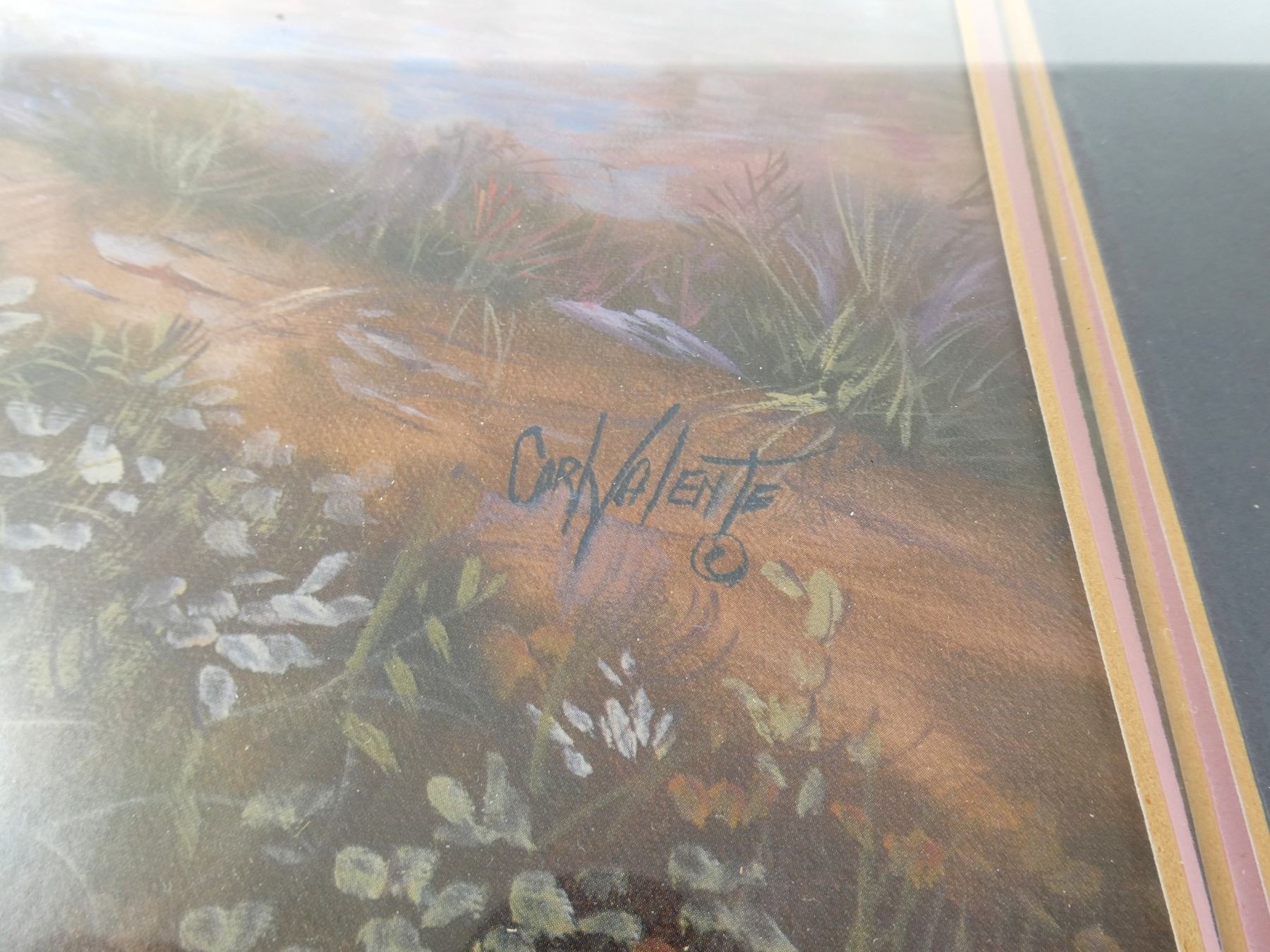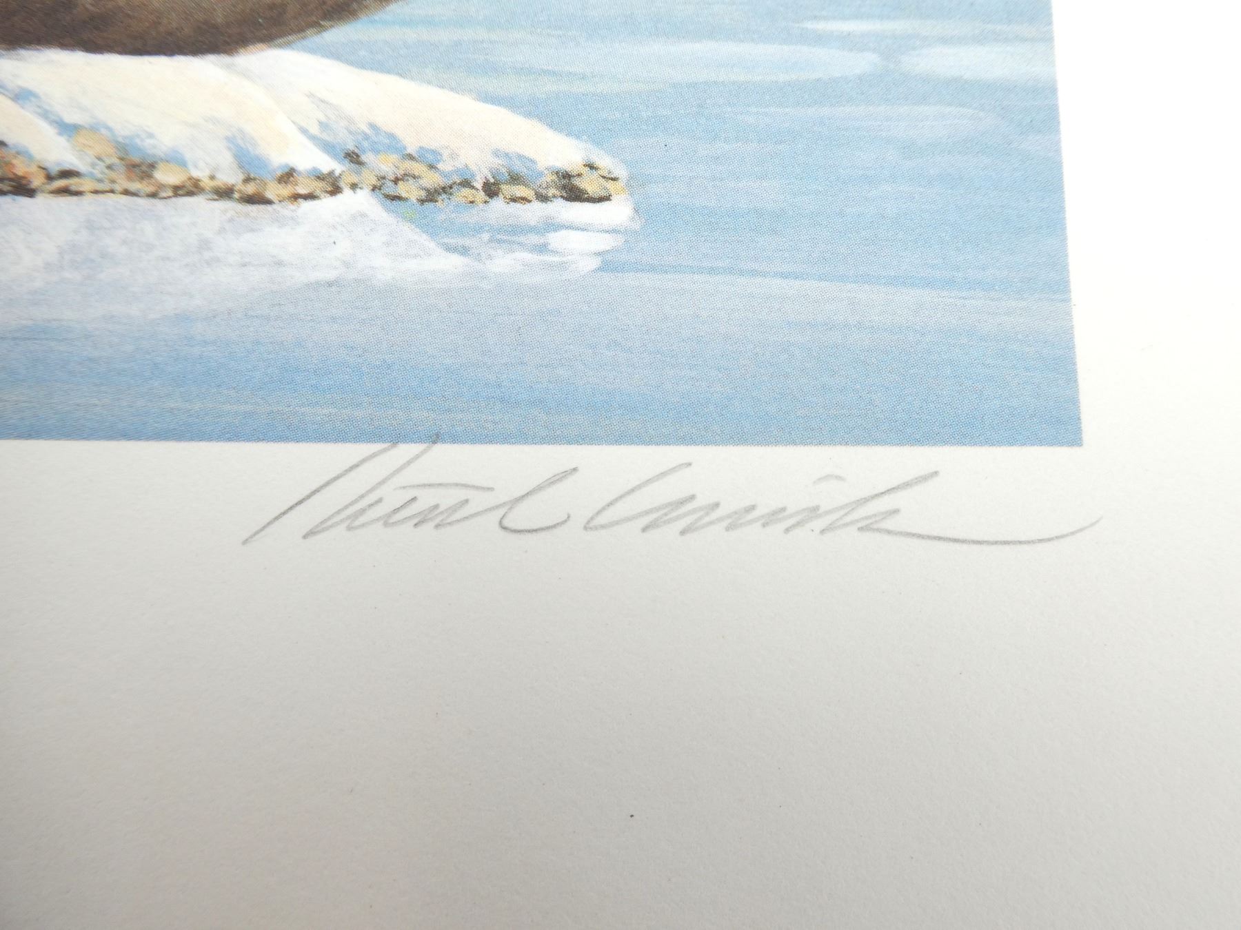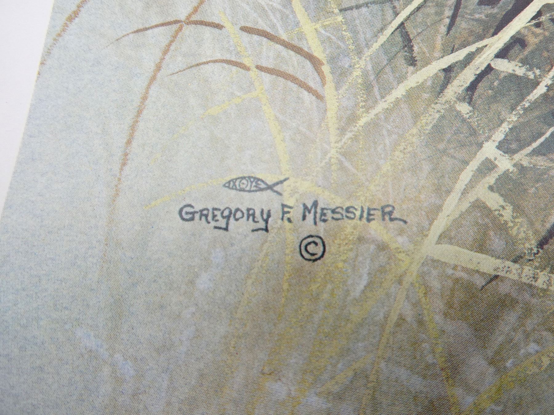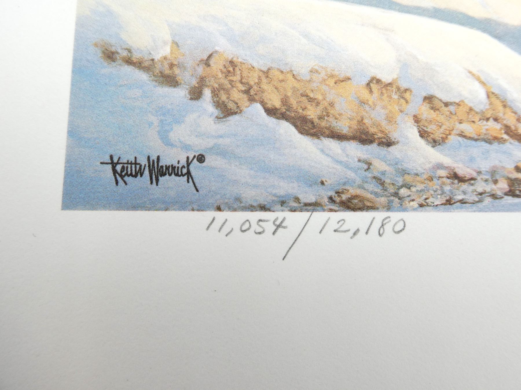 LOT INCLUDES; (1) "1986 WASHINGTON WATERFOWL STAMP PRINT" BY KEITH WARRICK, WITH 1986 WASHINGTON WATERFOWL STAMP, PRINT NO. 11,054/12,180, SIGNED BY ARTIST, IN COLOUR, PUBLISHED BY VOYAGEUR ART, NATL. WILDLIFE GALLERIES, FRONTIER PUBLISHING, COPYRIGHT 1986, SHOWS SIGNS OF WEAR AND TEAR, OVERALL LENGTH APPROX. 14" X 12", (1) "PINTAILS, PLATE II" PRINT BY GREGORY F. MESSIER, PRINT NO. 242 / 950, SIGNED BY ARTIST, PUBLISHED BY PETERSON PRINTS, COPYRIGHT 1985, SHOWS SOME WEAR & TEAR, OVERALL LENGTH APPROX. 12" X 19.5", (1) "PINTAILS, PLATE III" PRINT BY GREGORY F. MESSIER, PRINT NO. 242 / 950, SIGNED BY ARTIST, PUBLISHED BY PETERSON PRINTS, COPYRIGHT 1985, SHOWS SOME WEAR & TEAR, OVERALL LENGTH APPROX. 12" X 19.5" & (1) FRAMED UNDER GLASS "RUNNING SPRINGS MANOR" COBBLESTONE HOUSE ON THE RIVER PRINT BY CARL VALENTE, OVERALL LENGTH APPROX. 39" X 33". SEE PHOTOS. *NO GUARANTEE ON GLASS FOR SHIPPING*