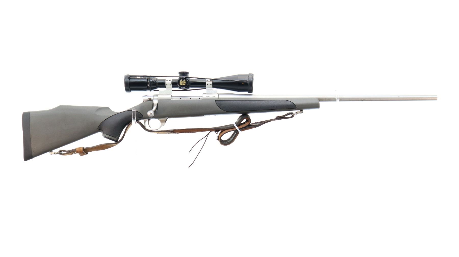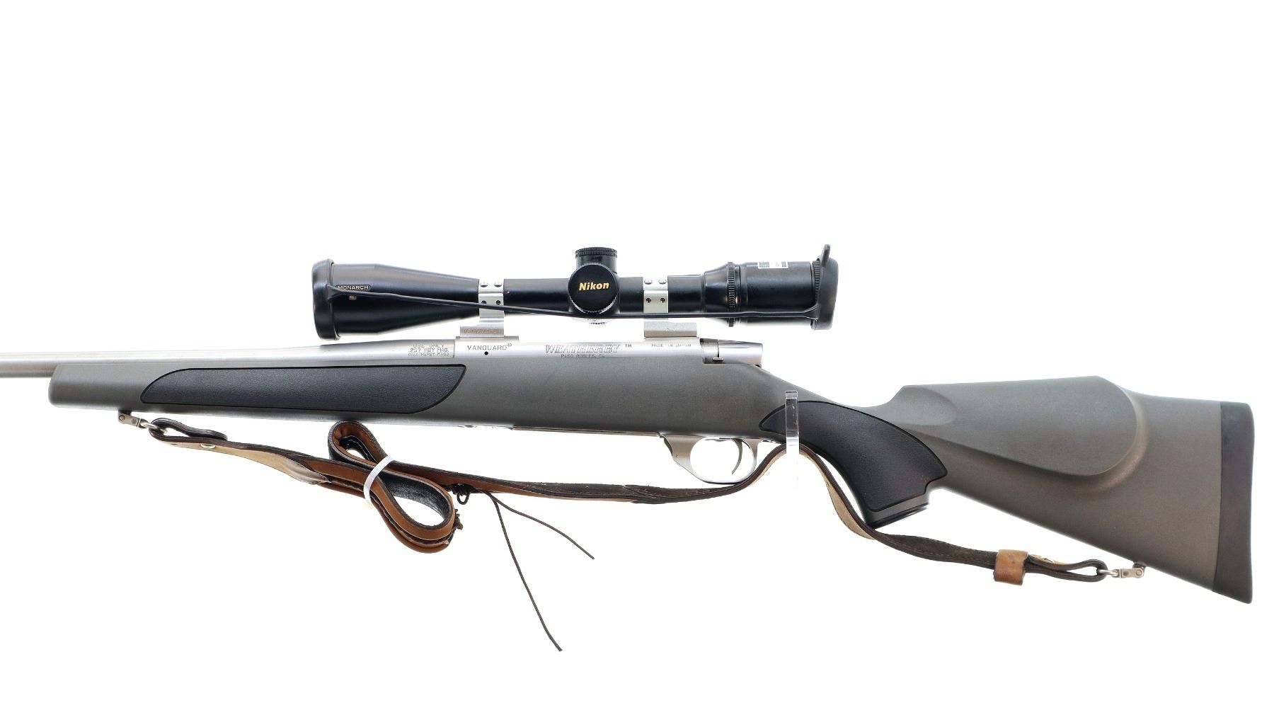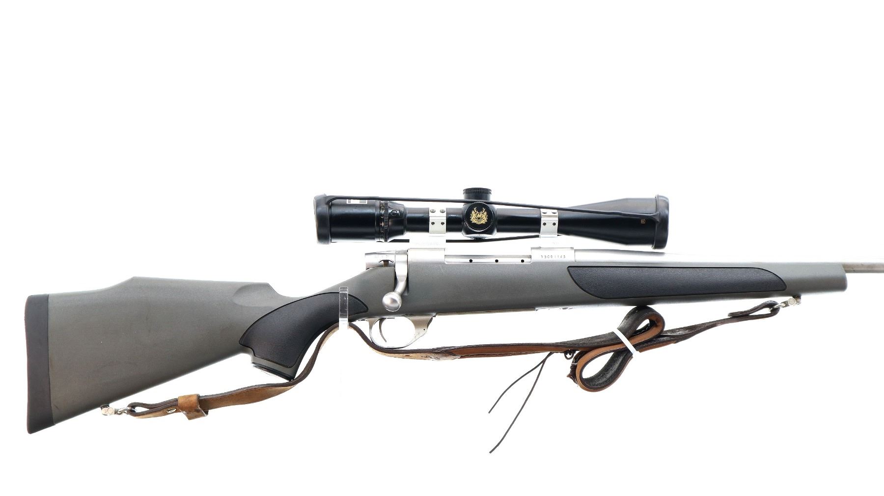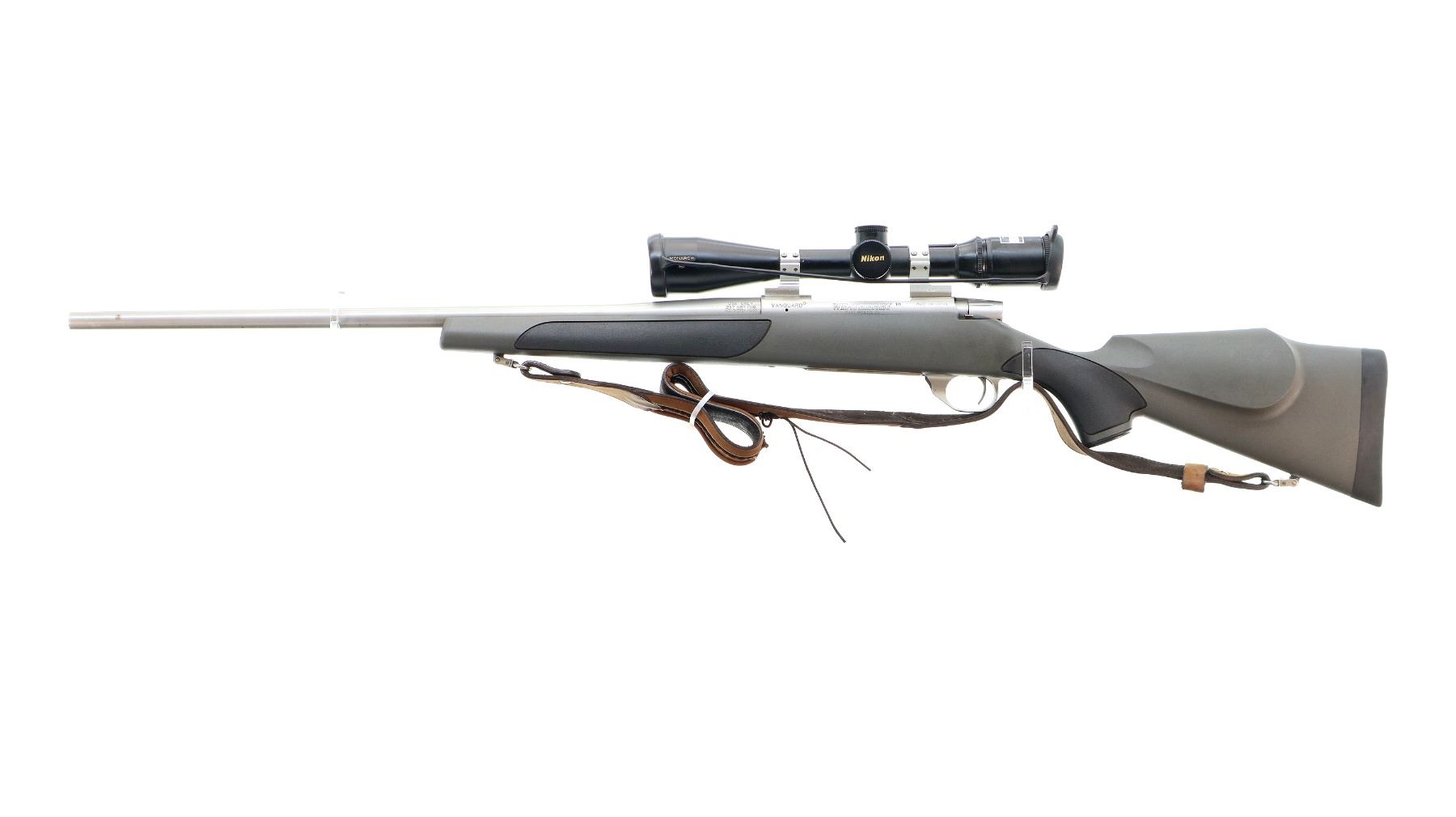 Main Description: No sights, stainless finish, receiver drilled and tapped with Talley rings, Nikon Monarch 4-16x42 scope installed, clear optics with BDC reticle, fluted bolt with checkered knob. One piece grey synthetic stock, textured black forearm and pistol grip panels, cheek rest, black rubber recoil pad, grip cap, hinged floor plate, sling swivels with brown leather sling.