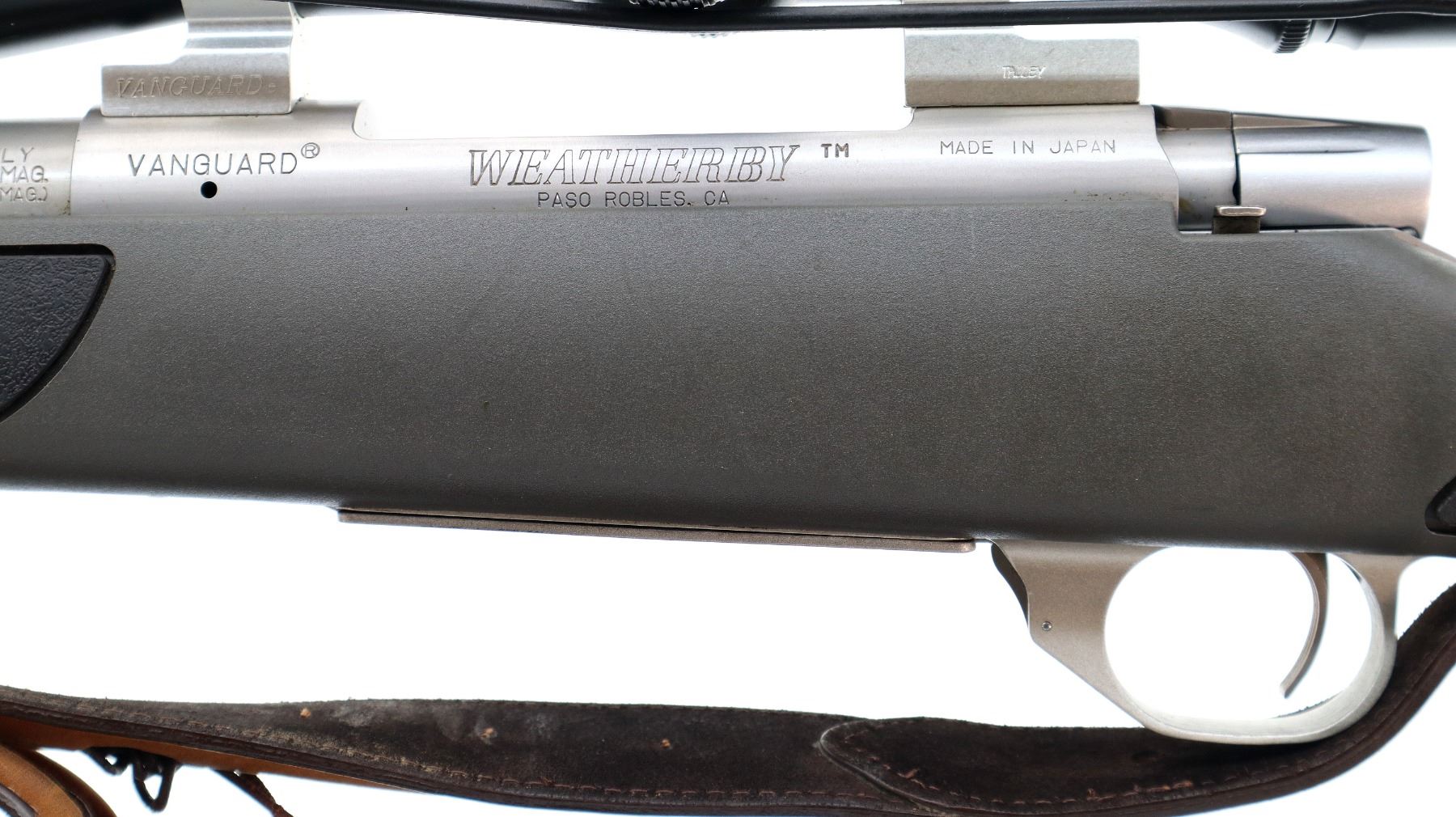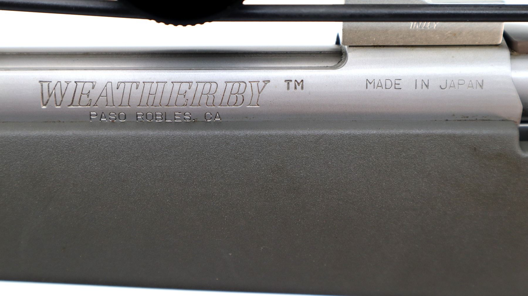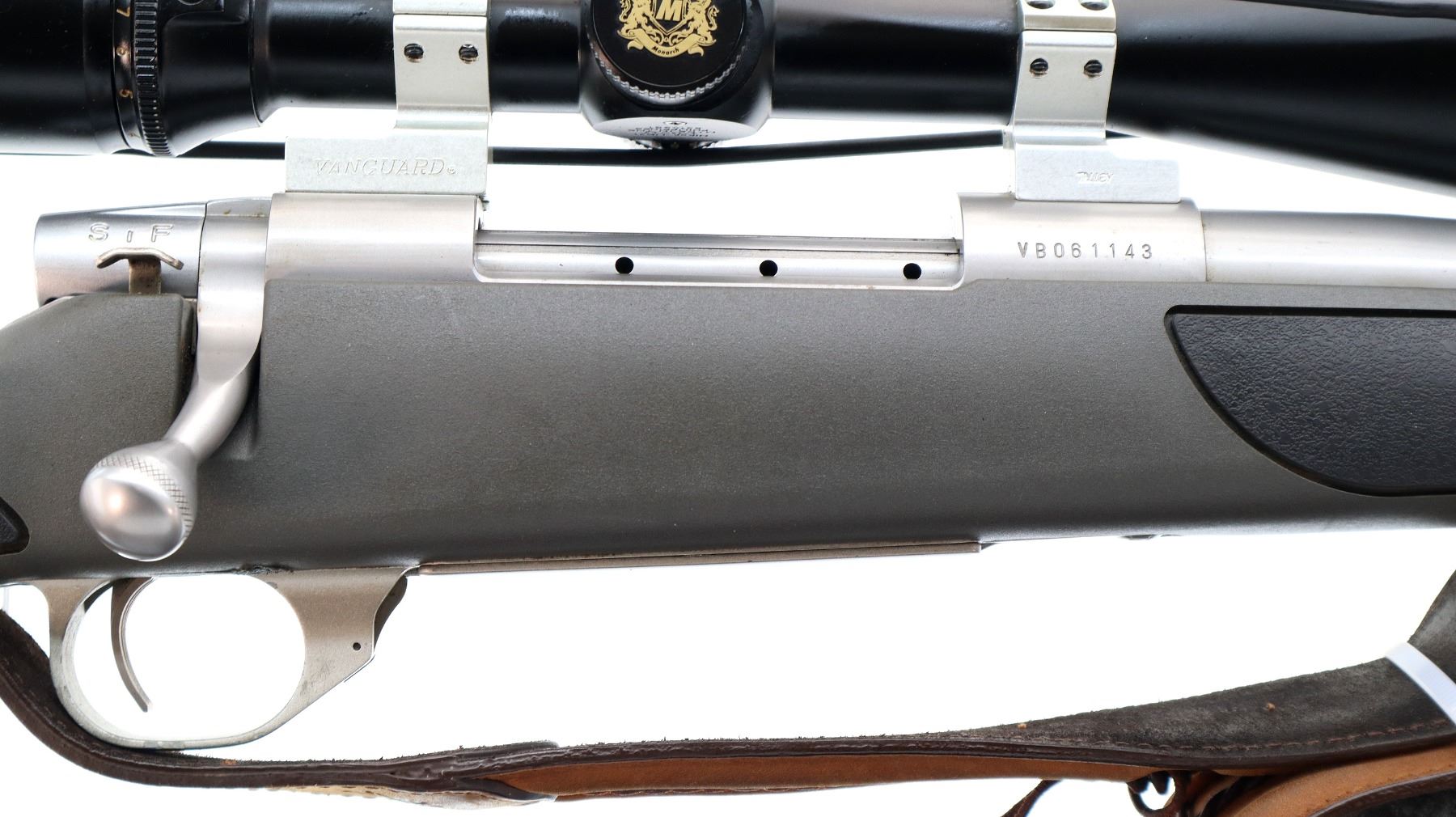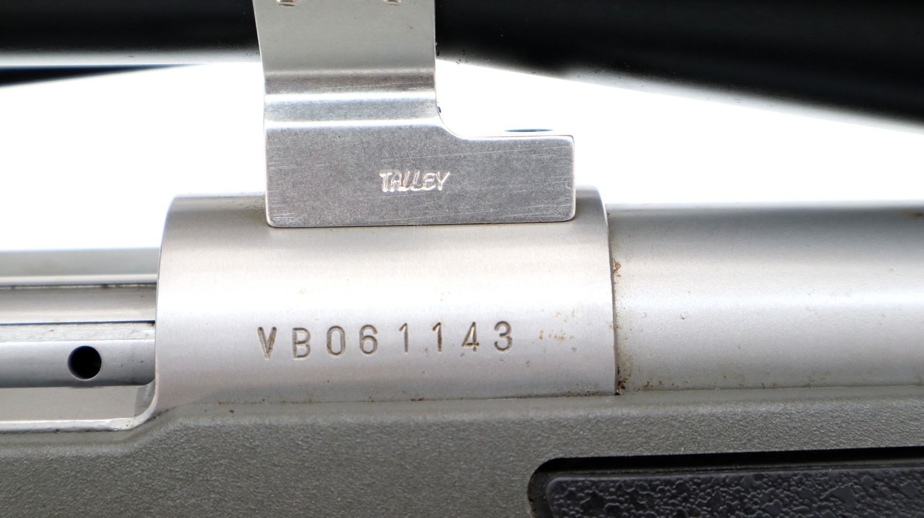 Main Description: No sights, stainless finish, receiver drilled and tapped with Talley rings, Nikon Monarch 4-16x42 scope installed, clear optics with BDC reticle, fluted bolt with checkered knob. One piece grey synthetic stock, textured black forearm and pistol grip panels, cheek rest, black rubber recoil pad, grip cap, hinged floor plate, sling swivels with brown leather sling.