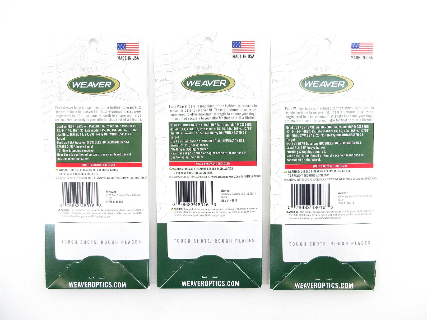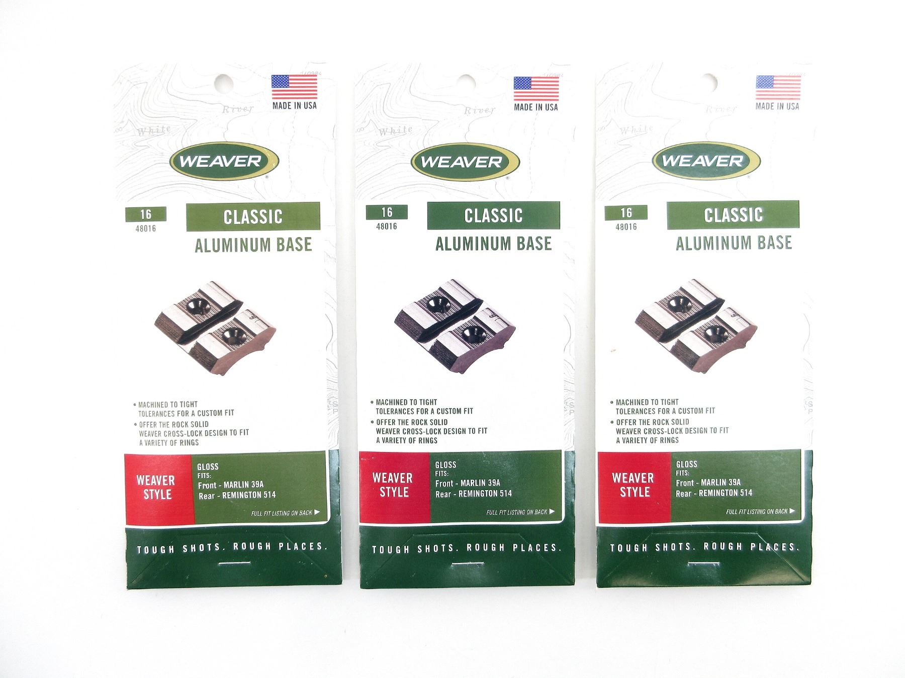 LOT INCLUDES; (3) SCOPE RING BASES, GLOSS ALUMINIUM CONSTRUCTION, FITS MARLIN 39A (FRONT) / REMINGTON 514 (REAR), PART #: 48016, APPEARS NEW OLD STOCK IN ORIGINAL SEALED PACKAGING, MAY NOT BE COMPLETE. MAY REQUIRE FITTING. SEE PHOTOS.