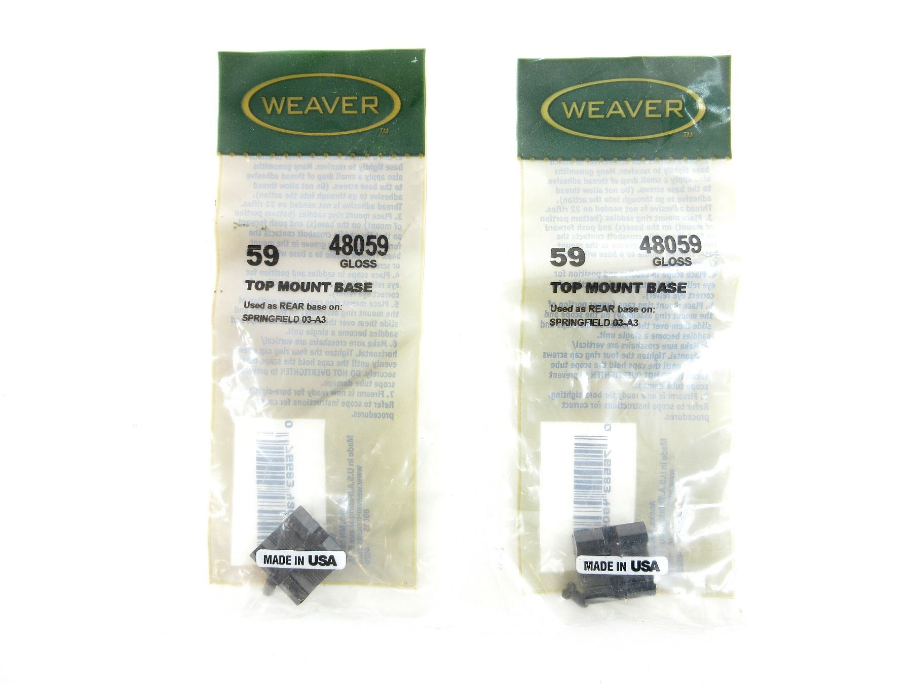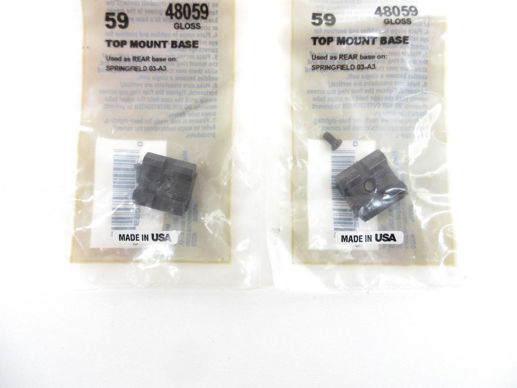 LOT INCLUDES; (2) SCOPE RING BASES, GLOSS BLACK ALLOY CONSTRUCTION, FITS SPRINGFIELD 03-A3, PART #: 48059, APPEARS NEW OLD STOCK IN ORIGINAL PACKAGING, MAY NOT BE COMPLETE. MAY REQUIRE FITTING. SEE PHOTOS.