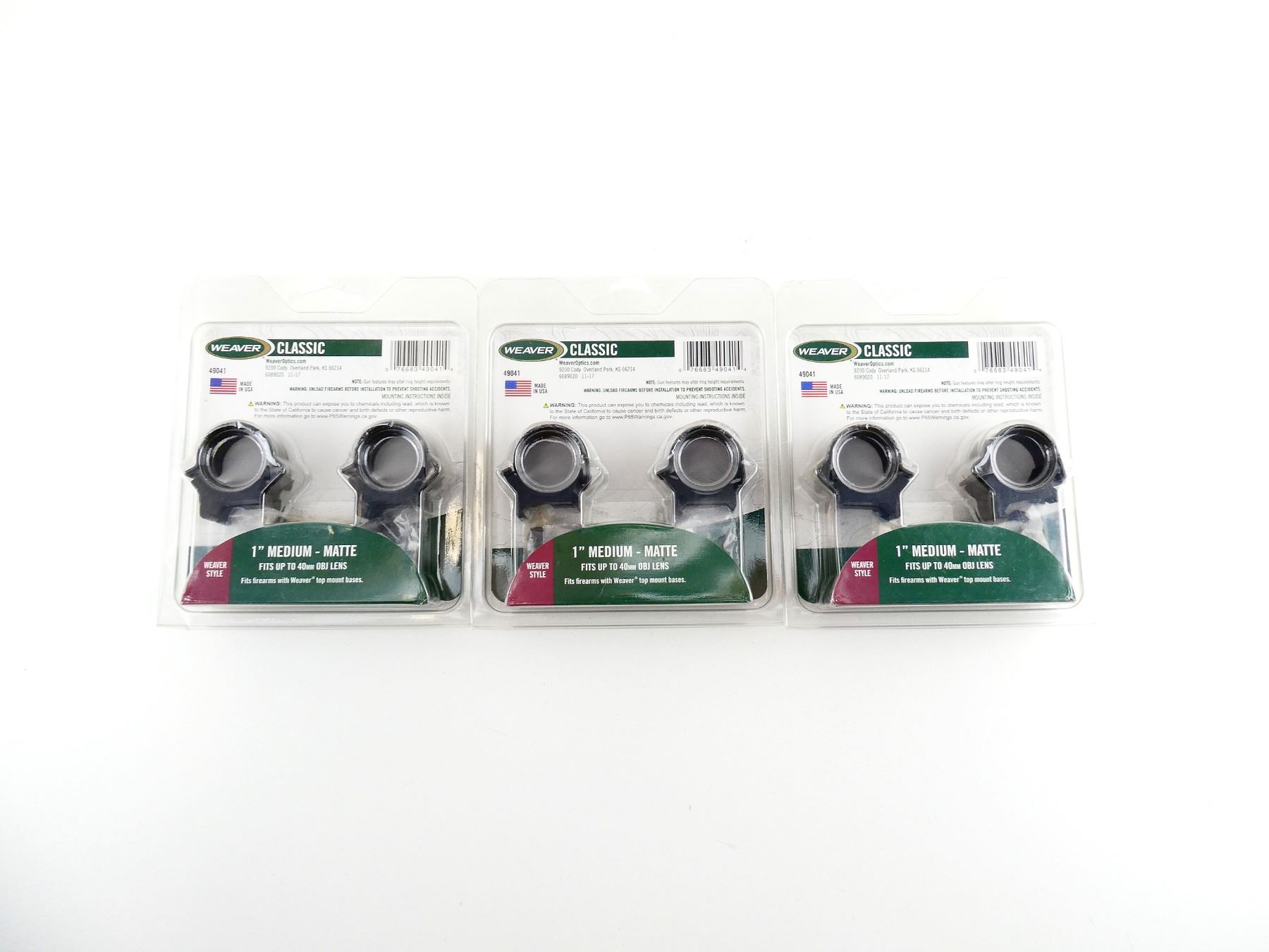 LOT INCLUDES; (3) MED CLASSIC RINGS, 1" DIAMETER, MATTE, FITS UP TO 40MM OBJ LENS, ITEM #: 49041, MAY NOT BE COMPLETE / PIECES MAY BE MISSING, IN ORIGINAL PACKAGING. MAY REQUIRE FITTING. SEE PHOTOS.