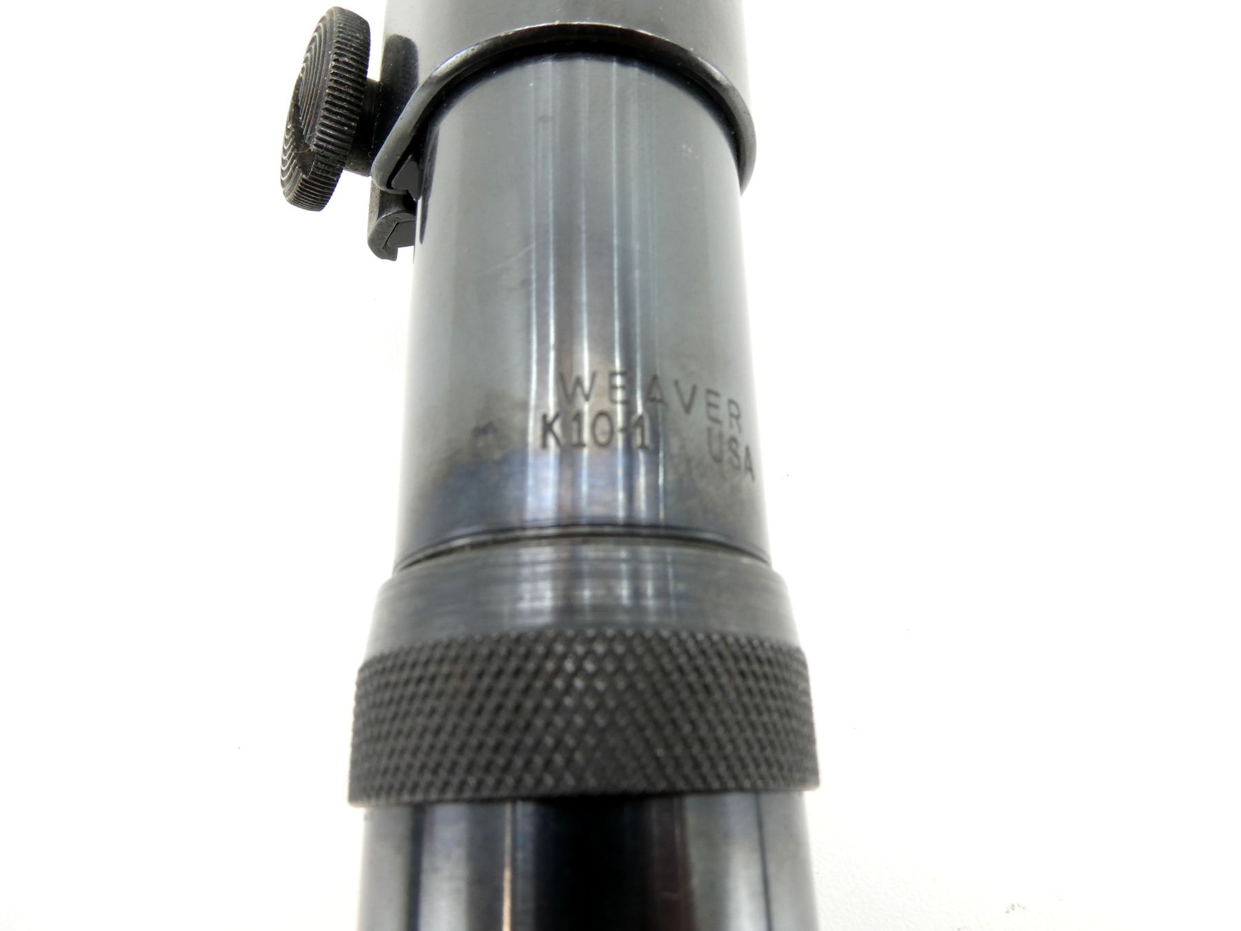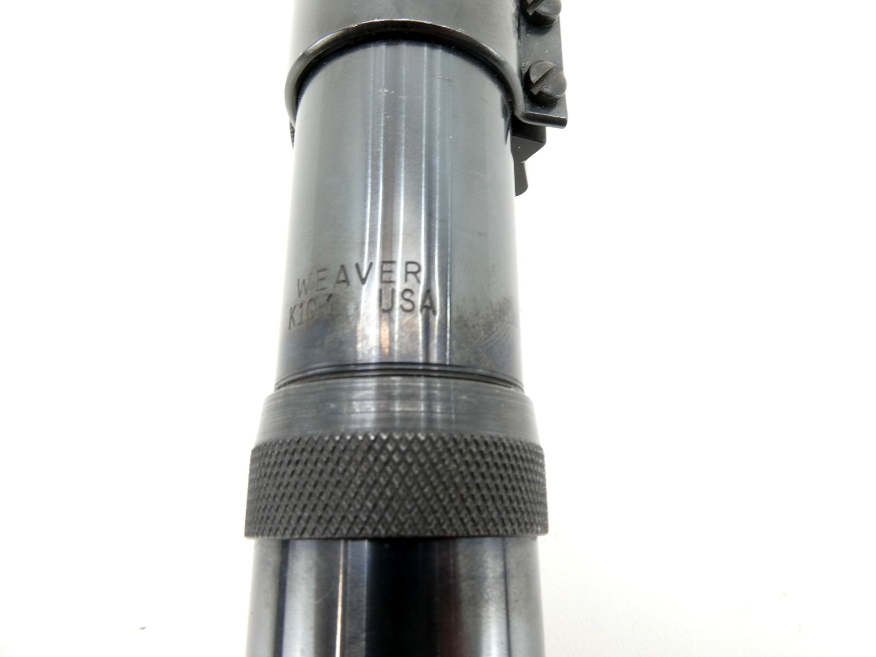 (1) CLEAR OPTICS, EL PASO DUPLEX RETICLE, 1" TUBE DIAMETER, WORKING MAGNIFICATION RING, WINDAGE & ELEVATION KNOBS TURN, MARKED: "WEAVER K10-1", ETC., SHOWS SOME WEAR & TEAR / USE MARKS, WITH 1" SCOPE RINGS ATTACHED. MAY REQUIRE FITTING. SEE PHOTOS.