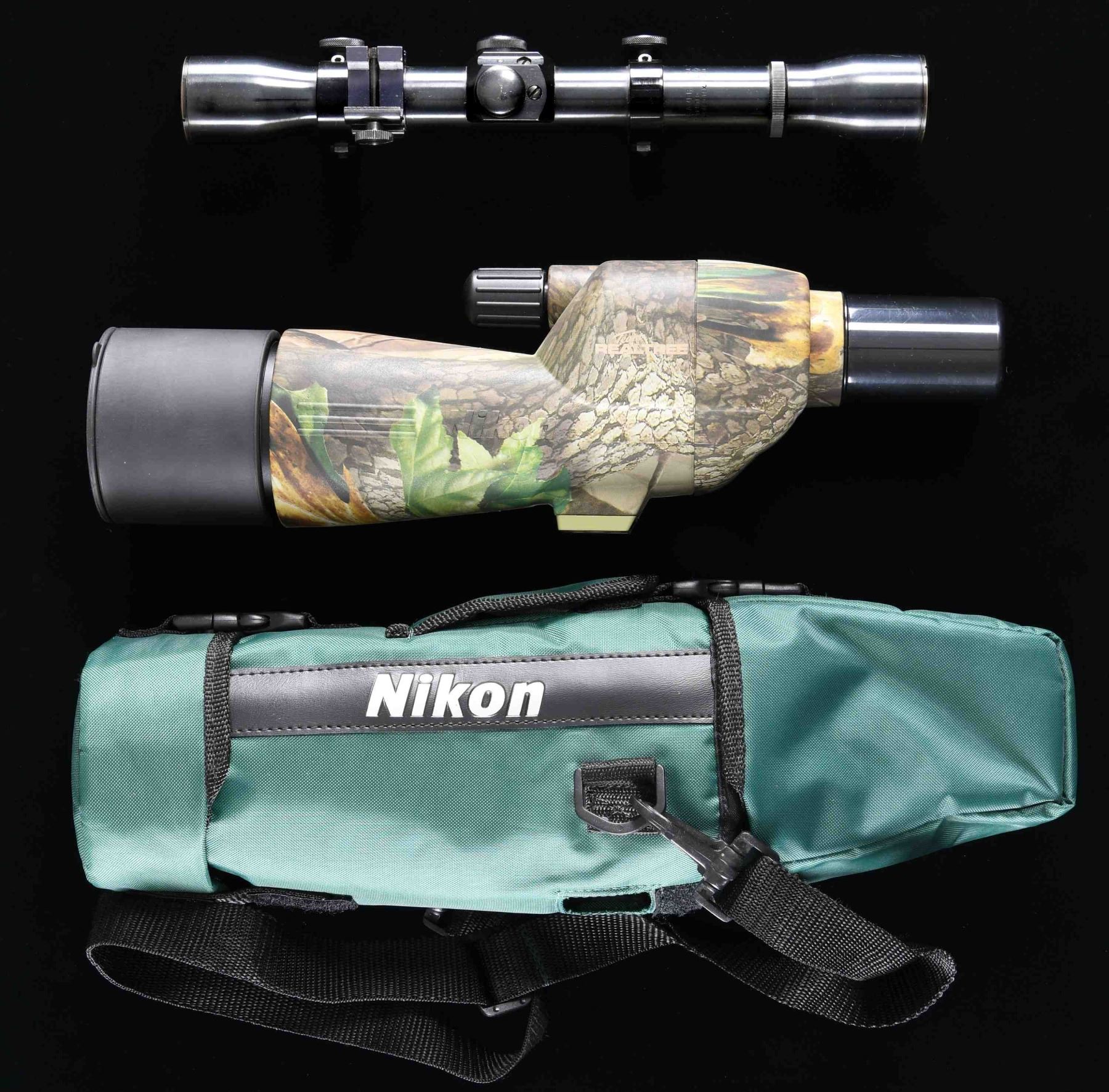 1) Weaver K4, steel, 1", crosshair scope having 1 Weaver ring & 2 custom Kesselrings. Scope has very good finish with serviceable optics. 2) Nikon Team Realtree 15-45x60 spotting scope. REALTREE Hardwoods Green HD camo finish. Comes with lens covers & green nylon sleeve/carrying case. All aspects near excellent. (02-24604/MD). $100-200.