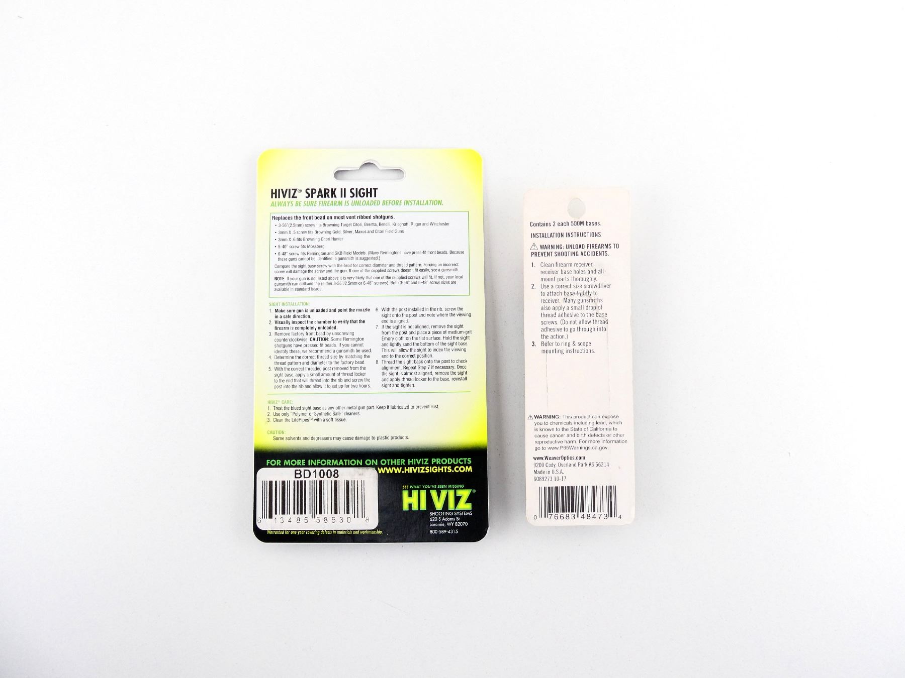 LOT INCLUDES; (1) SET OF SCOPE RING BASES, MATTE BLACK ALLOY CONSTRUCTION, PART #: 48473, NEW OLD STOCK IN ORIGINAL SEALED PACKAGING & (1) HIVIZ SPARK II SHOTGUN BEAD, VARIOUS SIZE BEADS, PART #: BD1008, NEW OLD STOCK IN ORIGINAL SEALED PACKAGING. MAY REQUIRE FITTING. SEE PHOTOS.