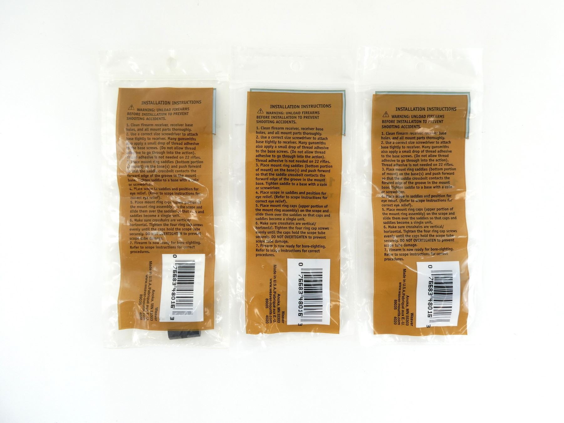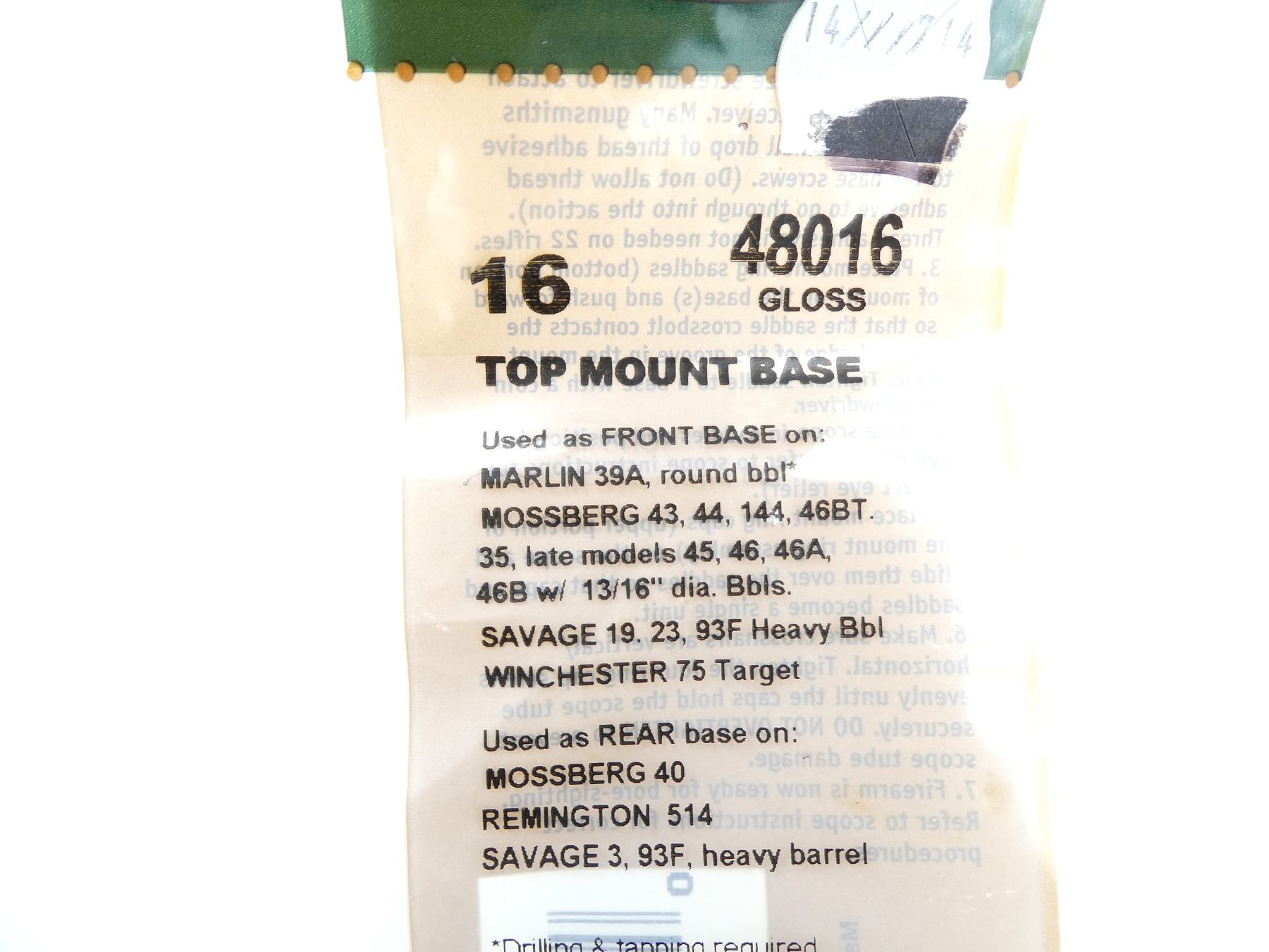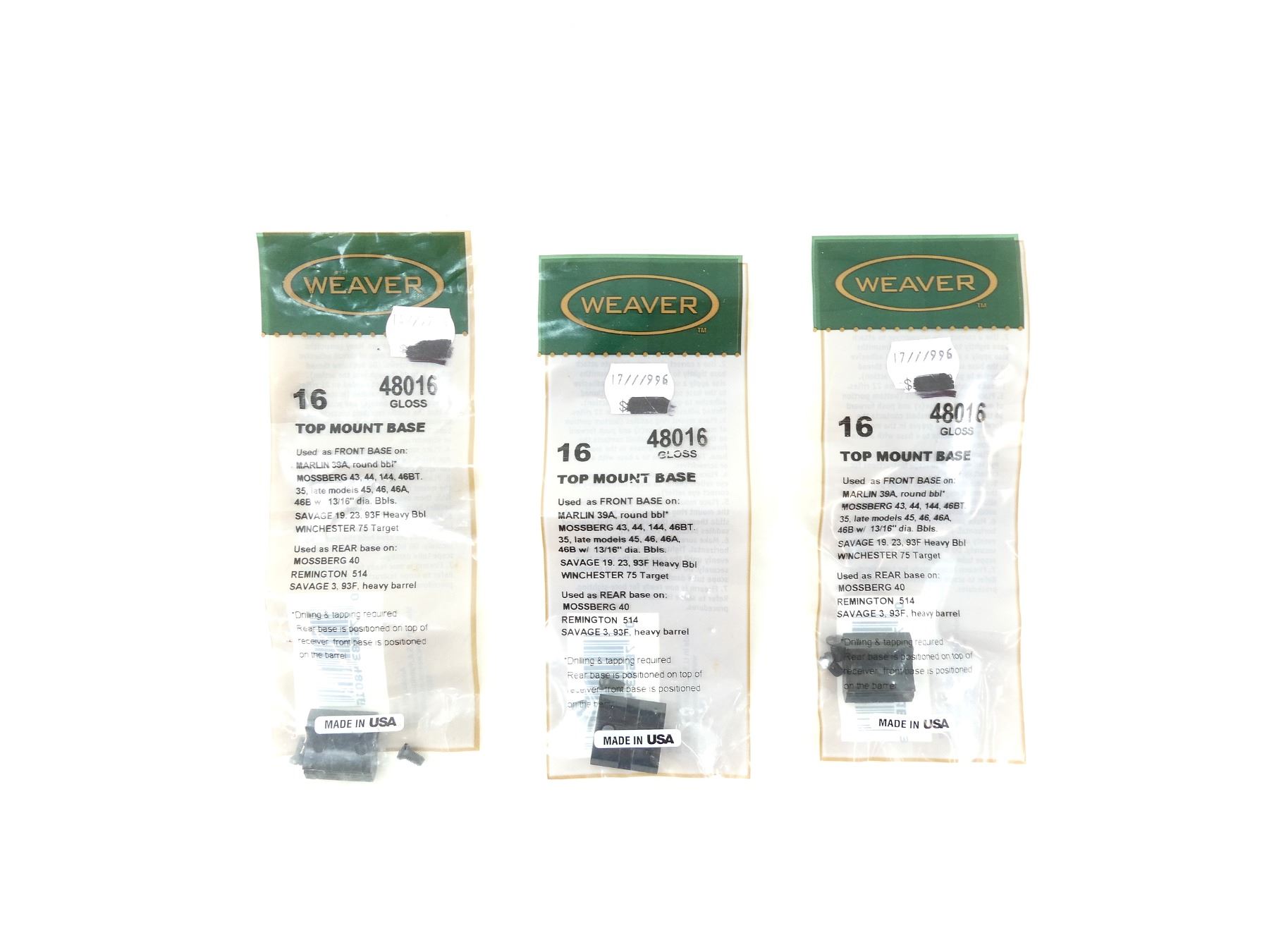 LOT INCLUDES; (3) WEAVER FRONT / REAR TOP MOUNT BASES, NO. 16, GLOSS, MODEL #: 48016, TWO NEW OLD STOCK SEALED IN ORIGINAL PACKAGING. MAY REQUIRE FITTING. SEE PHOTOS.