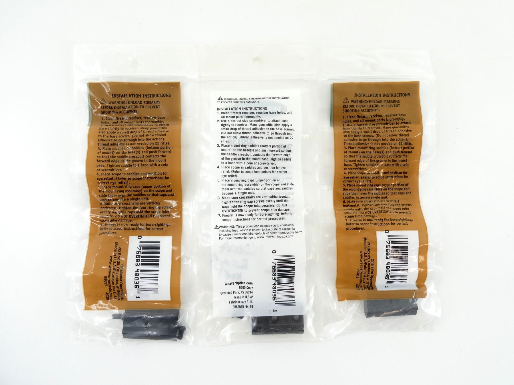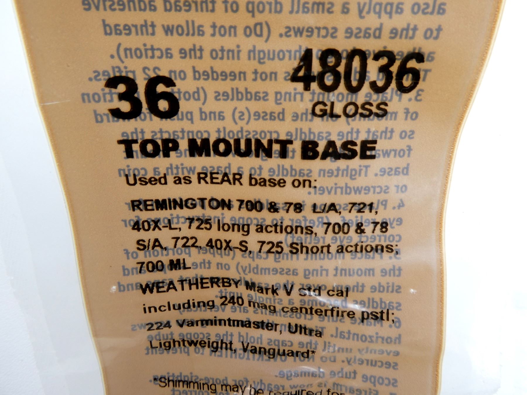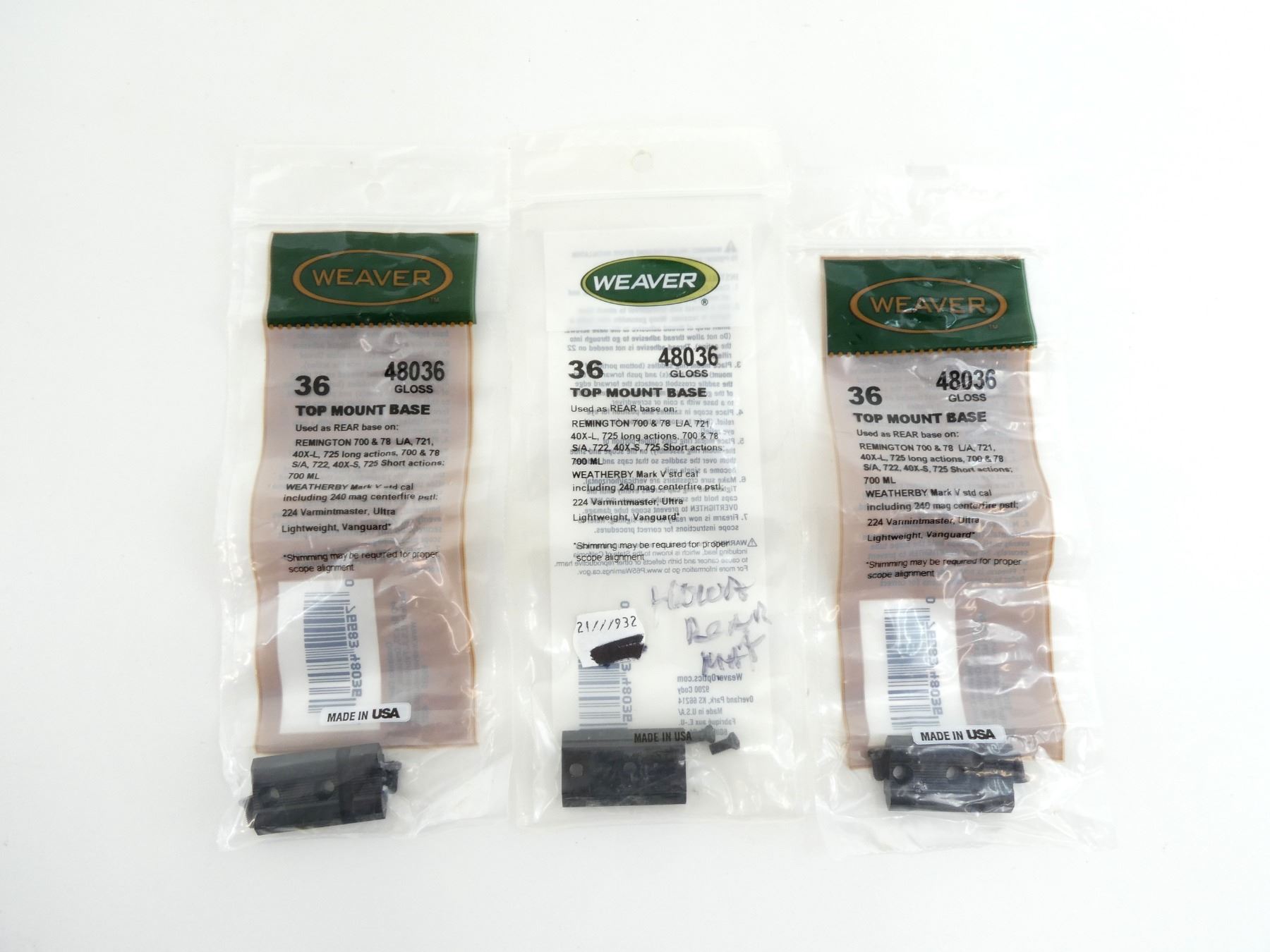 LOT INCLUDES; (3) WEAVER REAR TOP MOUNT BASES, NO. 36, GLOSS, MODEL #: 48036, NEW OLD STOCK, SEALED IN ORIGINAL PACKAGING. MAY REQUIRE FITTING. SEE PHOTOS.