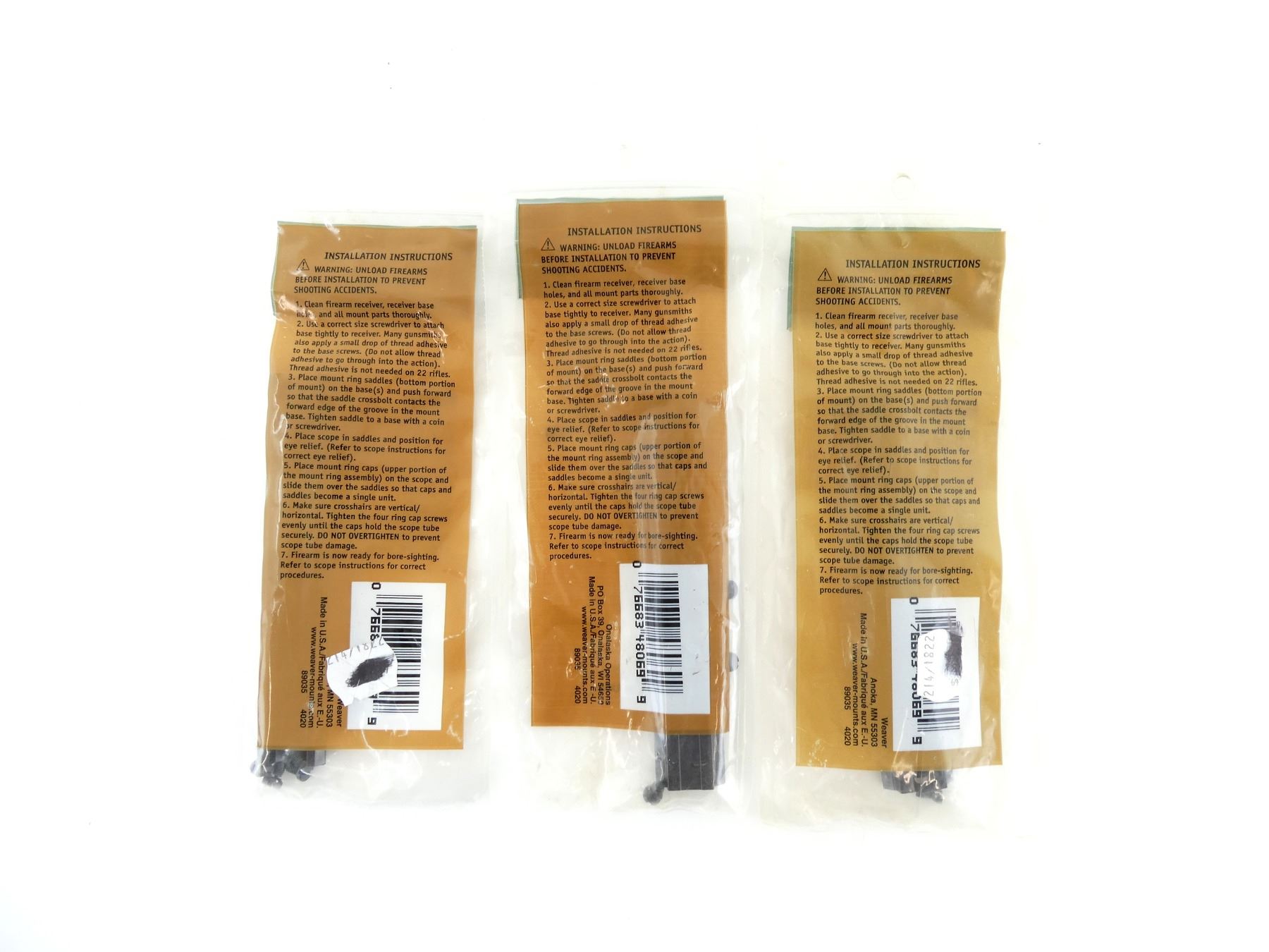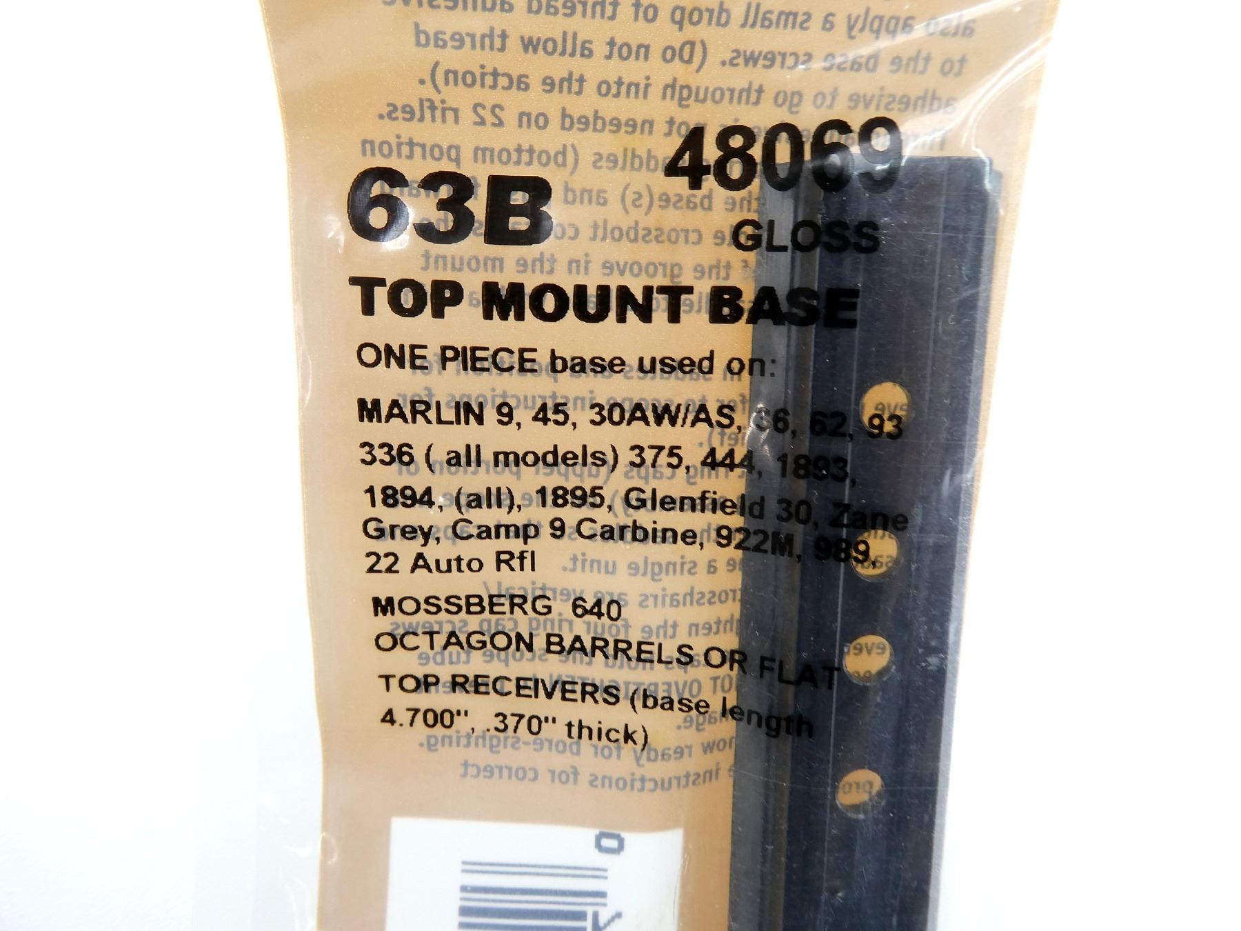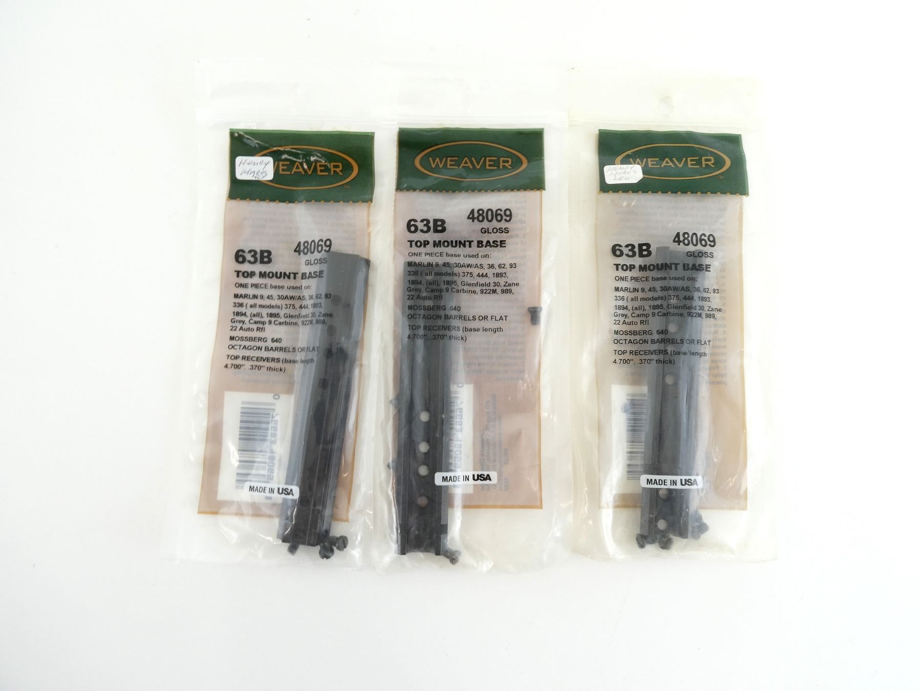 LOT INCLUDES; (3) WEAVER TOP MOUNT BASES, NO. 63B, GLOSS, MODEL #: 48069, NEW OLD STOCK, SEALED IN ORIGINAL PACKAGING. MAY REQUIRE FITTING. SEE PHOTOS.
