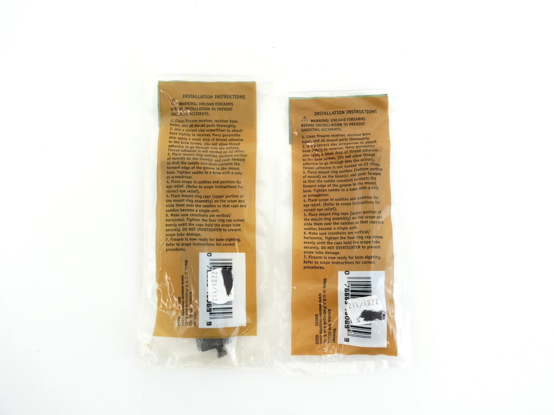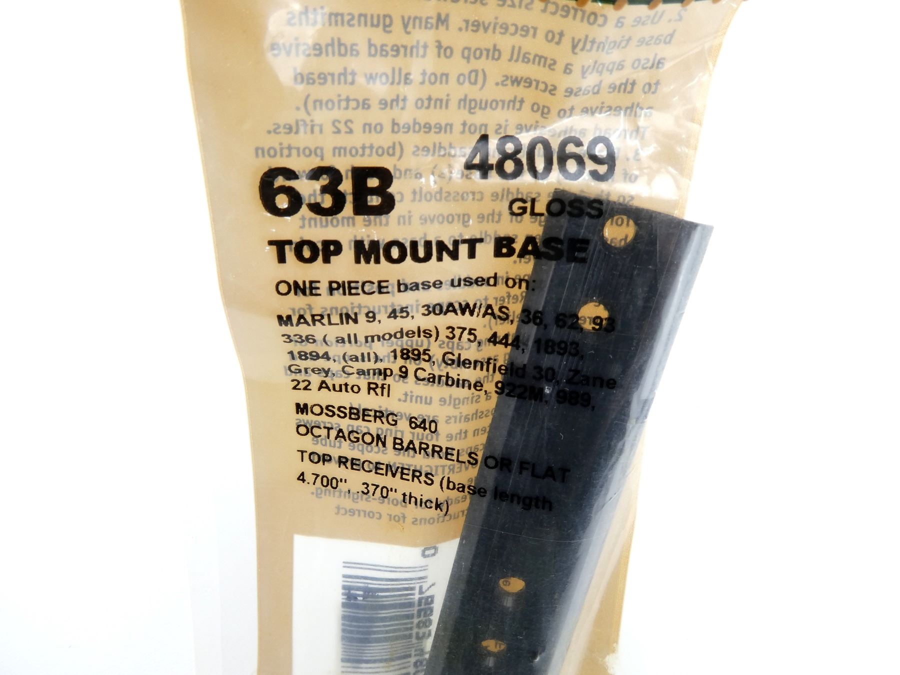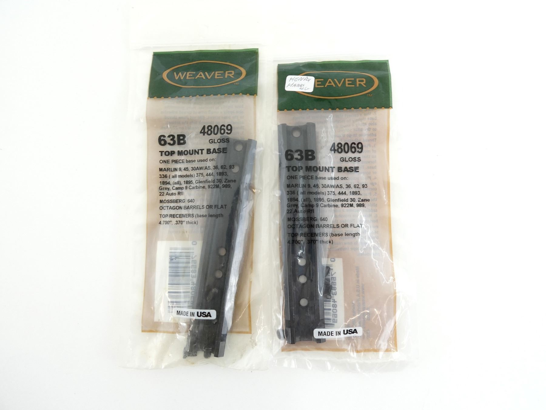 LOT INCLUDES; (2) WEAVER TOP MOUNT BASES, NO. 63B, GLOSS, MODEL #: 48069, NEW OLD STOCK, SEALED IN ORIGINAL PACKAGING. MAY REQUIRE FITTING. SEE PHOTOS.