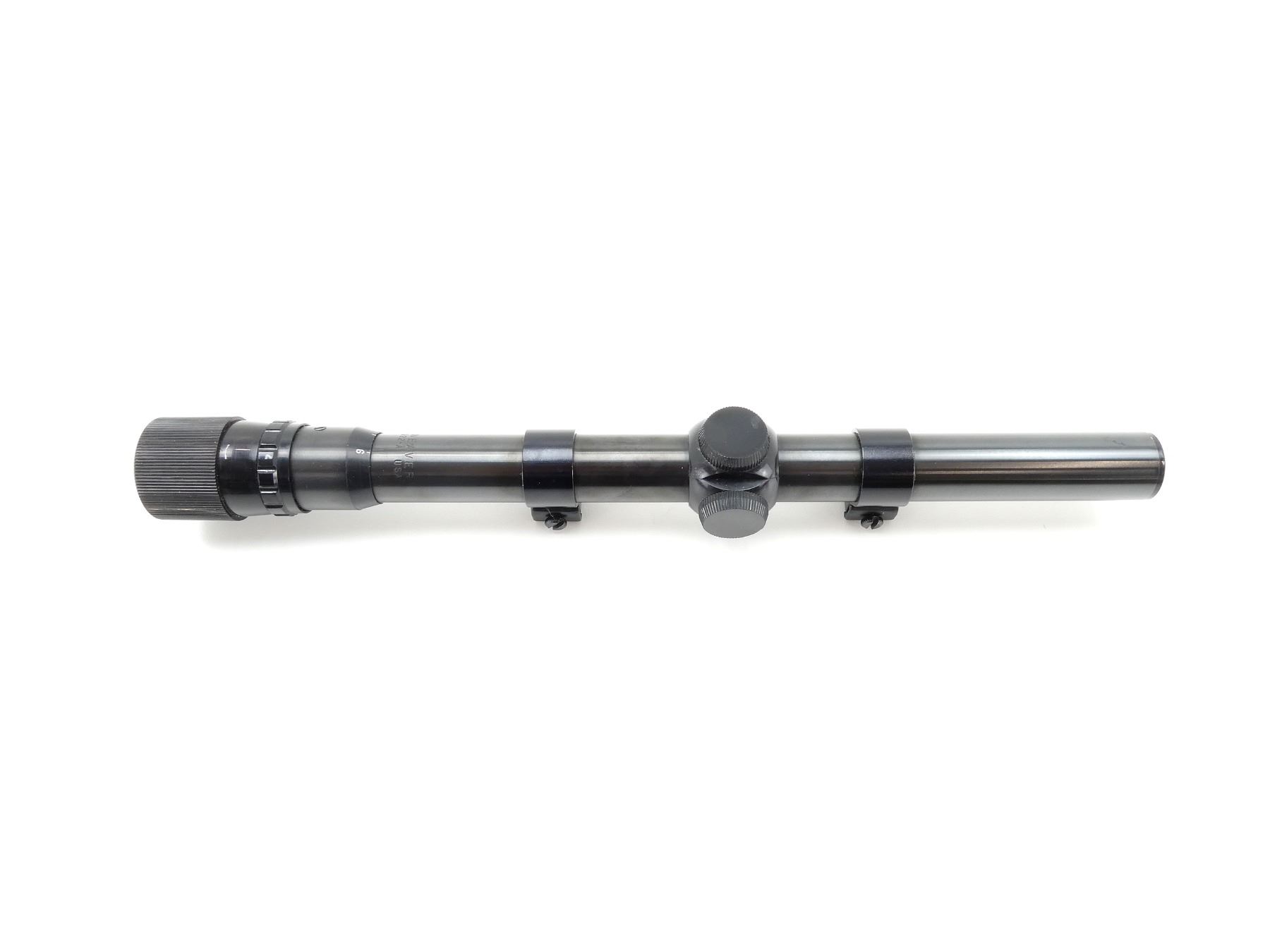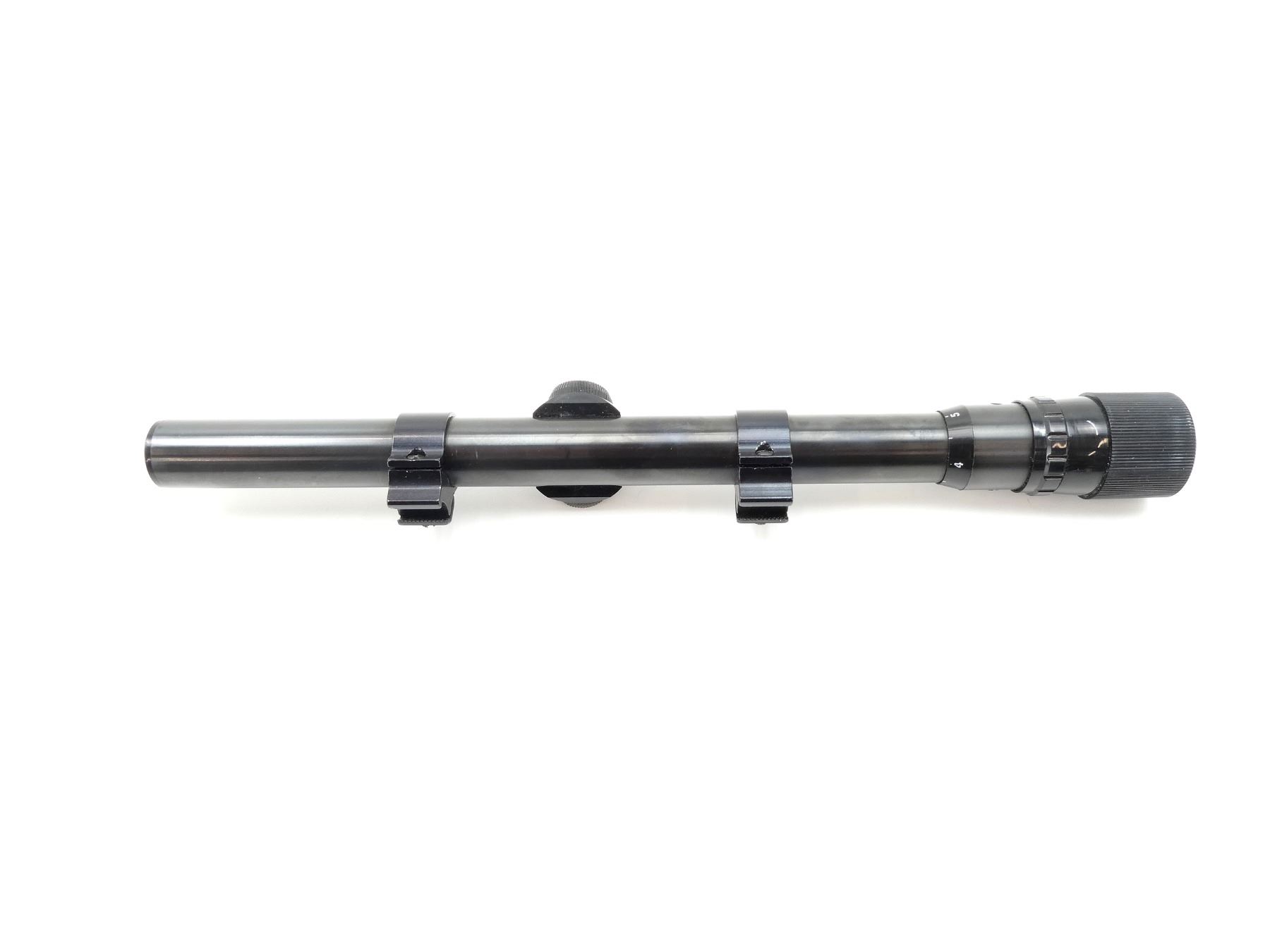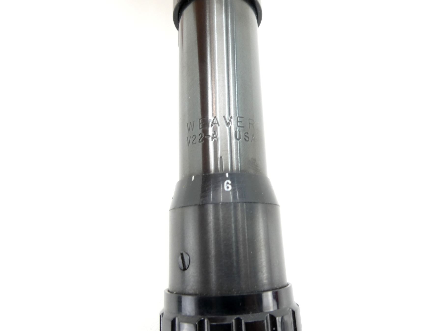 (1) CLEAR OPTICS, DUPLEX RETICLE, 22MM TUBE DIAMETER, WORKING MAGNIFICATION RING, WINDAGE & ELEVATION KNOBS TURN, MARKED: "WEAVER V22-A", ETC., SHOWS SOME WEAR & TEAR / USE MARKS, WITH 1" SCOPE RINGS ATTACHED. MAY REQUIRE FITTING. SEE PHOTOS.