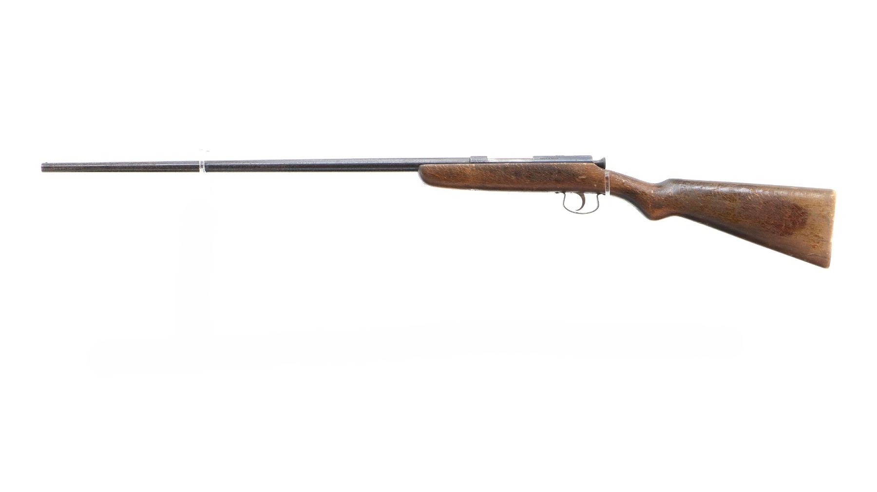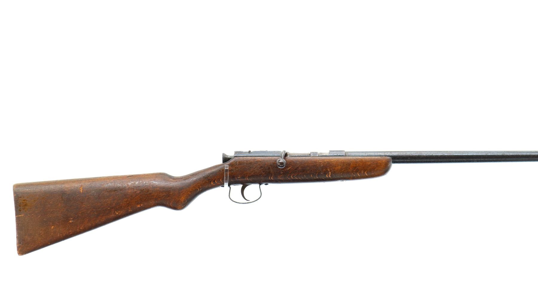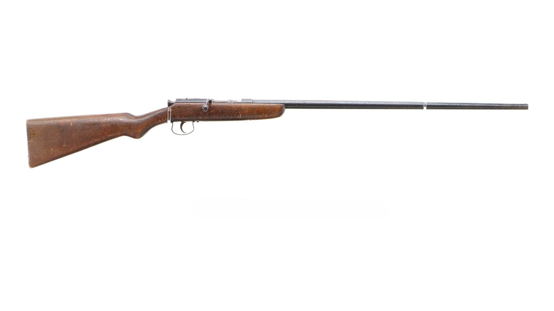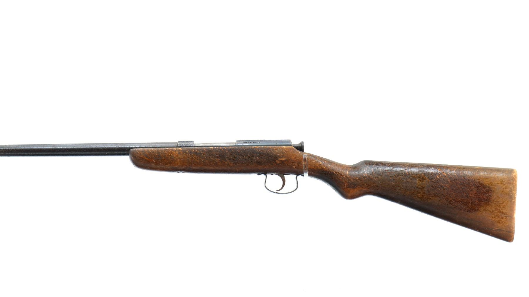 Main Description: Silver bead, blued finish, round barrel, bolt comes out of receiver requires adjustment or repair, extractor is present. One piece wood stock, pistol grip, chipped behind receiver, smooth butt.