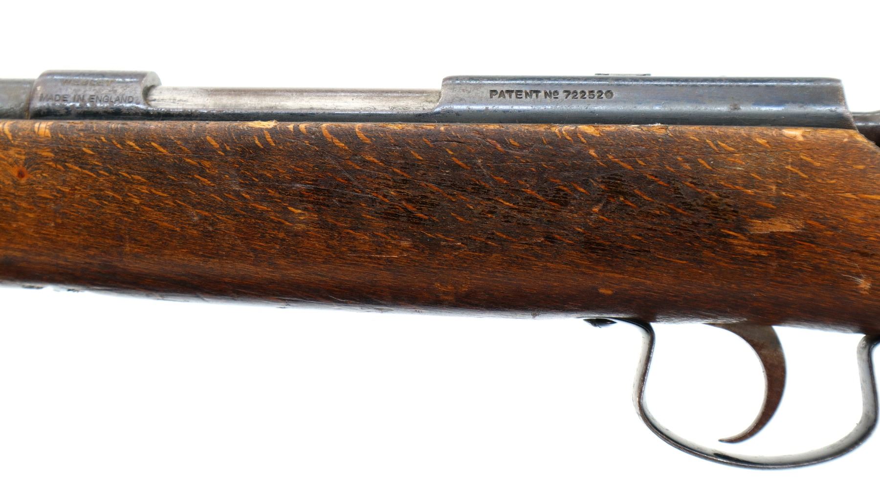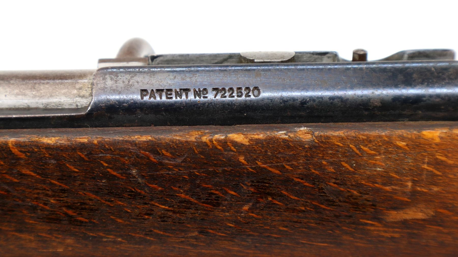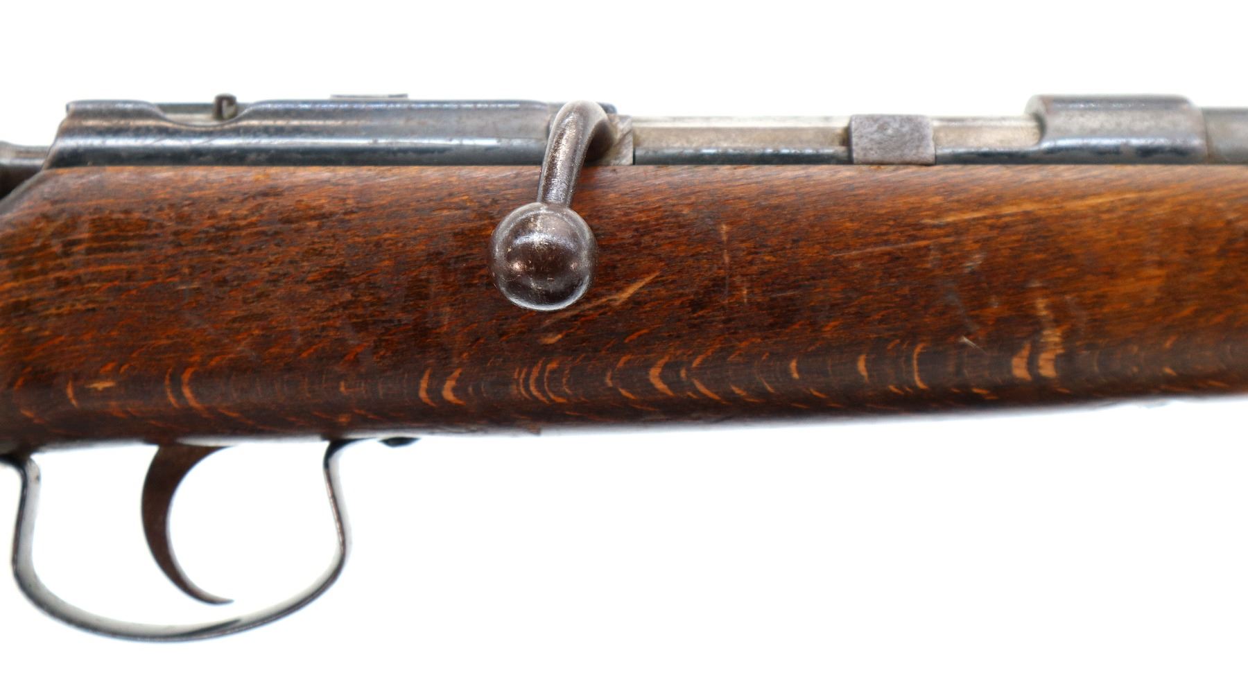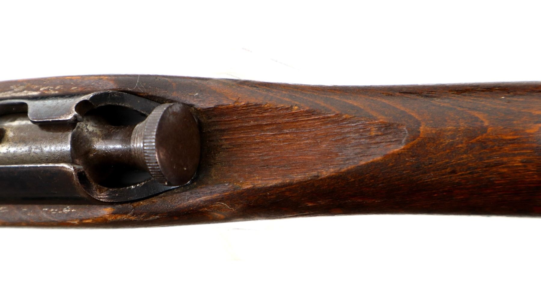 Main Description: Silver bead, blued finish, round barrel, bolt comes out of receiver requires adjustment or repair, extractor is present. One piece wood stock, pistol grip, chipped behind receiver, smooth butt.
