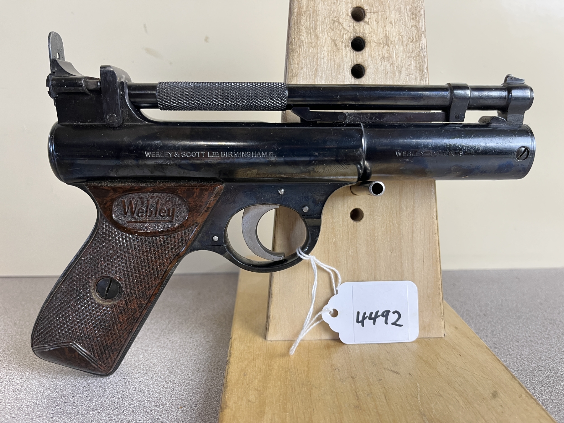 CONDITION: VG OVERALL INCL BORE. SPECS: APPROX 6-1/2IN BBL. <500FPS. EXTRAS: ORIGINAL BOX, SPARE BARREL, 500X WEBLEY .22 SPECIAL PELLETS. S/N: 1431