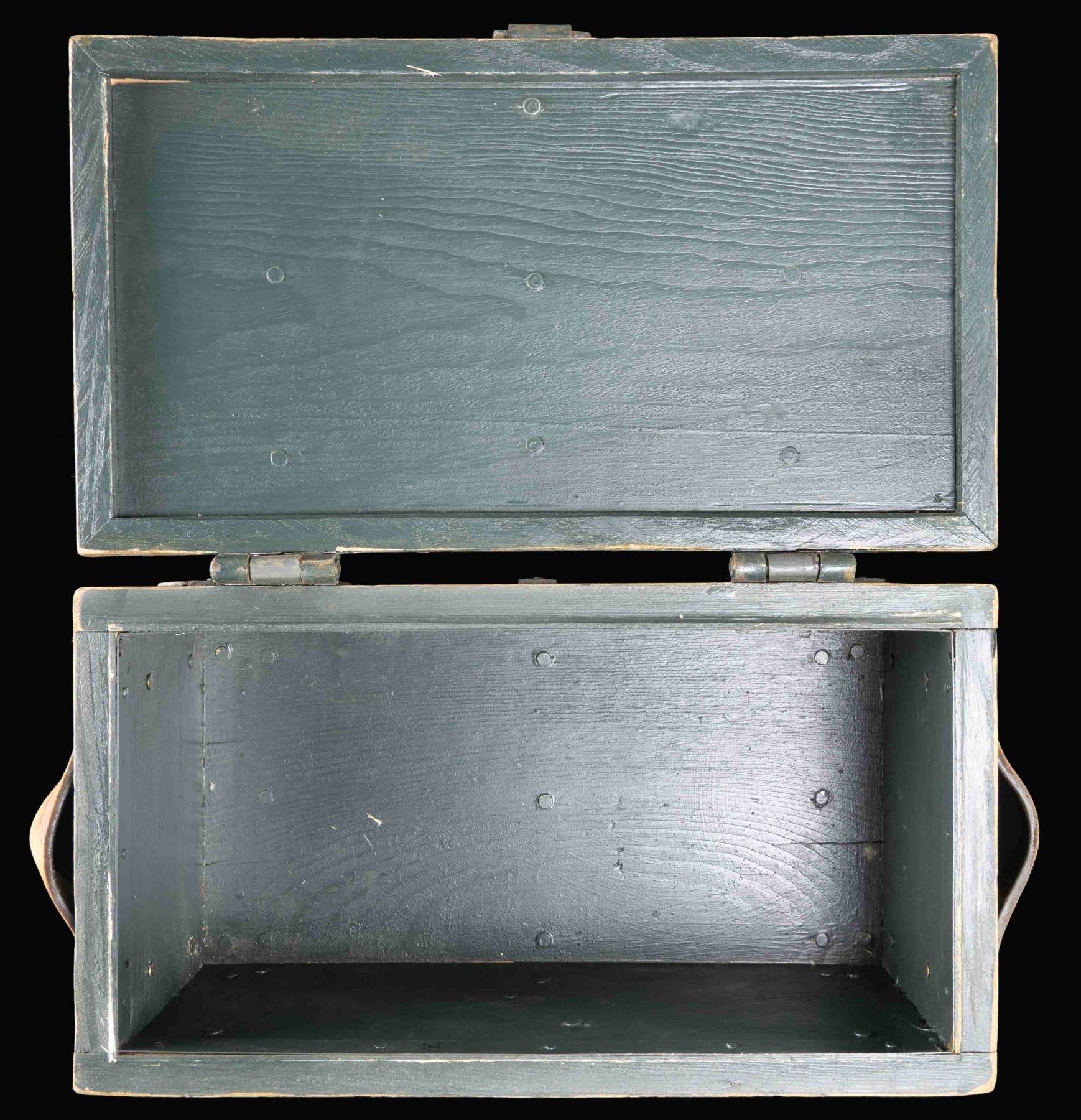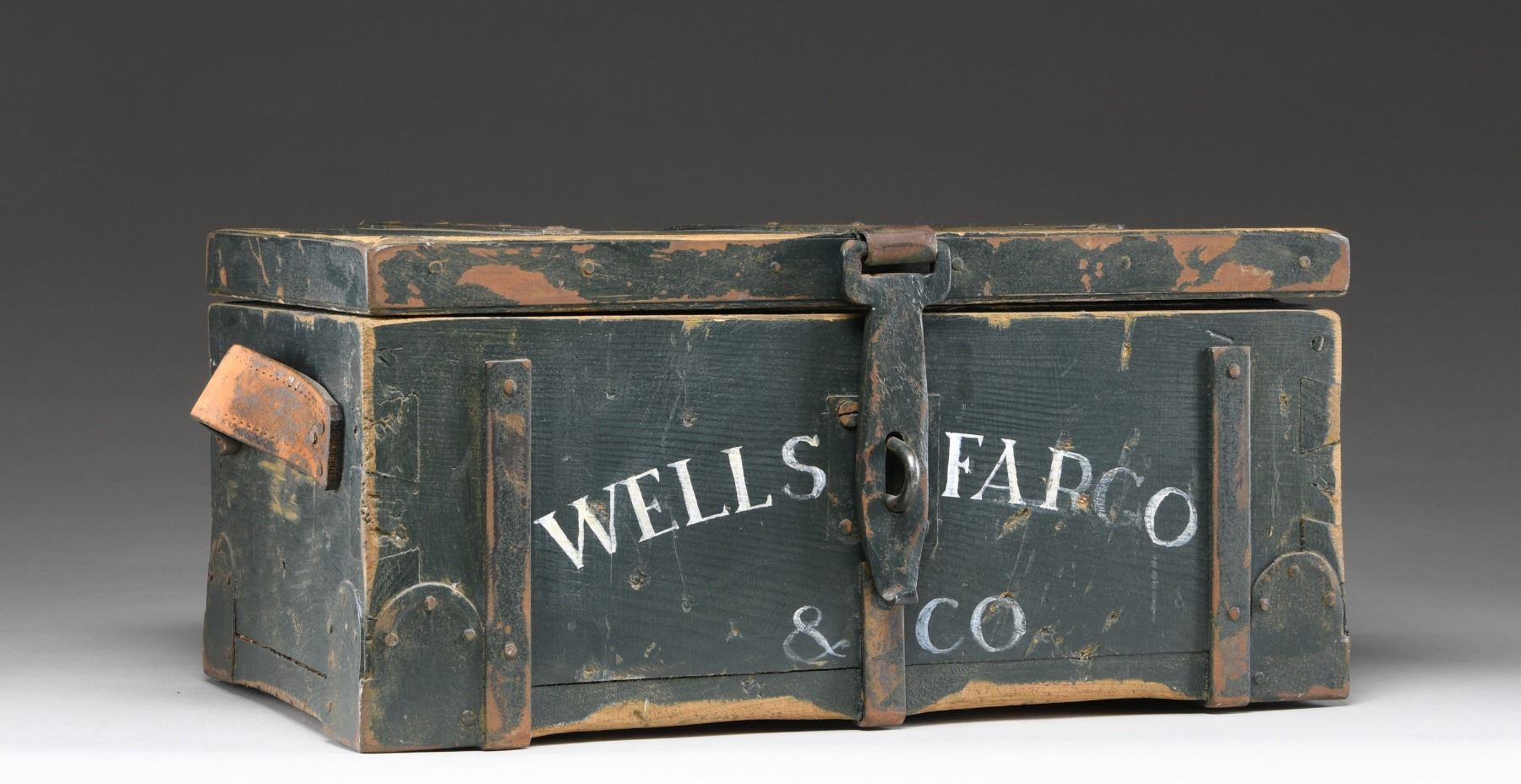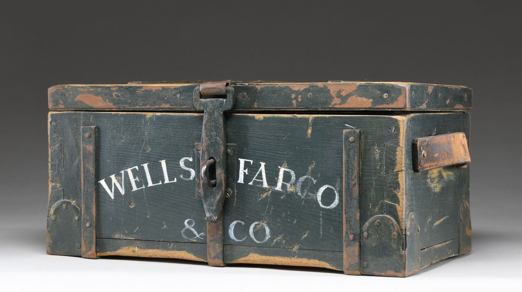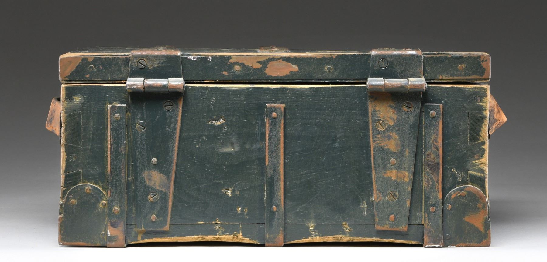 This strongbox measures 18" x 10" x 8" high. It is constructed of wood with heavy iron reinforcements, hinges, and hasps. The box is dovetailed construction with a green painted finish. The front has 1" white letters that read "WELLS FARGO & CO". There is a leather strap handle on each end of the box. CONDITION: the strongbox remains very solid but does show wear to the finish, particularly on the edges. PROVENANCE: from the renowned collection of quality sporting arms from Lewis Drake together with inventory of Lewis Drake Associates. (02-23565-39/BF). $500-800.