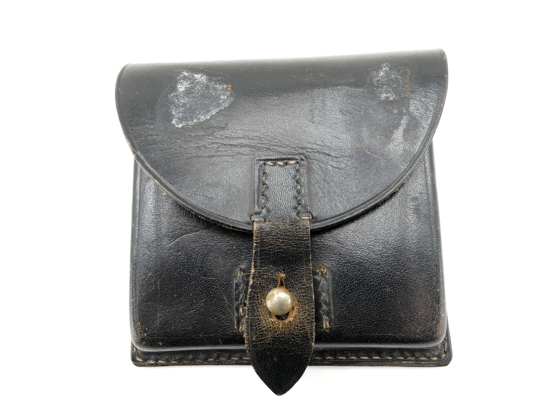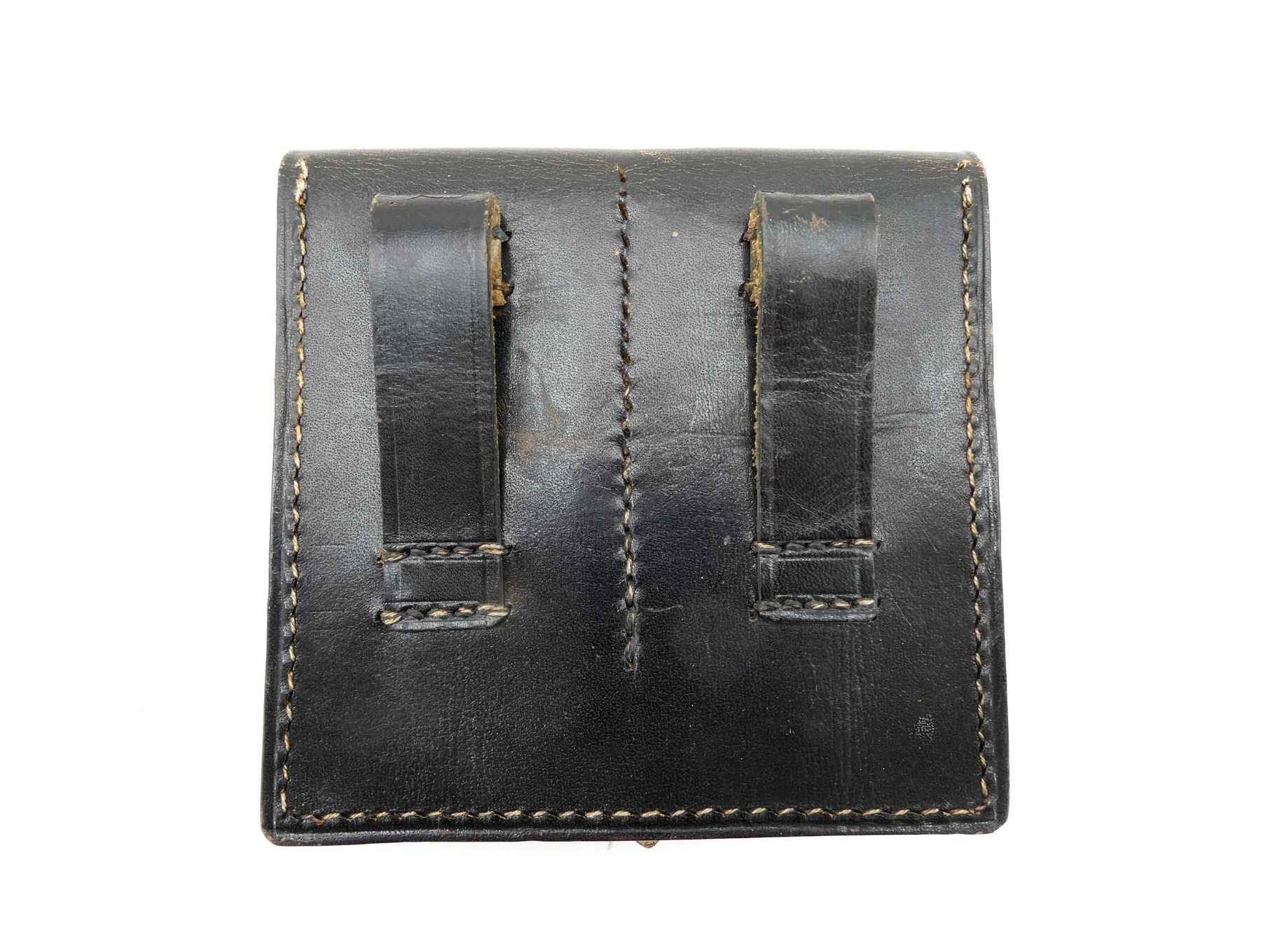 (1) BLACK LEATHER DOUBLE-POCKET MAG POUCH, MARKED: "91", METAL FITTINGS, TWO BELT LOOPS, SHOWS SLIGHT AGE / WEAR. SEE PHOTOS.