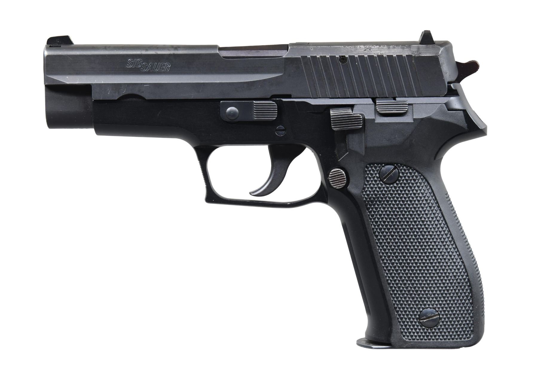Cal. 9mm Para. S# U123723. Mfg. 1985 w/ "JF" Kiel, West German Nitro proofs & Imported by Sigarms Inc. of Tysons Center, VA . Matching numbered 4.4". Matte black steel slide with white dot & bar sight set. Black alloy receiver w/ black plastic grips. MAGS: 2 - 15 rd. CONDITION: very good overall with areas of cleaning pitting along top edges of slide on both sides. Very good bore. (25-3242/MD). MODERN. $400-600.