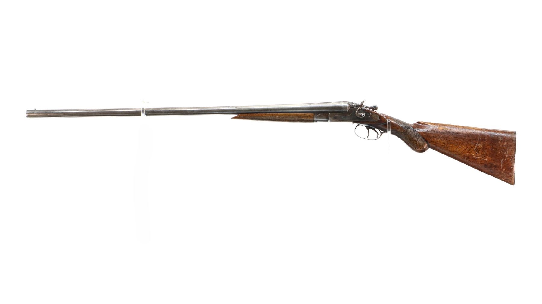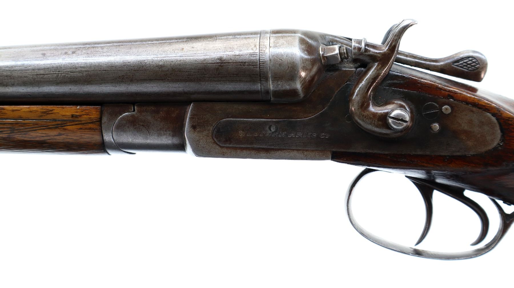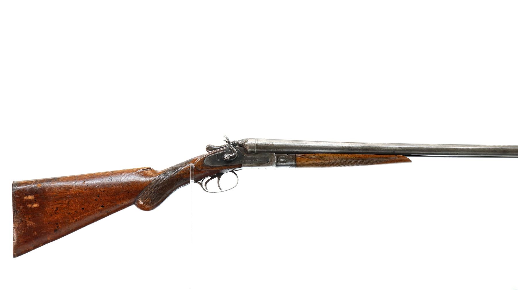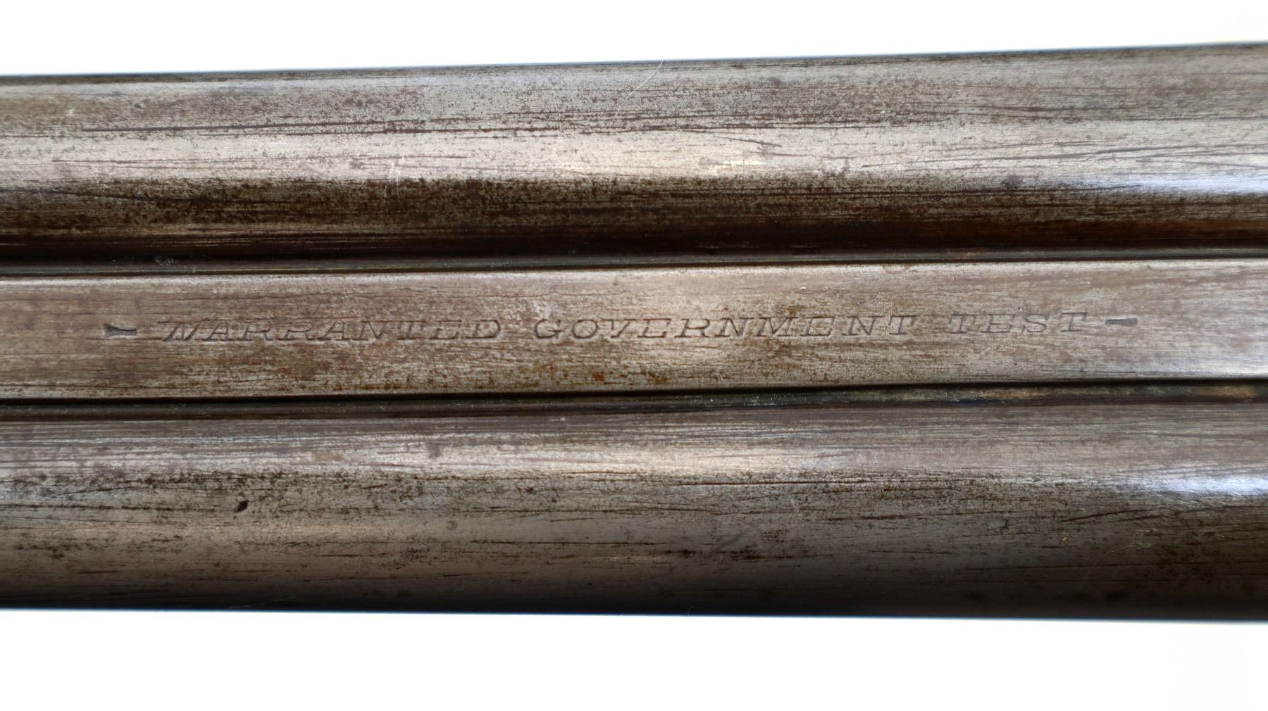 Main Description: Brass bead, Government twist barrels with smooth rib that are loose on face, side locks with checkered spur hammers that function, extractor, double triggers. Two piece wood stocks, checkered forearm and pistol grip chipped and cracked behind receiver and locks, grooved steel butt plate.
