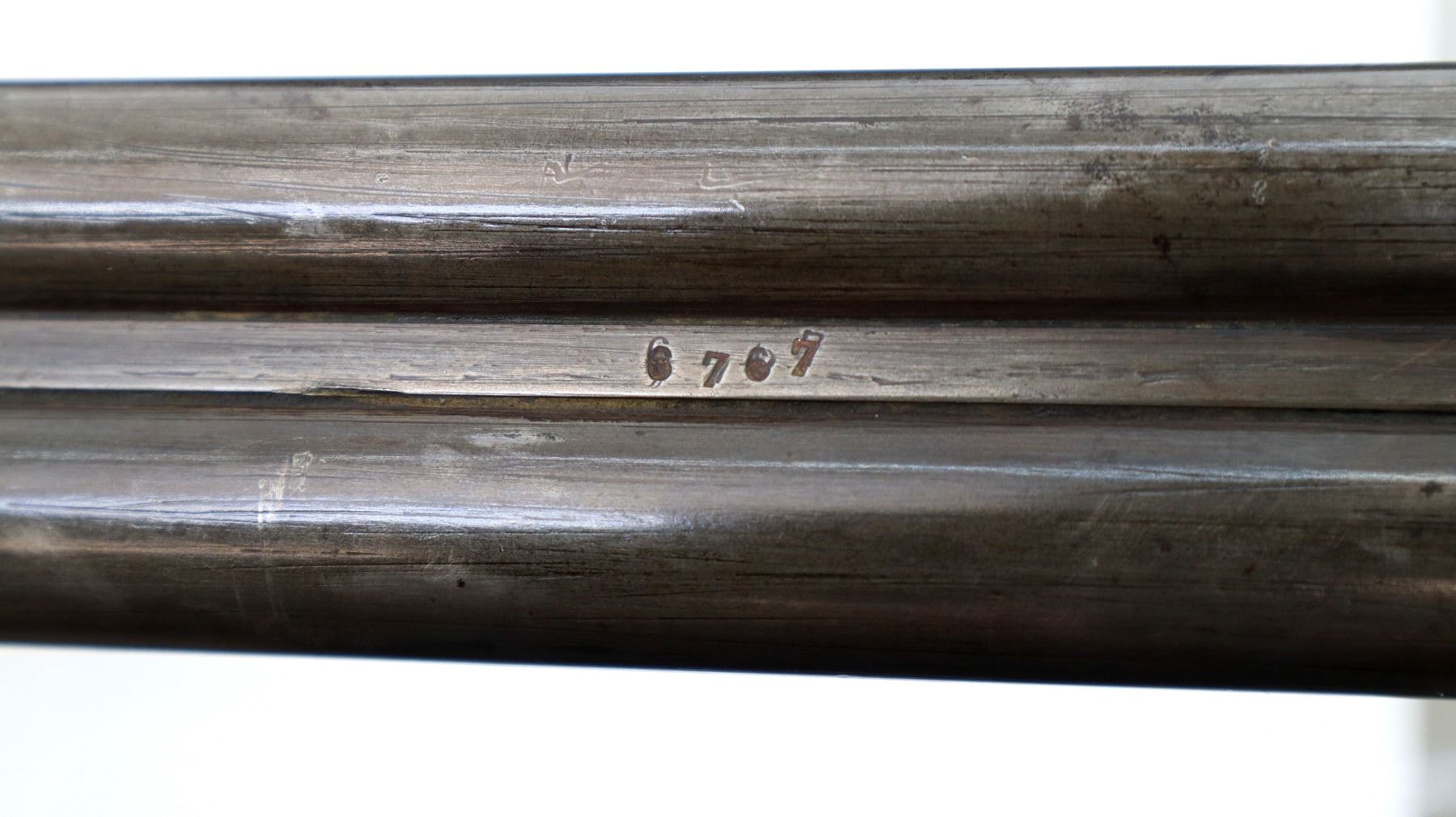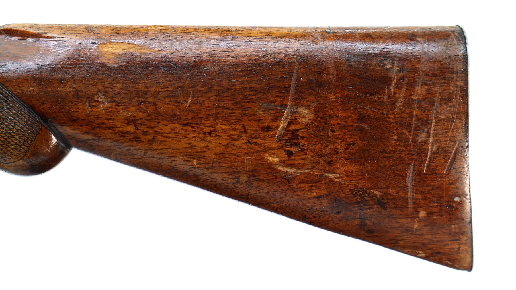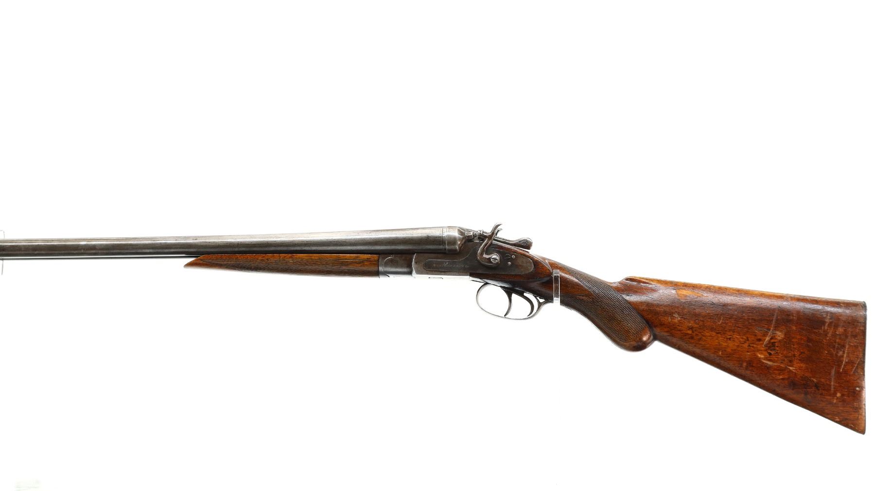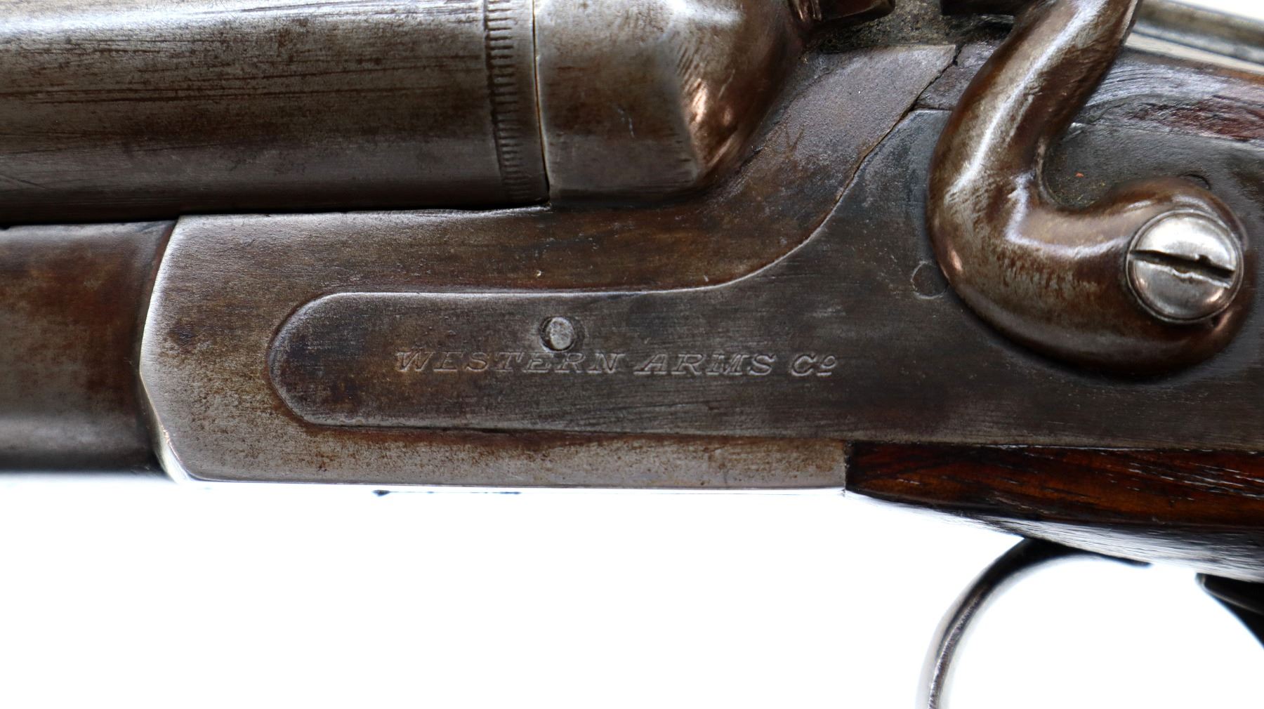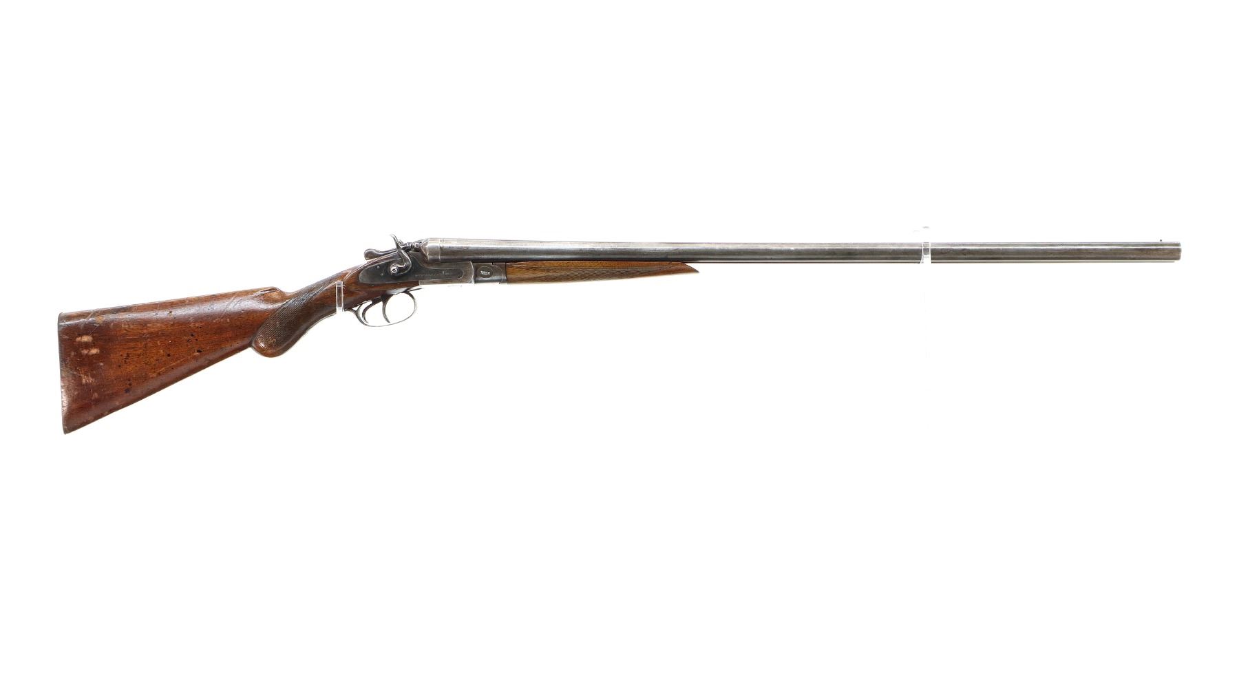 Main Description: Brass bead, Government twist barrels with smooth rib that are loose on face, side locks with checkered spur hammers that function, extractor, double triggers. Two piece wood stocks, checkered forearm and pistol grip chipped and cracked behind receiver and locks, grooved steel butt plate.