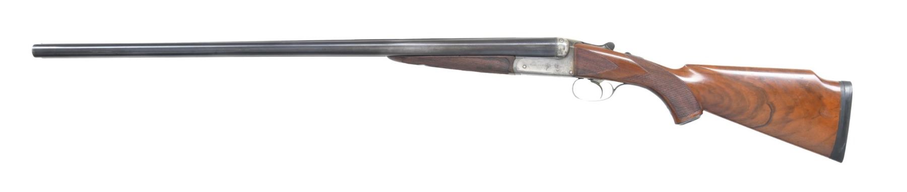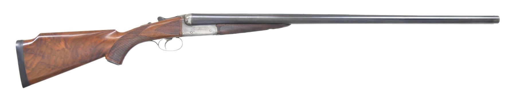 WATERFOWL BOXLOCK SXS SHOTGUN. Cal. 12 GA, 2 3/4". S# T5493. Bbl. 30" of fluid steel with 1 1/2 oz. nitro proofs. Brass bead front bead with broken ivory mid bead. Case colored boxlock action has double under lug and crossbolt locking. Single selective trigger. Selective ejectors. Non-automatic safety. Ebony tipped splinter forearm with borderless hand checkering. Steel capped pistol grip Monte Carlo replacement stock of nicely grained walnut. Point pattern hand checkering with additional checkering on ears. Left side of stock has oval stamp near buttplate "WESTLEY/ LONDON/ RICHARDS". LOP: 14 1/4" over a Decelerator pad. DAC: 1 9/16". DAMC: 1 7/8". DAH: 2 9/16". Stock has approx. 1/4" cast off. Bore Diameter: RT: .743, LT: .744. Choke Constriction: RT: .052 (Extra Full), LT: .055 (Extra Full). Minimum Wall Thickness: RT: .033, LT: .028. Weight: 8lbs. 06oz. CONDITION: bbls. retain 70% thinning blue showing spots of corrosion. Receiver has 40% lightly visible case colors. Blued floorplate and trigger guard show carry wear with scattered scratches and marks. Forearm shows light wear with scattered handling marks having small chips along the left bbl. channel. Stock has lightly worn finish with open grain checks on right side and shows small handling marks. Top lever sits slightly left of center. Good bright bores. (25-1408/DS). CURIO. $600-800.